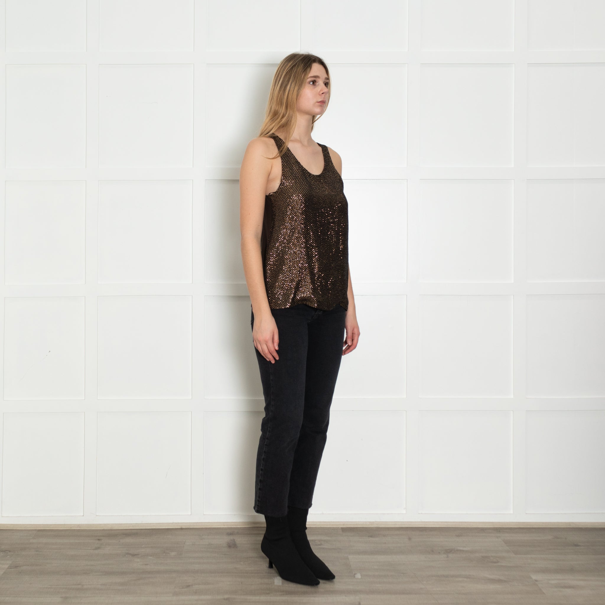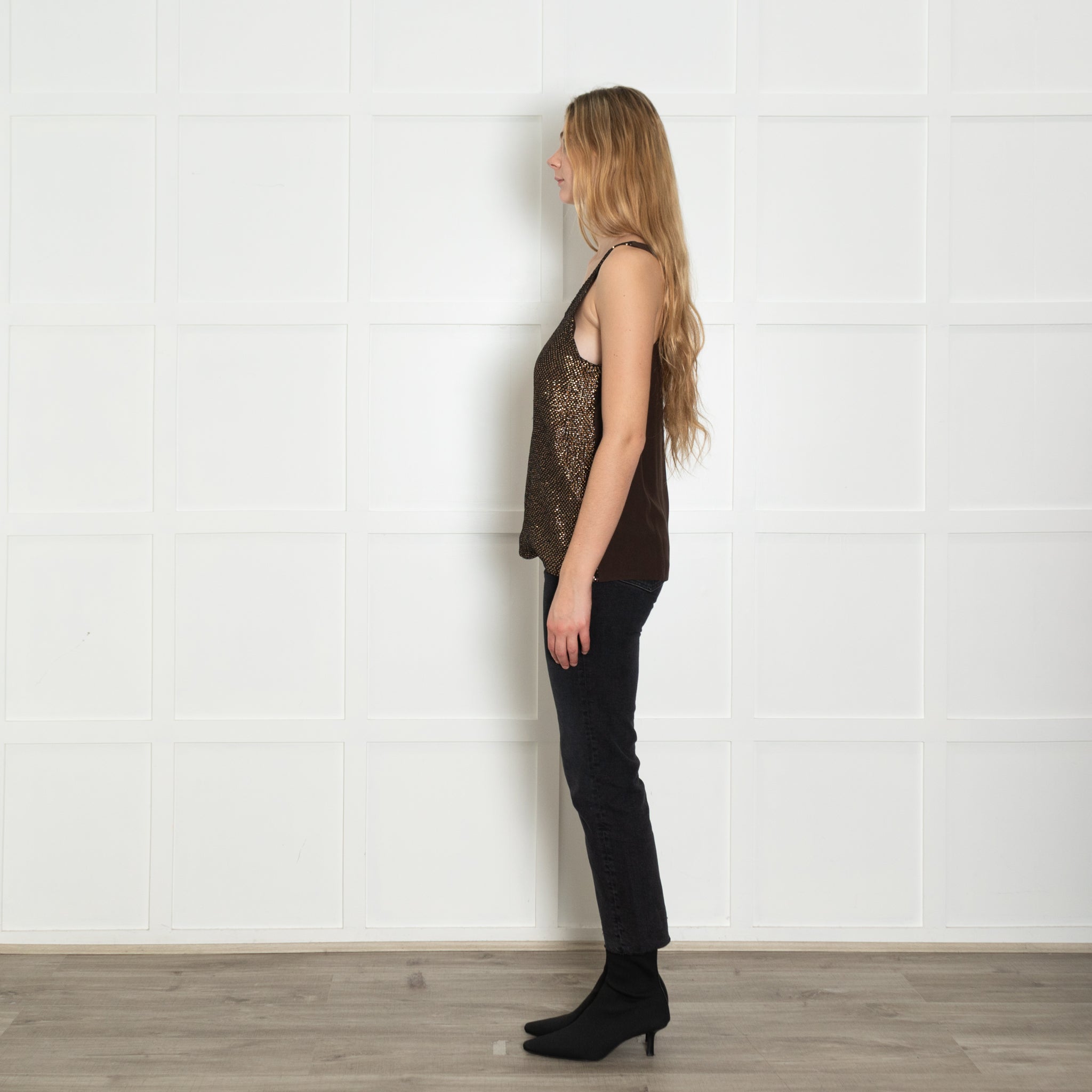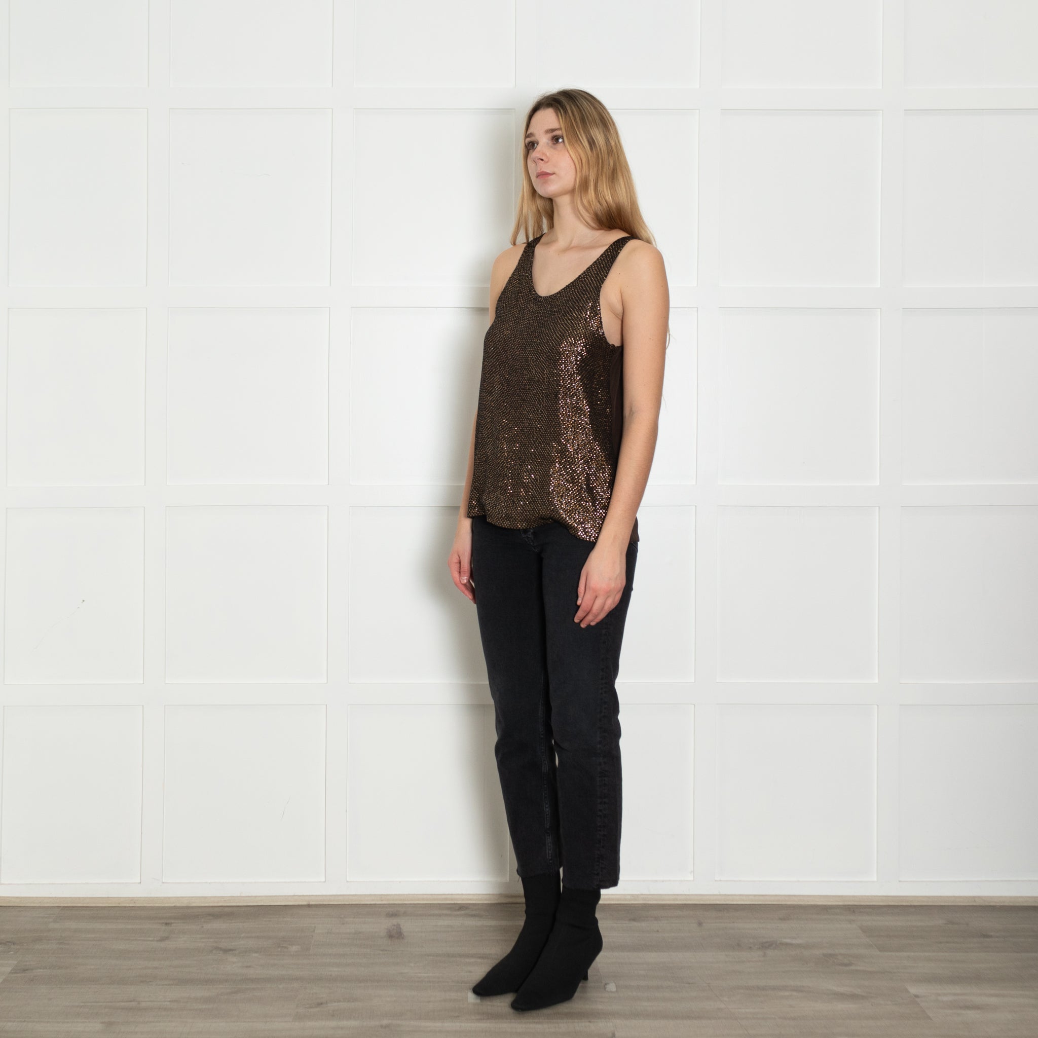 Chloe brown sequin vest top. Rounded neckline. Sequins to the front and block colour to the back.