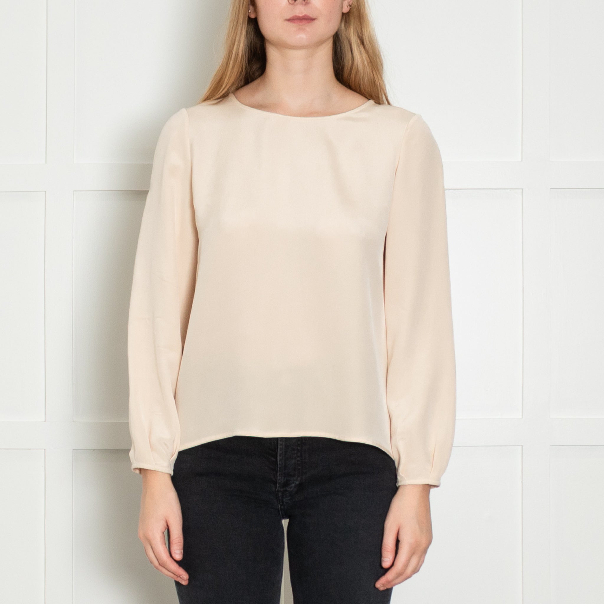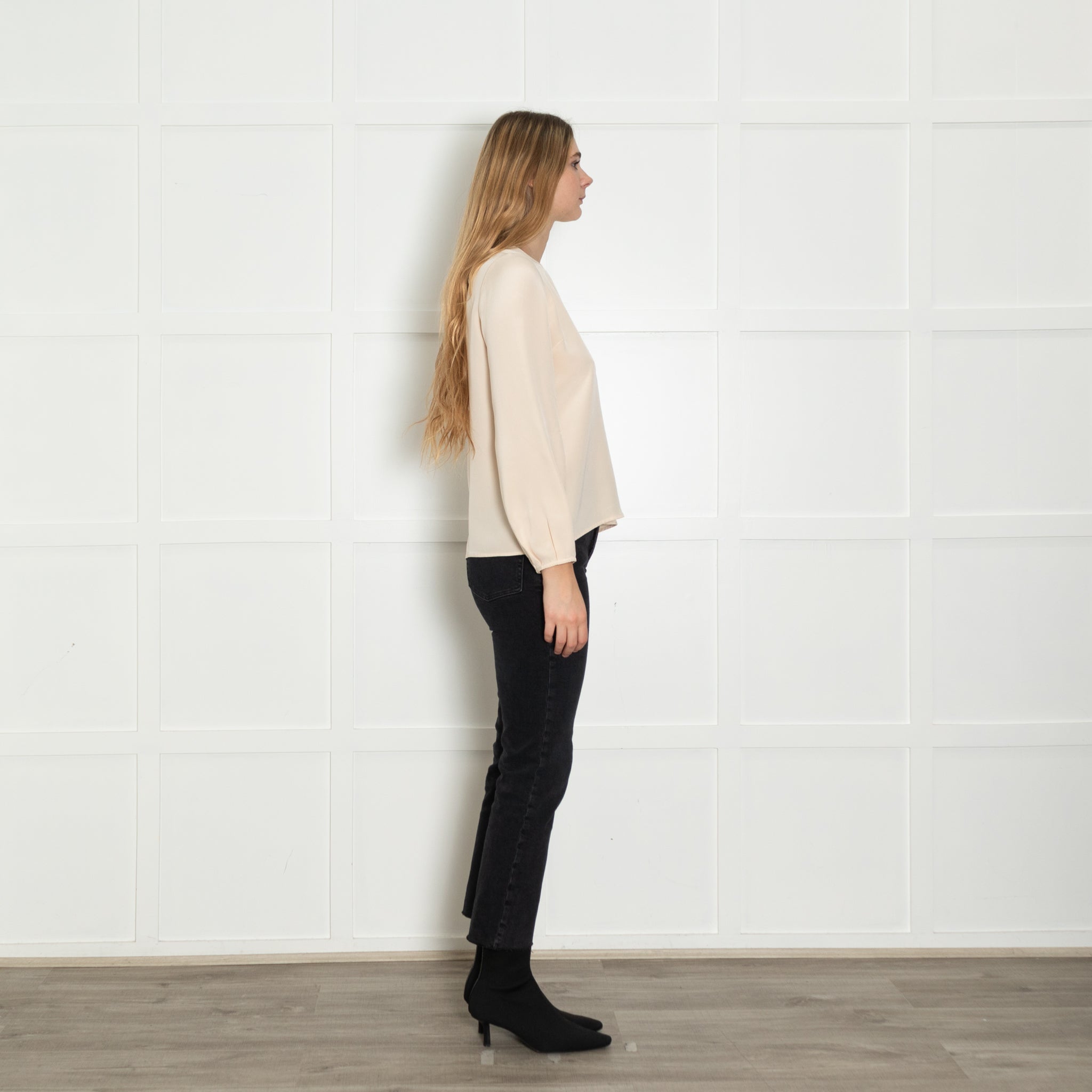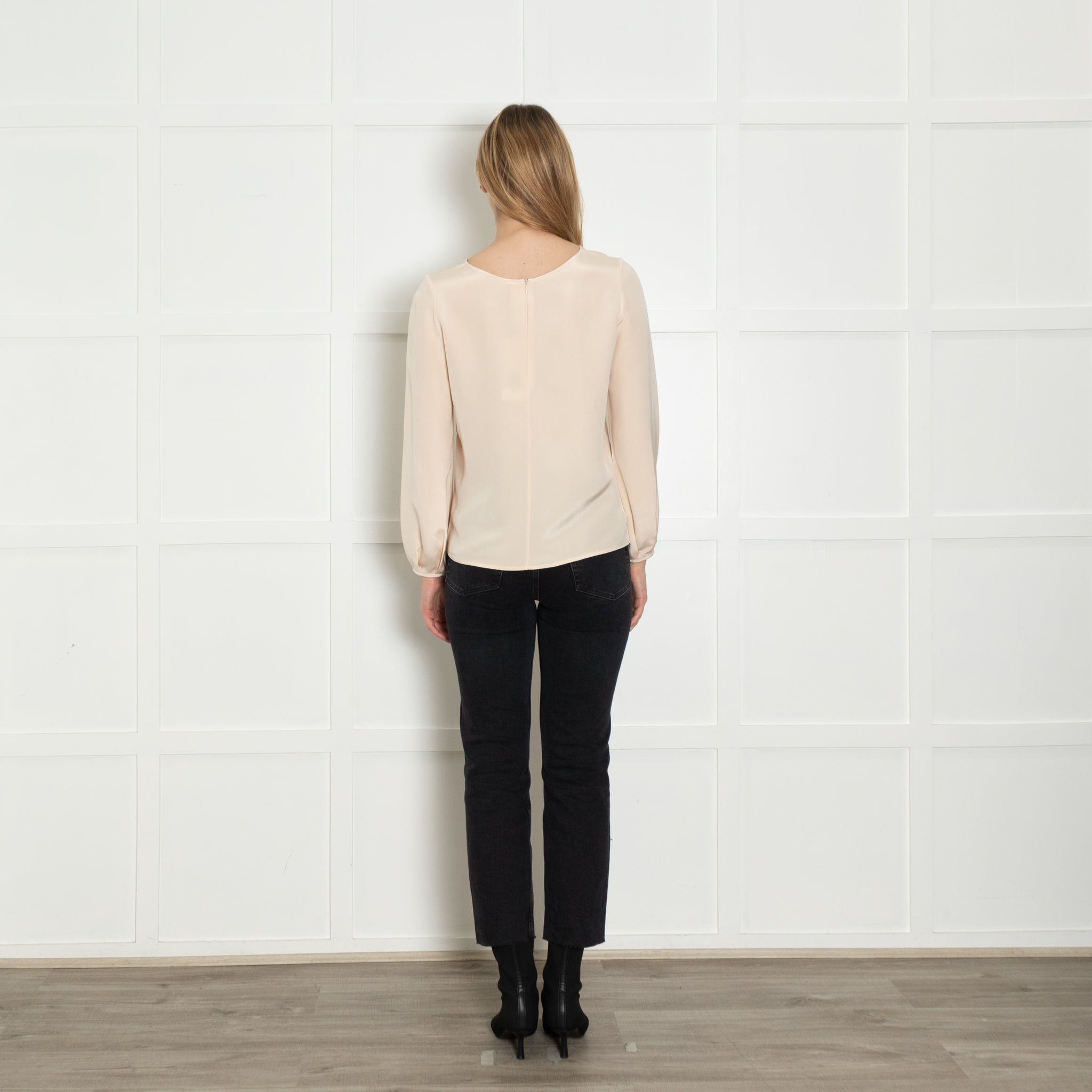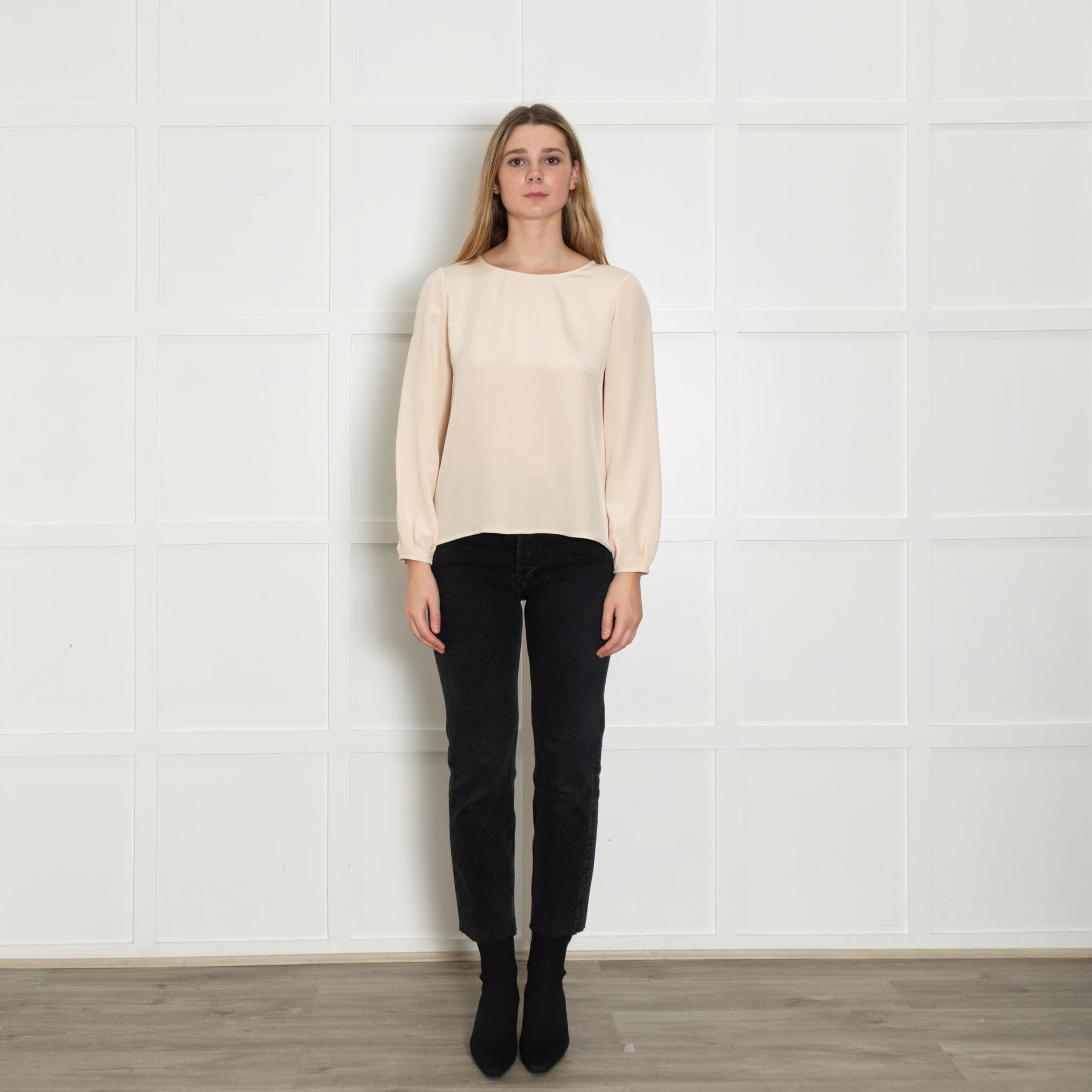 Goat long-sleeve cream blouse, crafted entirely with stunning silk fabric, featuring a rounded neckline, a wide-neckline, with slightly ruffled sleeves, and a single back zipped closure.
