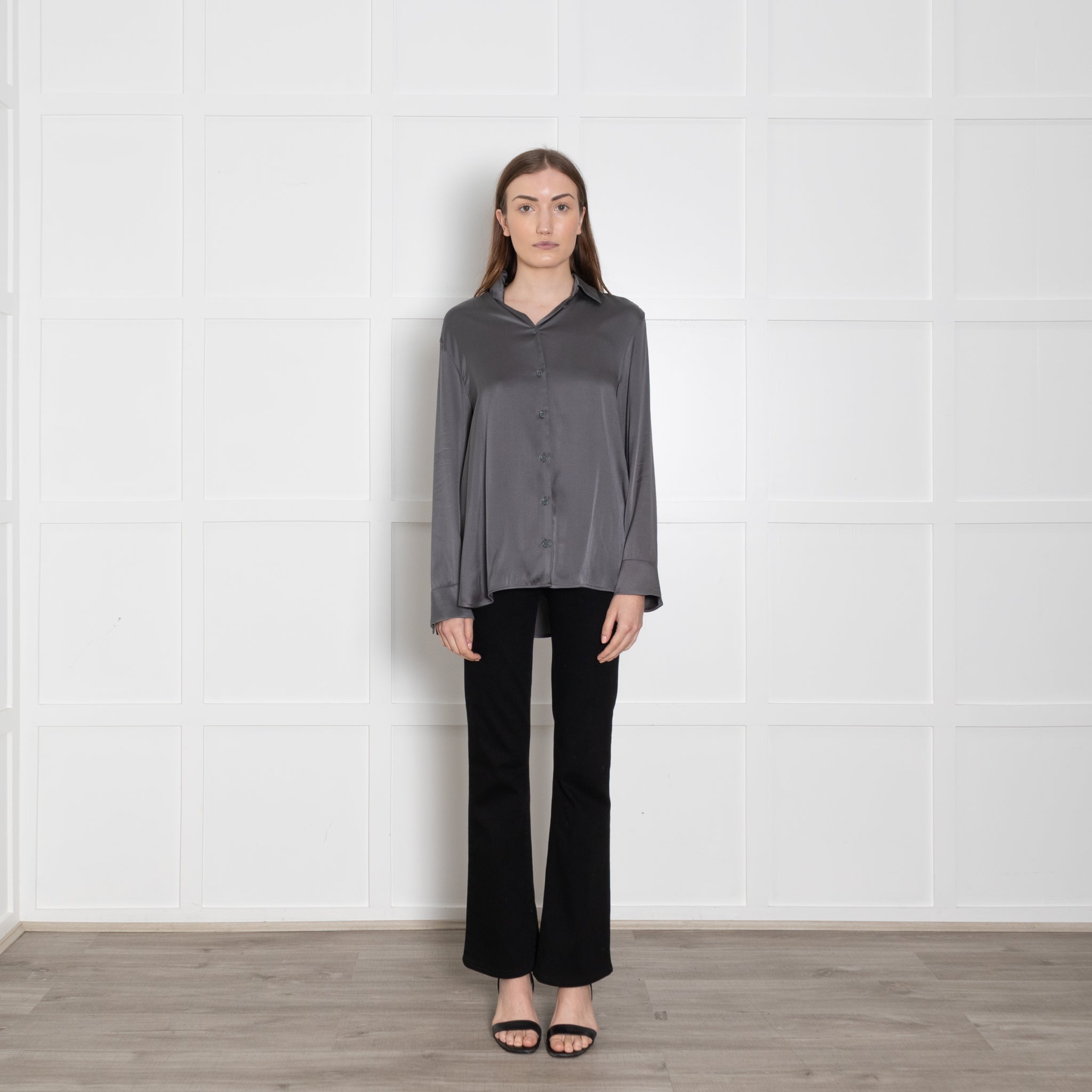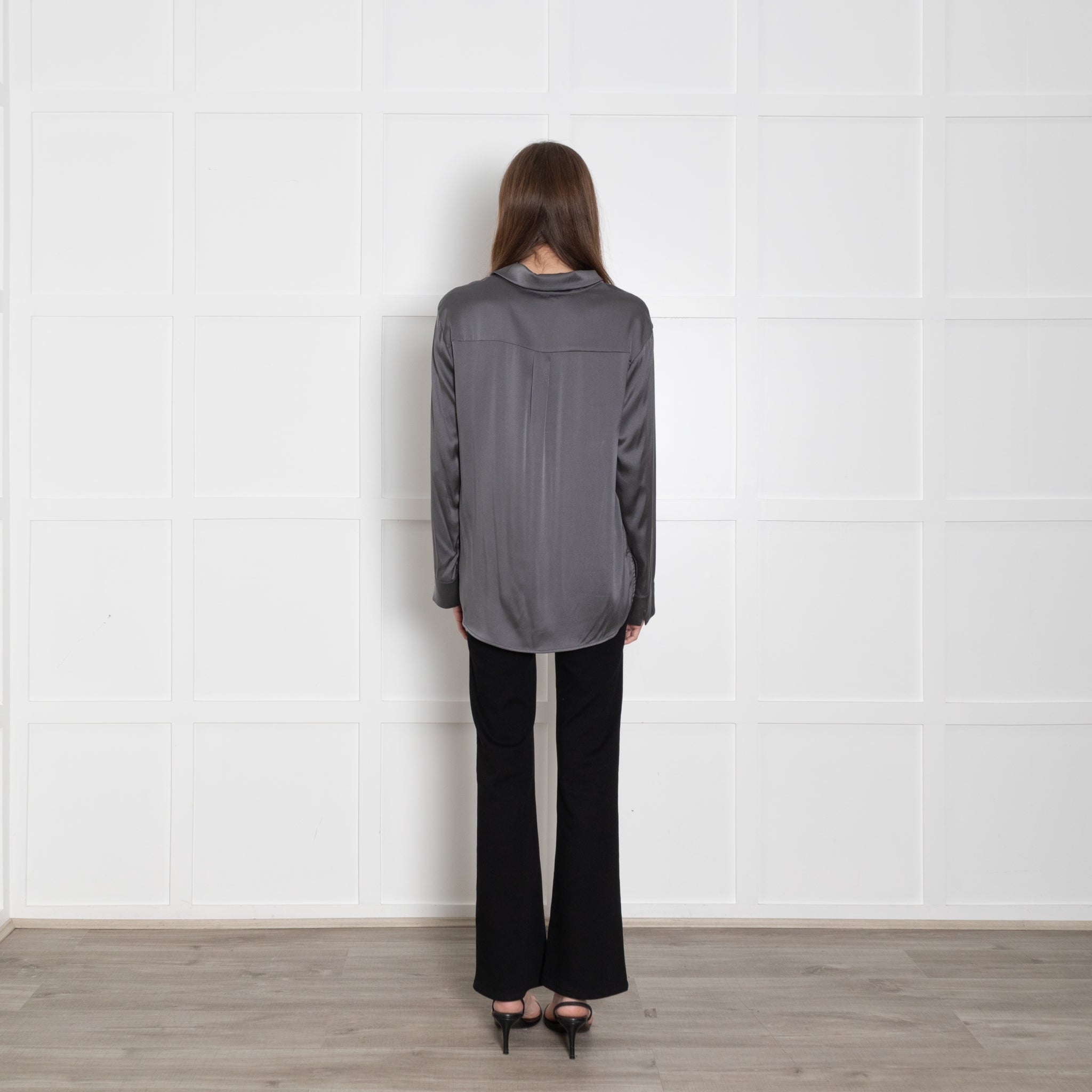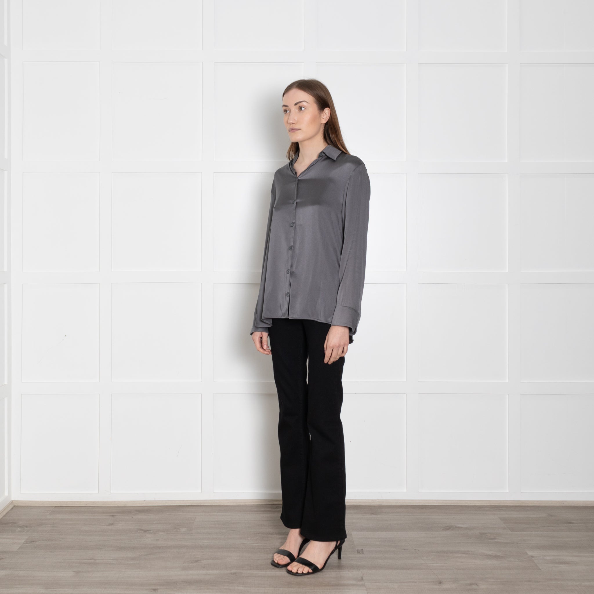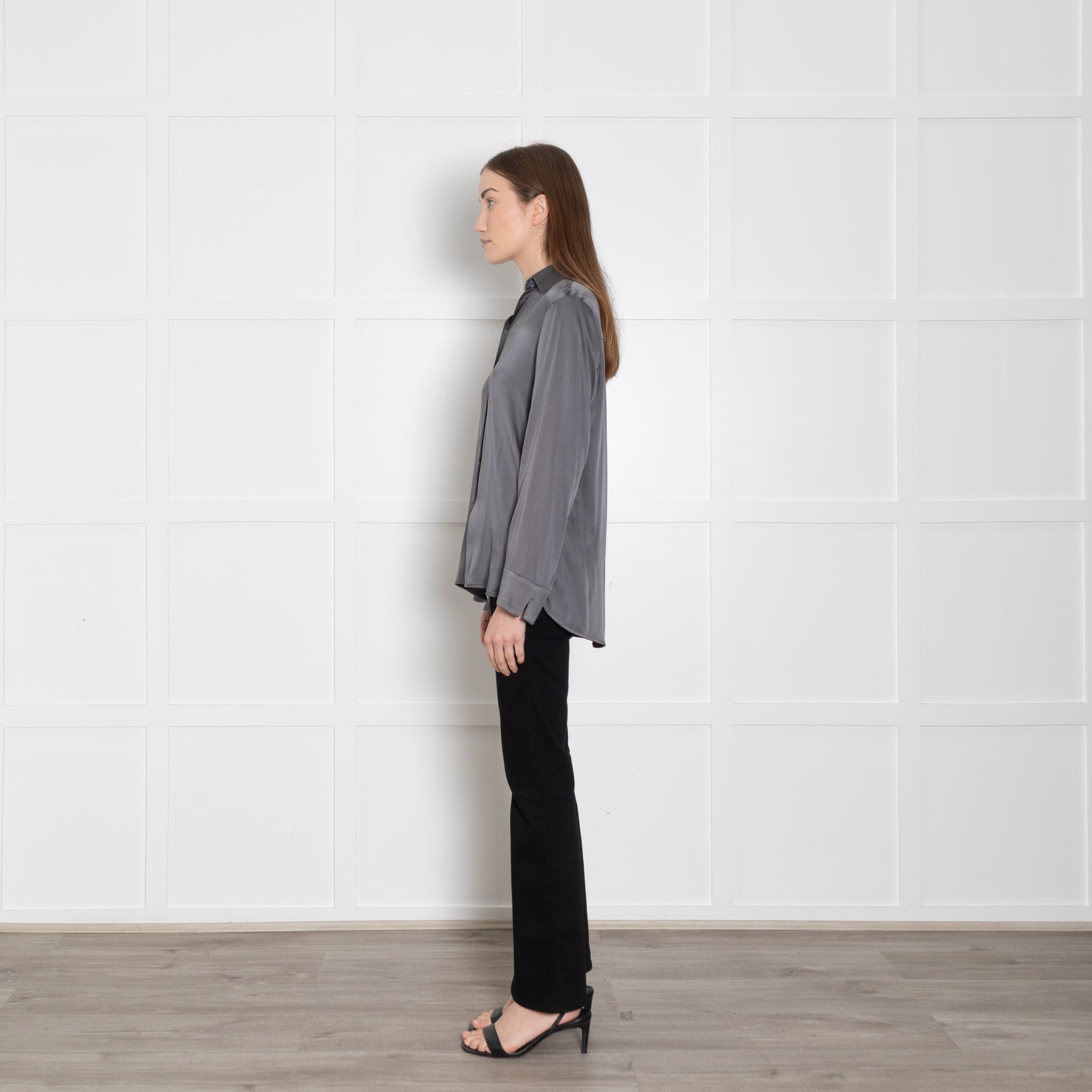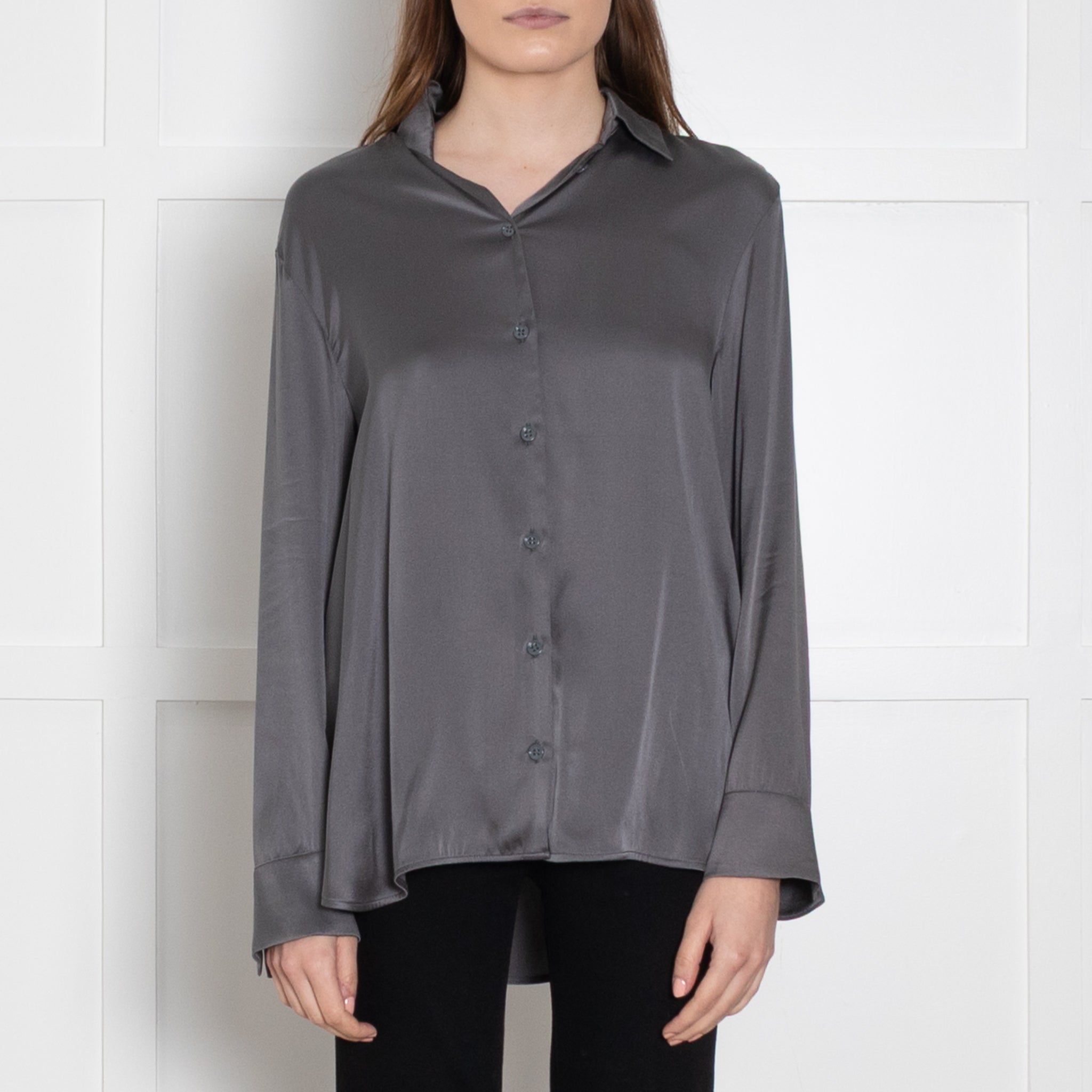 Max Mara long-sleeve leisure grey blouse, crafted from soft silk, featuring a button-up front closure and a classic, elegant neckline collar.