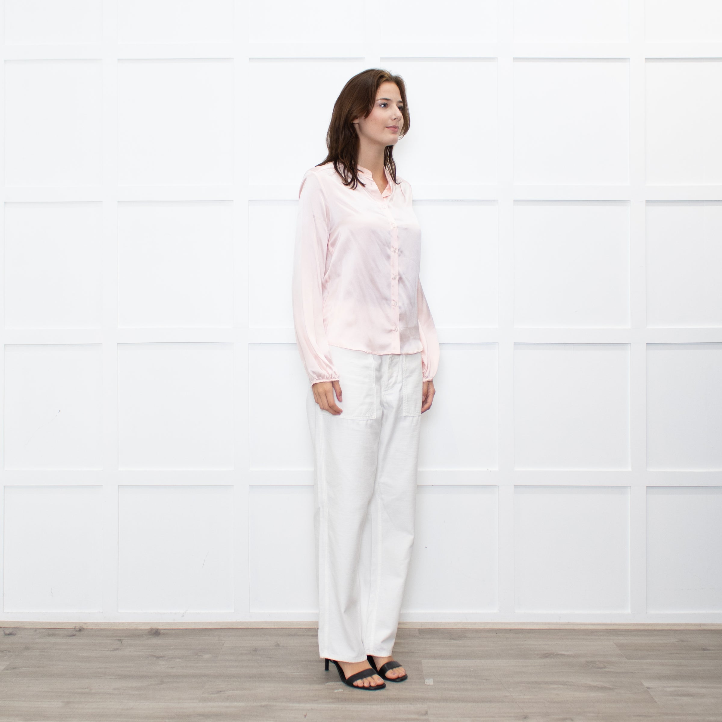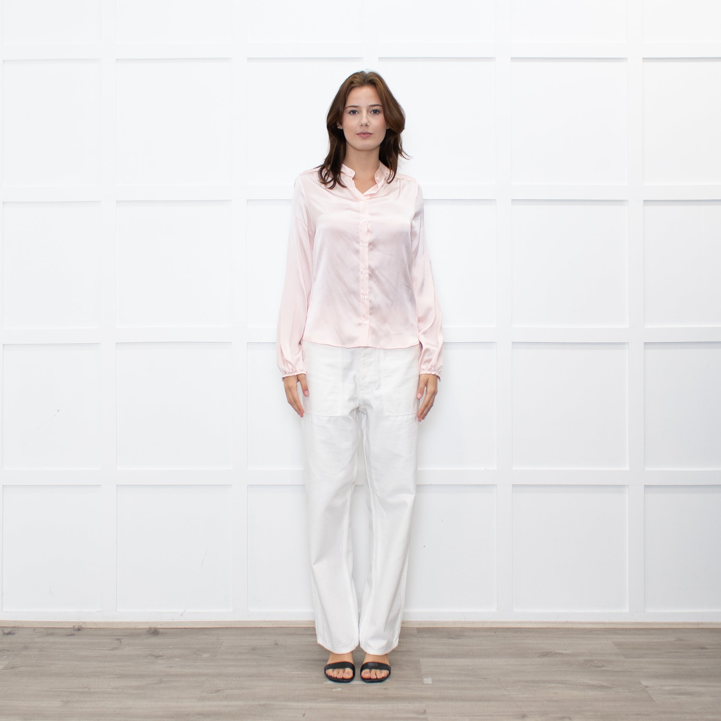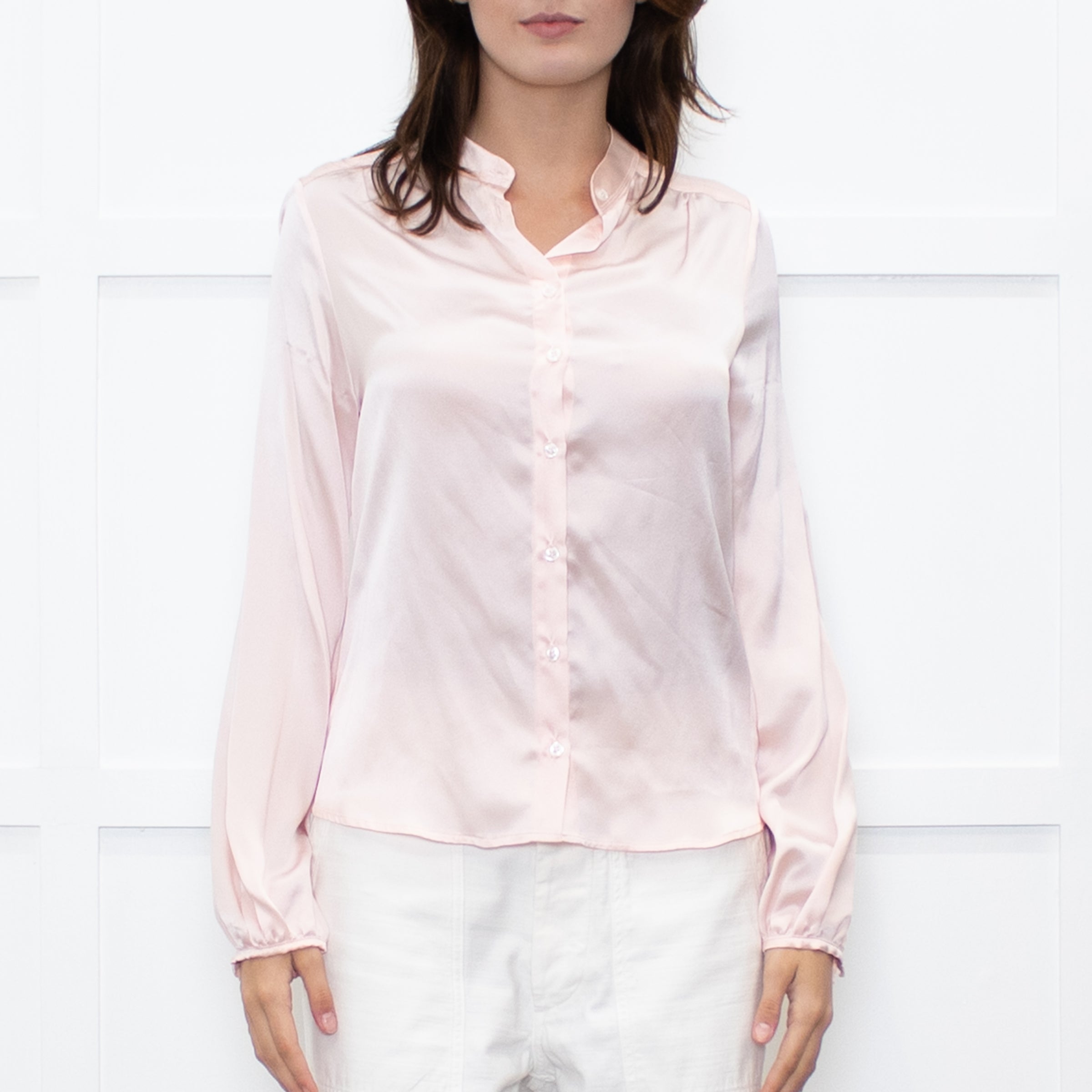 Ridley peach pink silk satin collarless blouse with long sleeves gathered into cuffs, a curved hemline, gathering into the shoulders, and gathering across the back. New with tags.