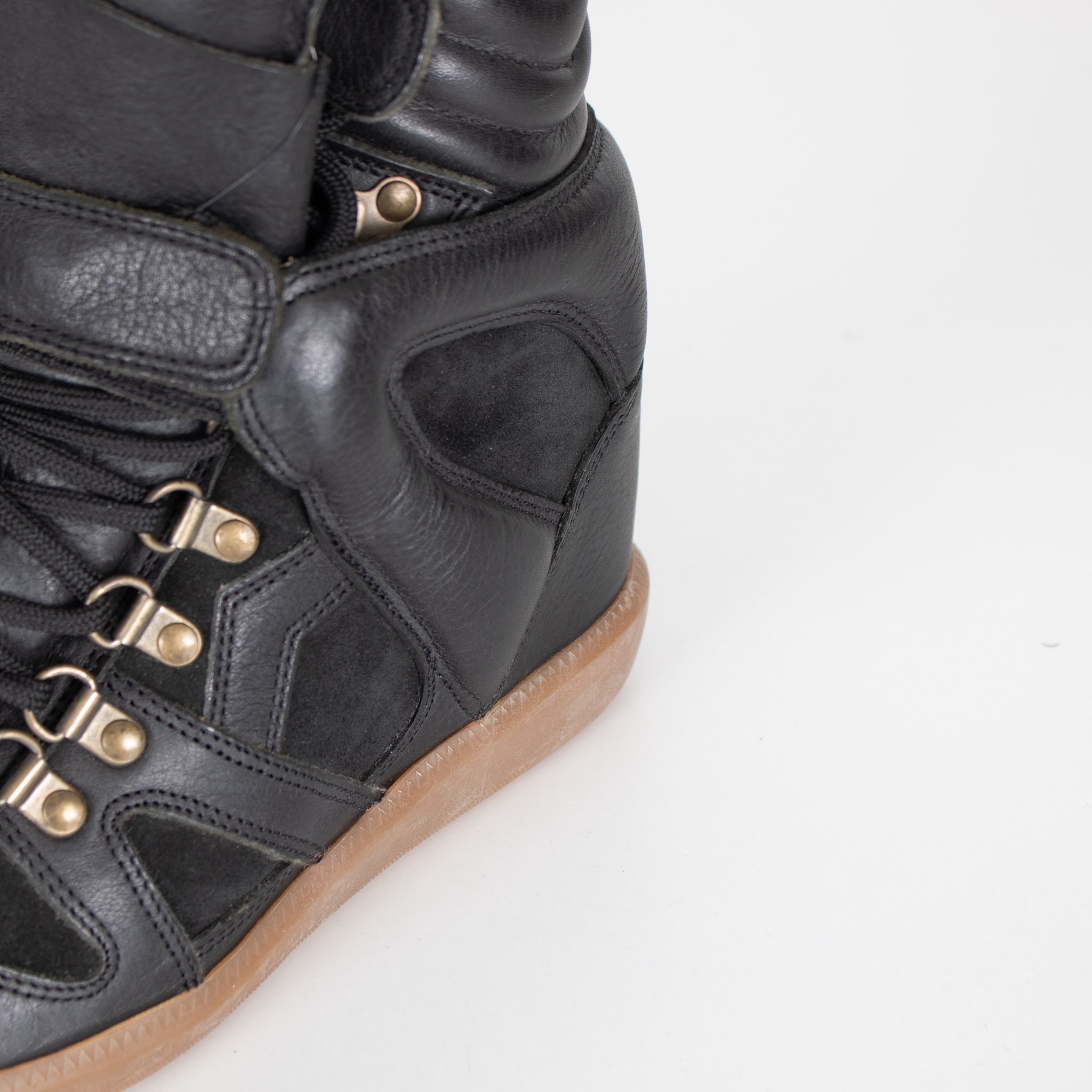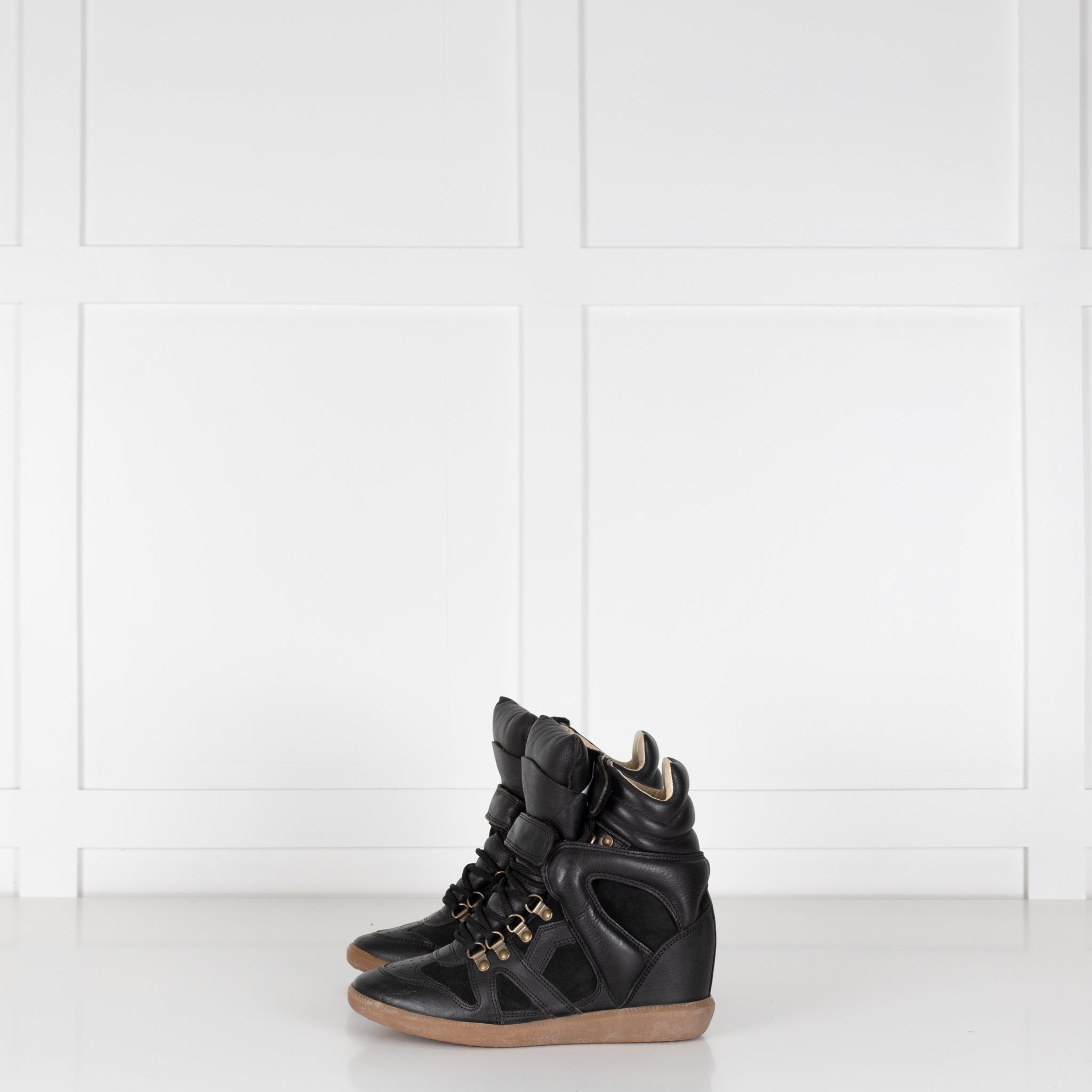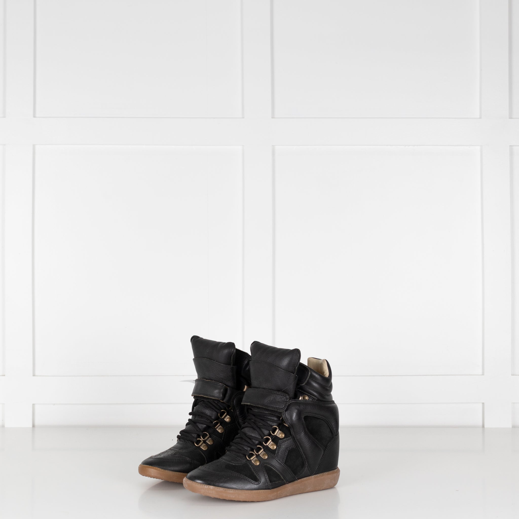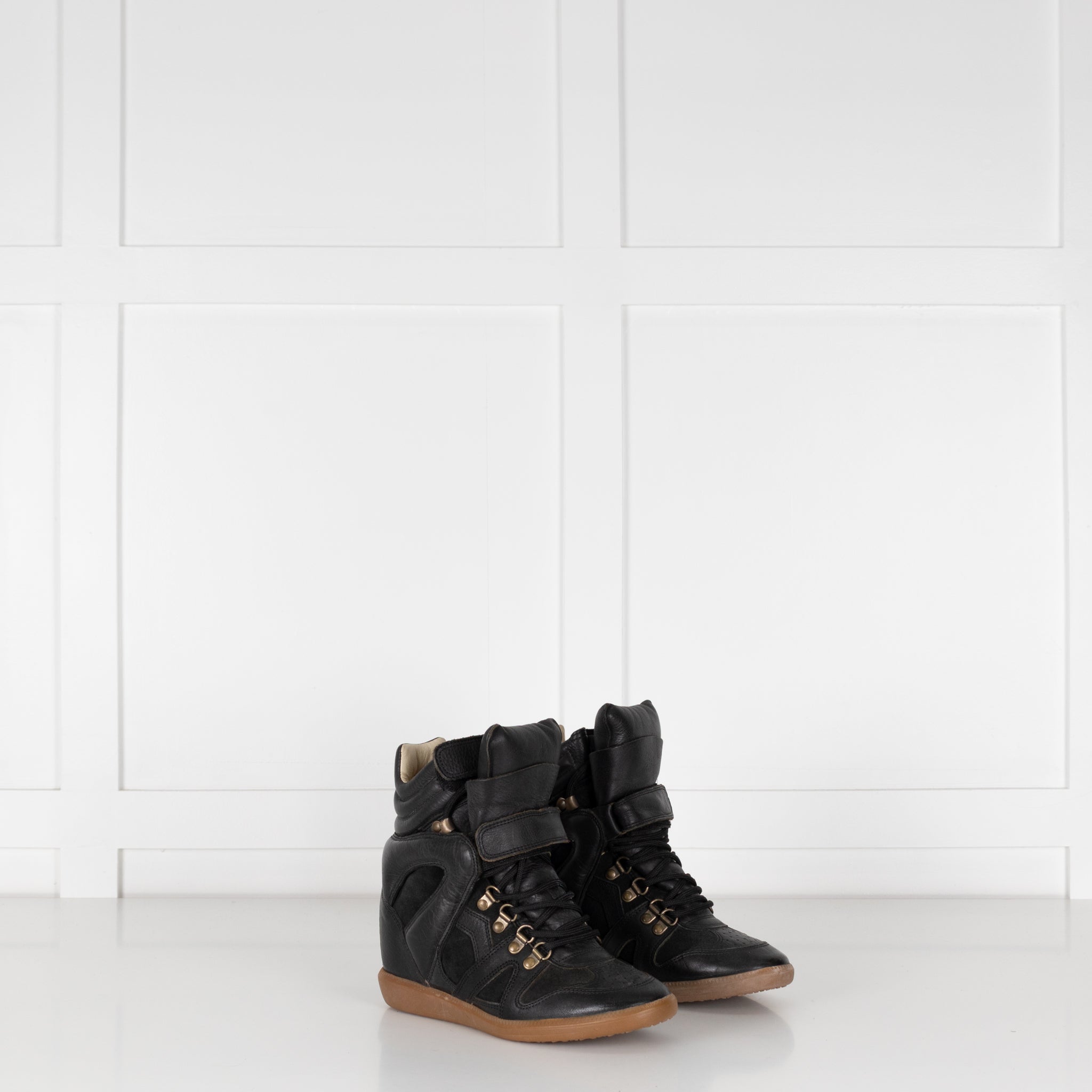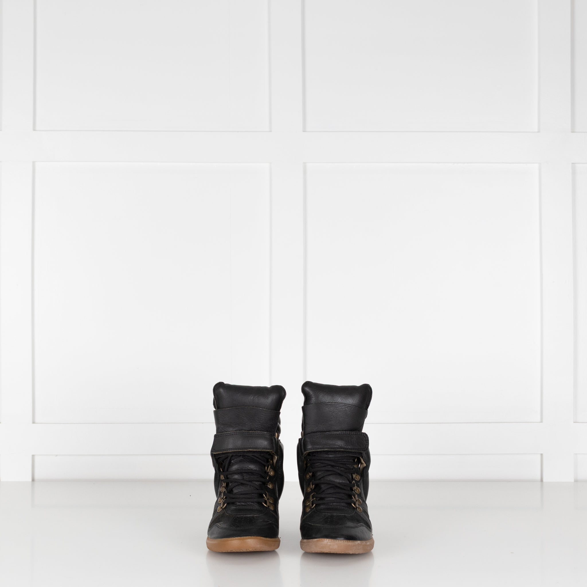 Isabel Marant Etoile Bekett black leather wedge trainers featuring laces, a velcro strap and rubber soles. Heel height approx 5cm. Includes spare red and black laces.