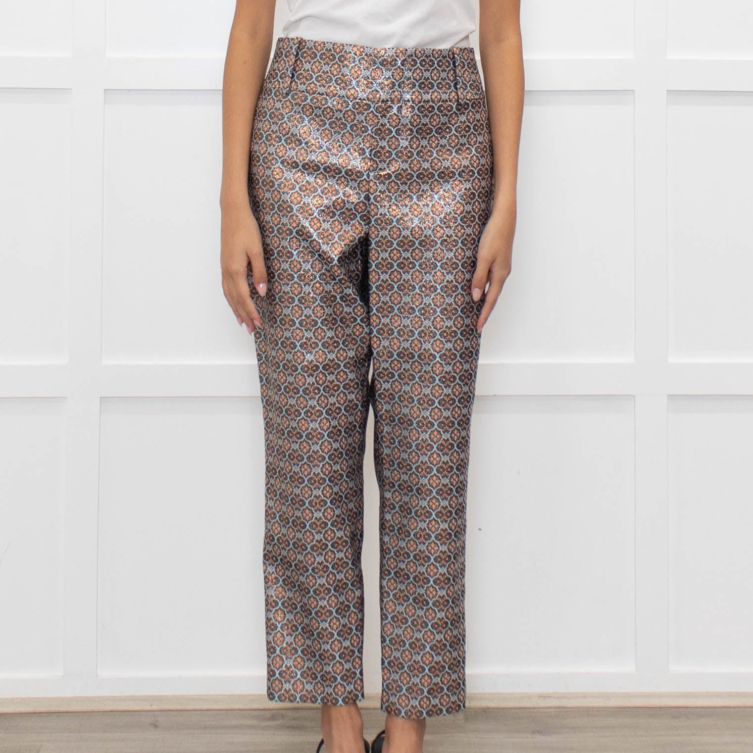 Alice + Olivia Lurex slim cigarette fit with tapered legs, a gorgeous patterned design, and a belt band and front zip.