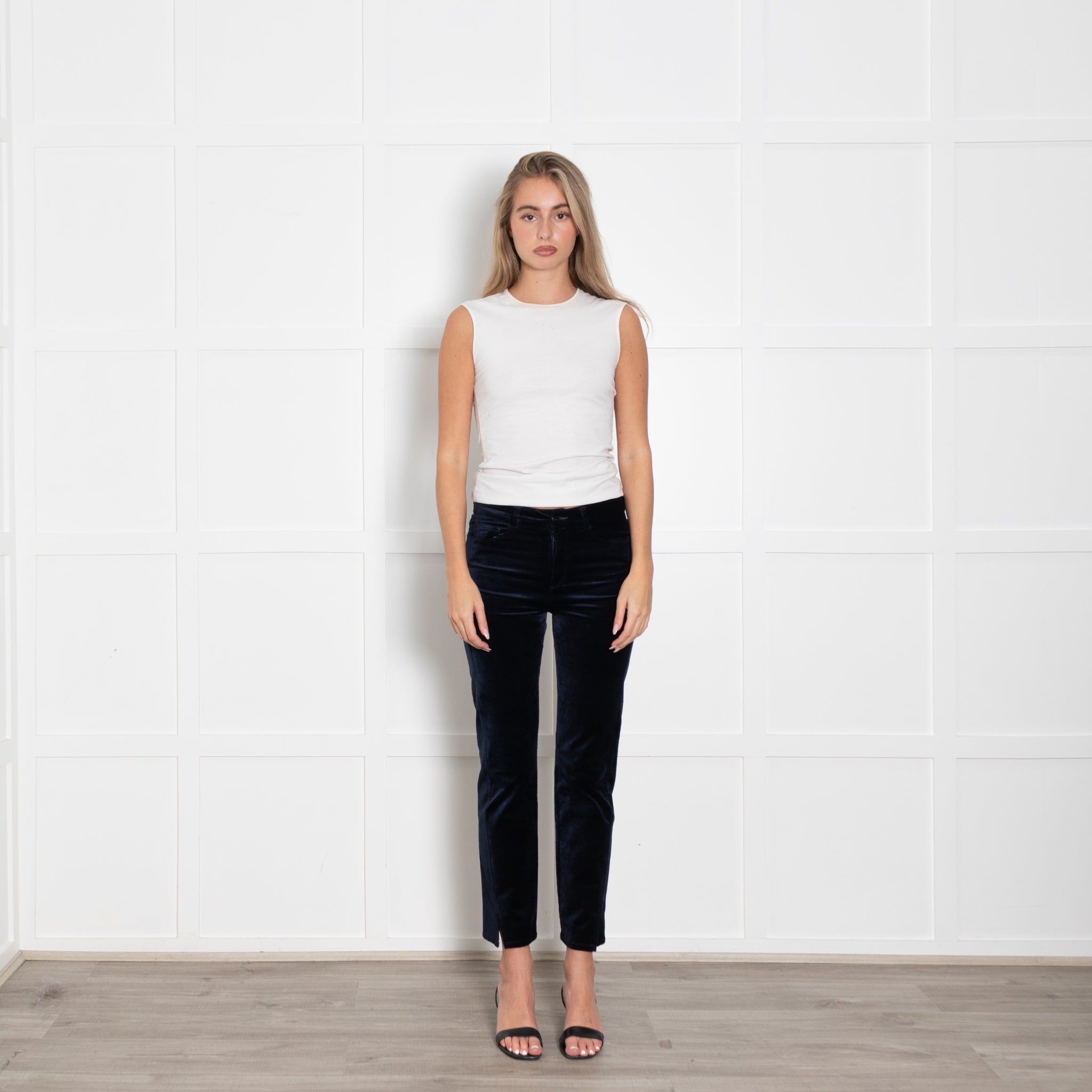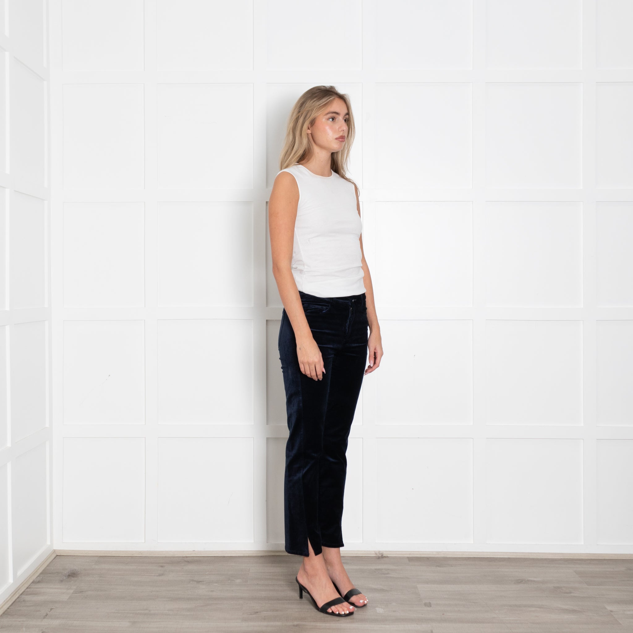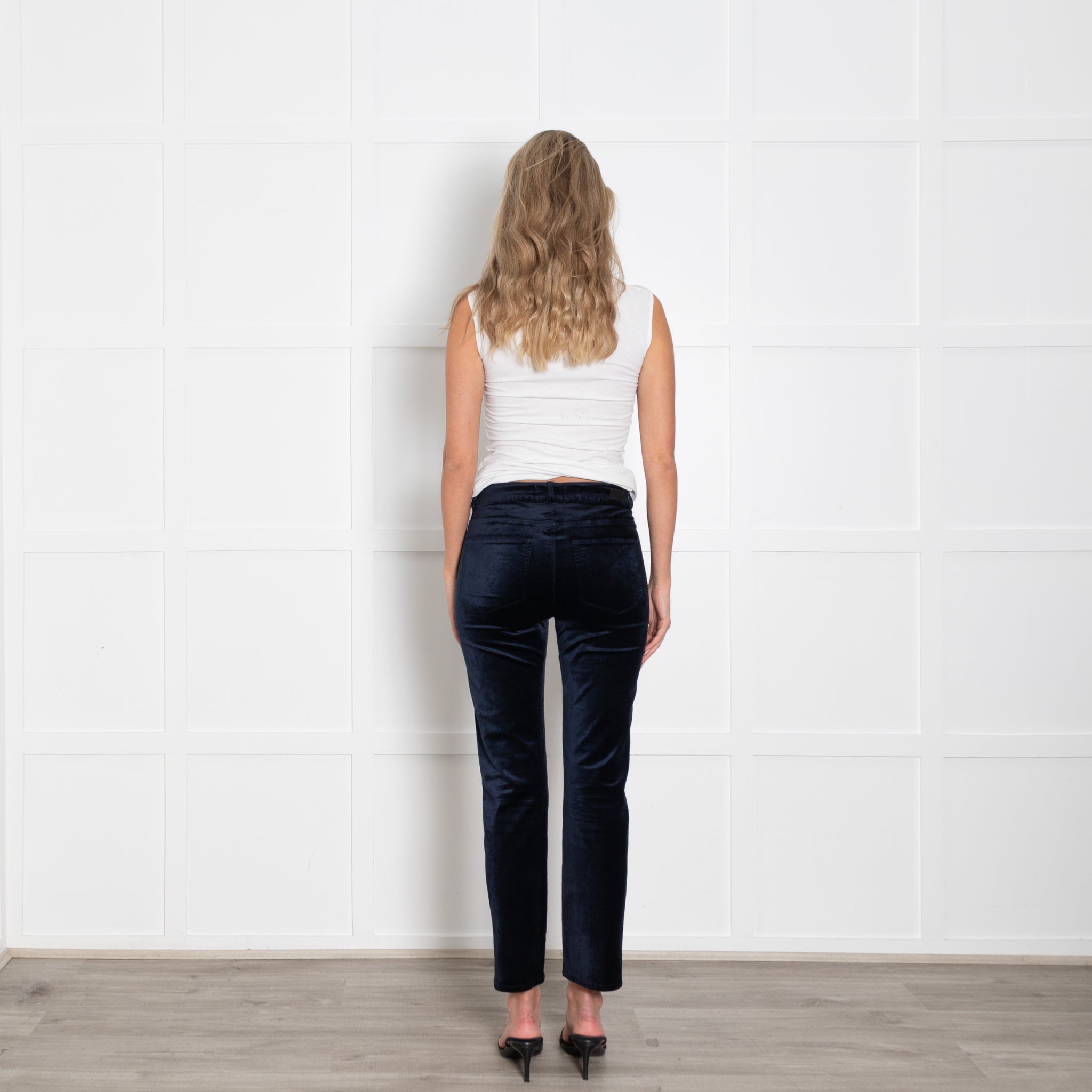 Joseph navy trousers, cafted with a stunning velvet exterior, featuring two front pockets, two back pockets, and a zip-up and front closure.