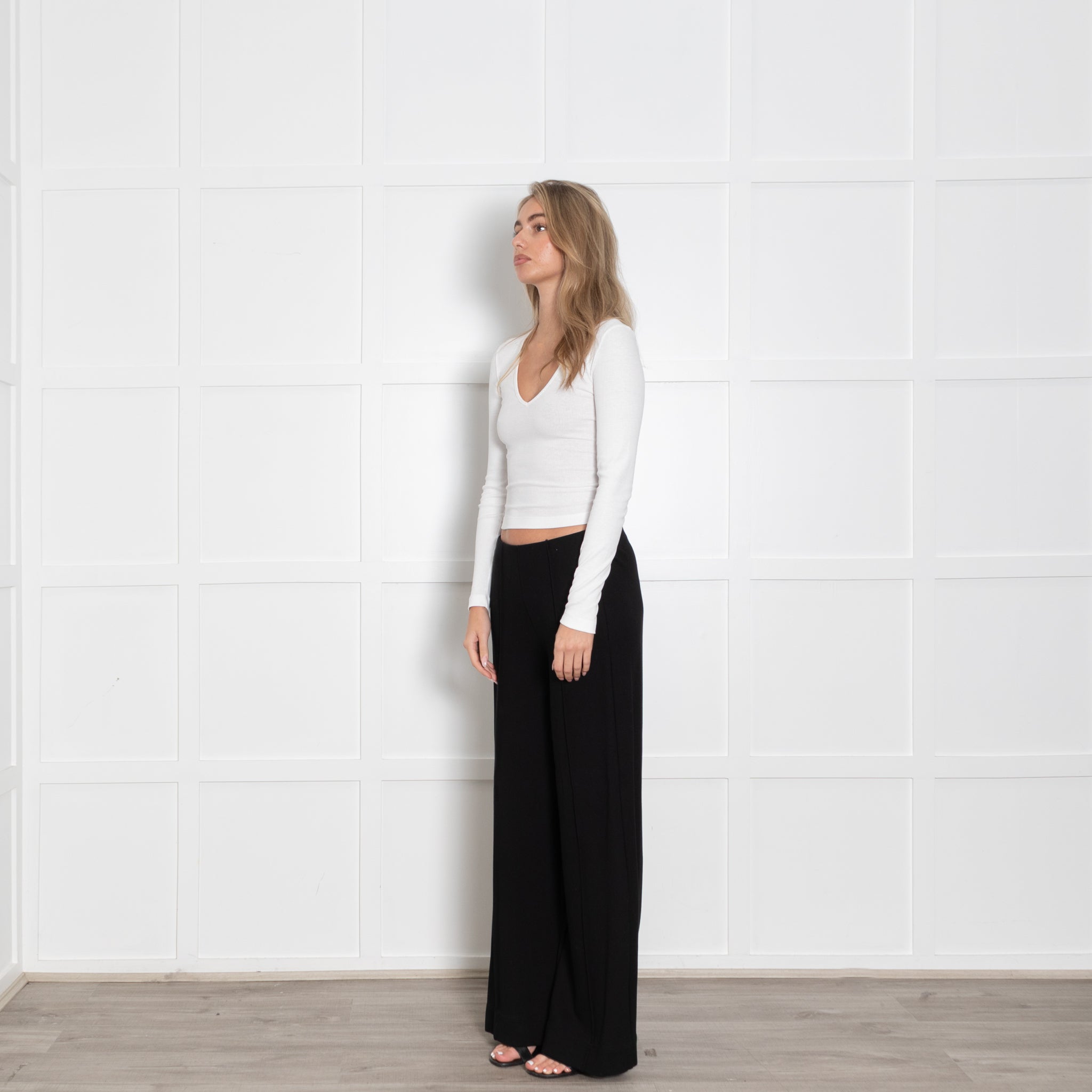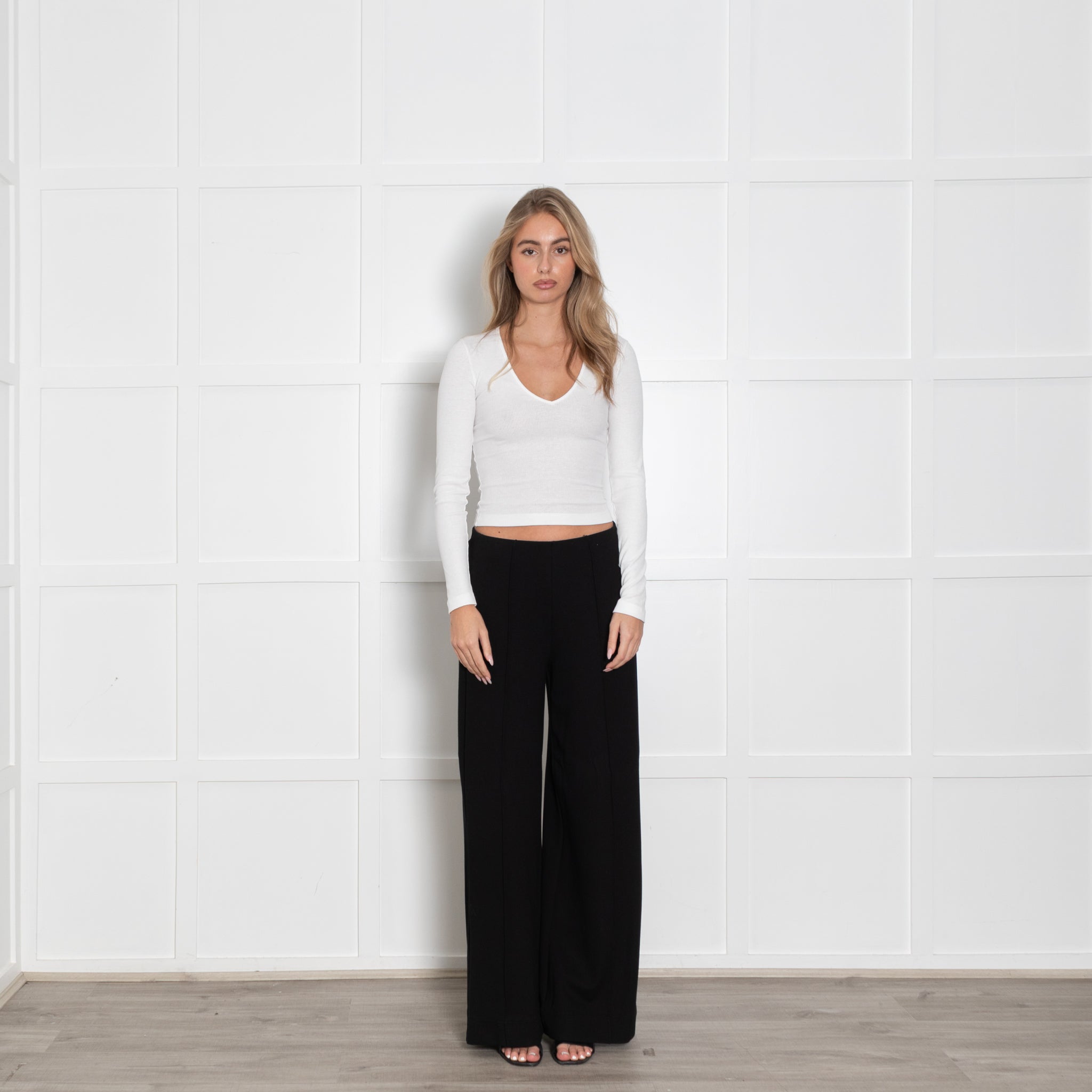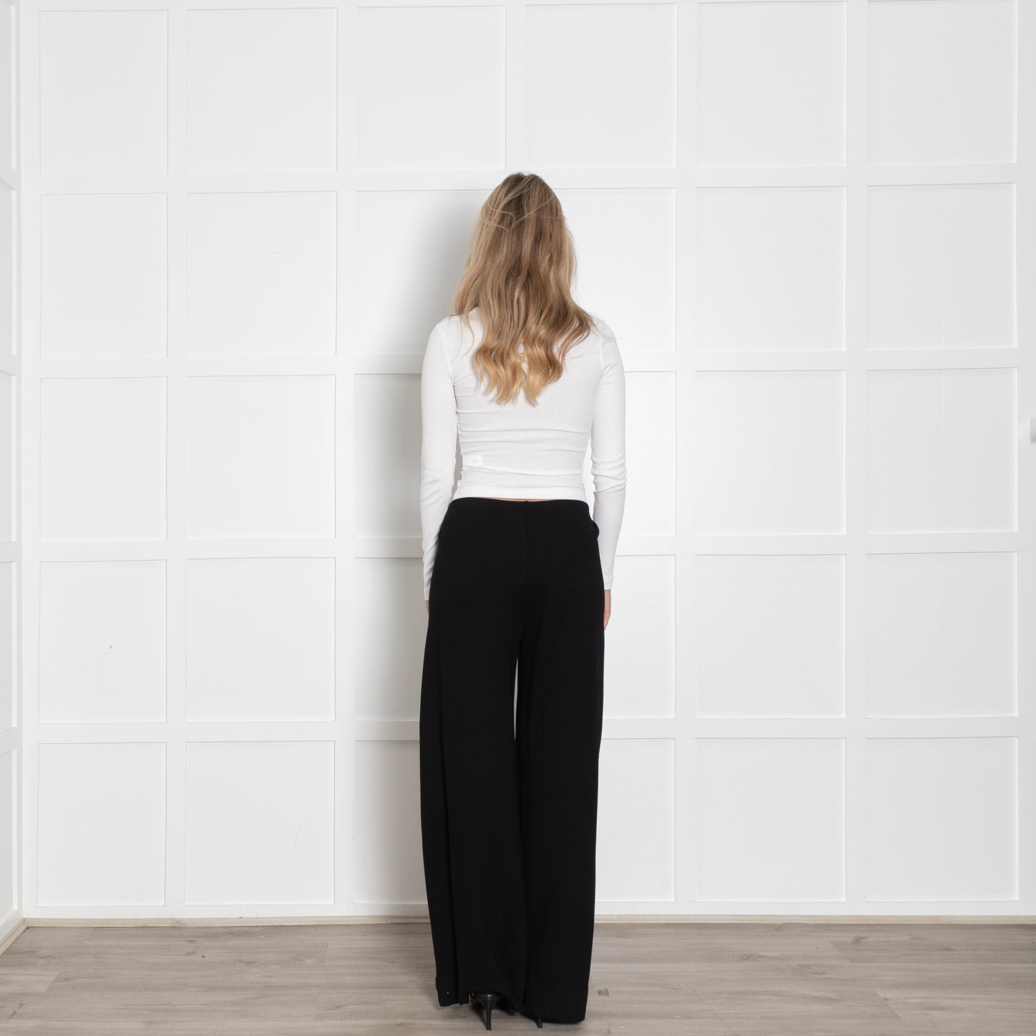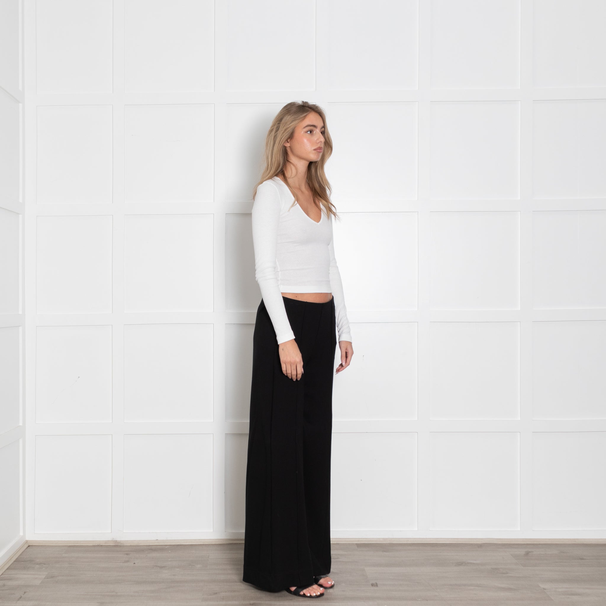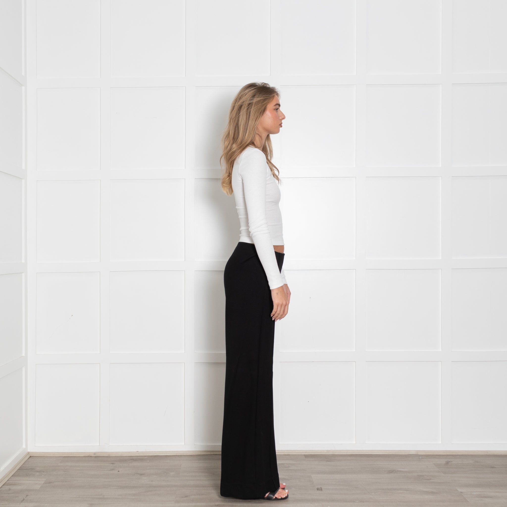 Me + Em black trousers, crafted with a stretchy fabric, featuring a concealed side zip, thick front hemlines, and a wide ankle leg design.