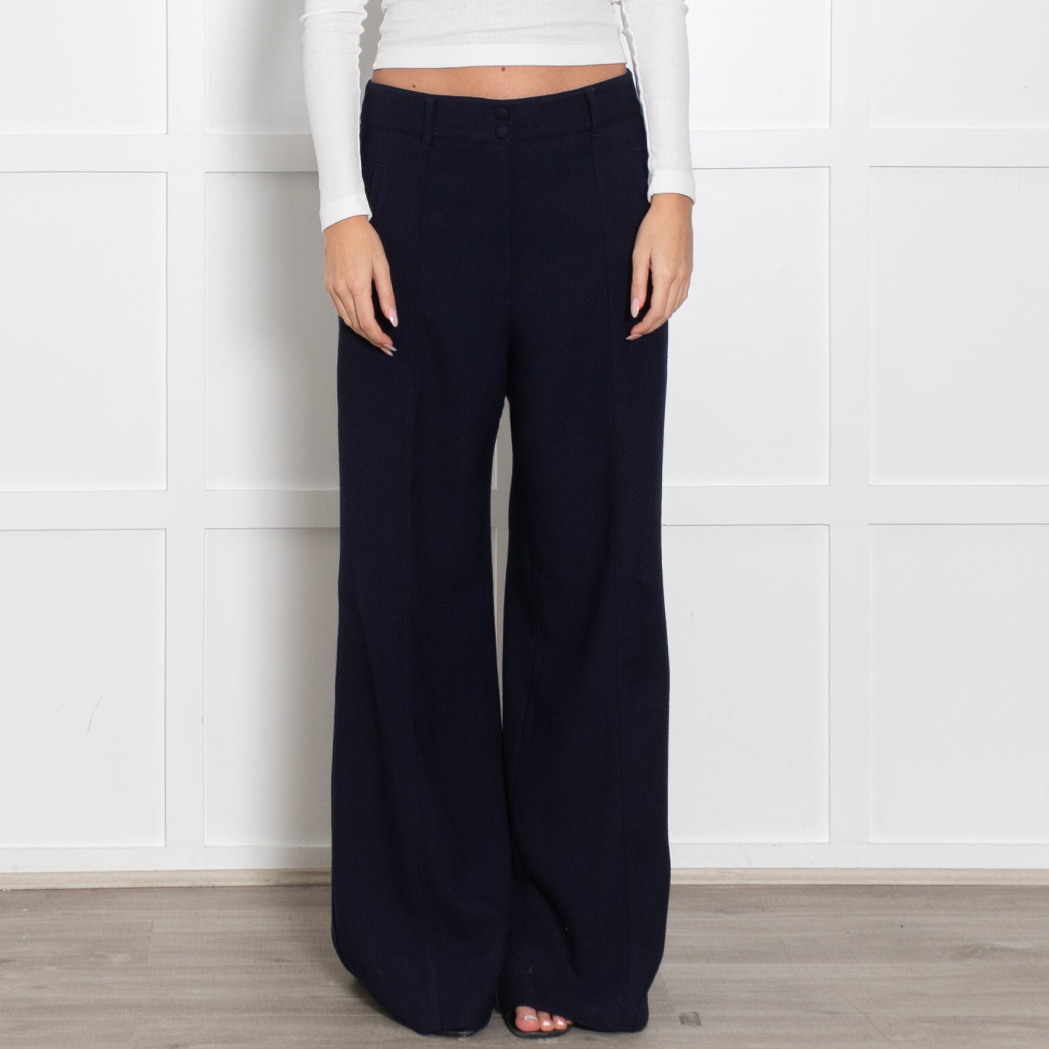 Me + Em Blue trousers featuring a stunning beige and silver lurex tweedy side stripe, with a stunning wide leg deisgn, two front zipped pockets, and two back pockets.