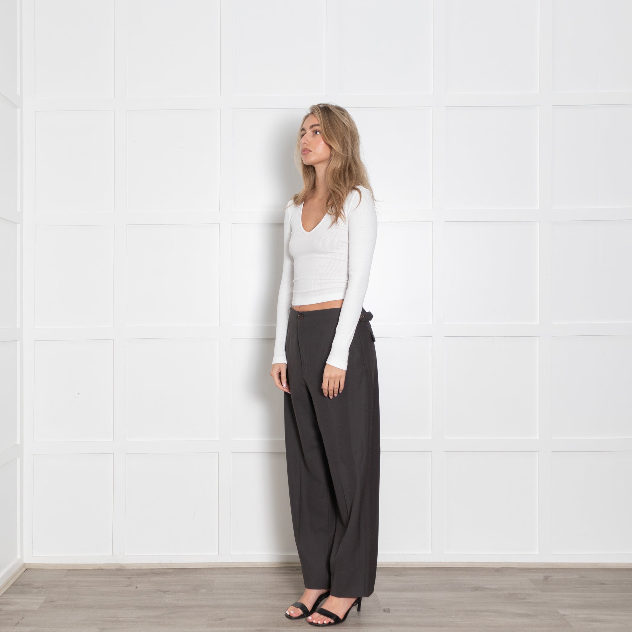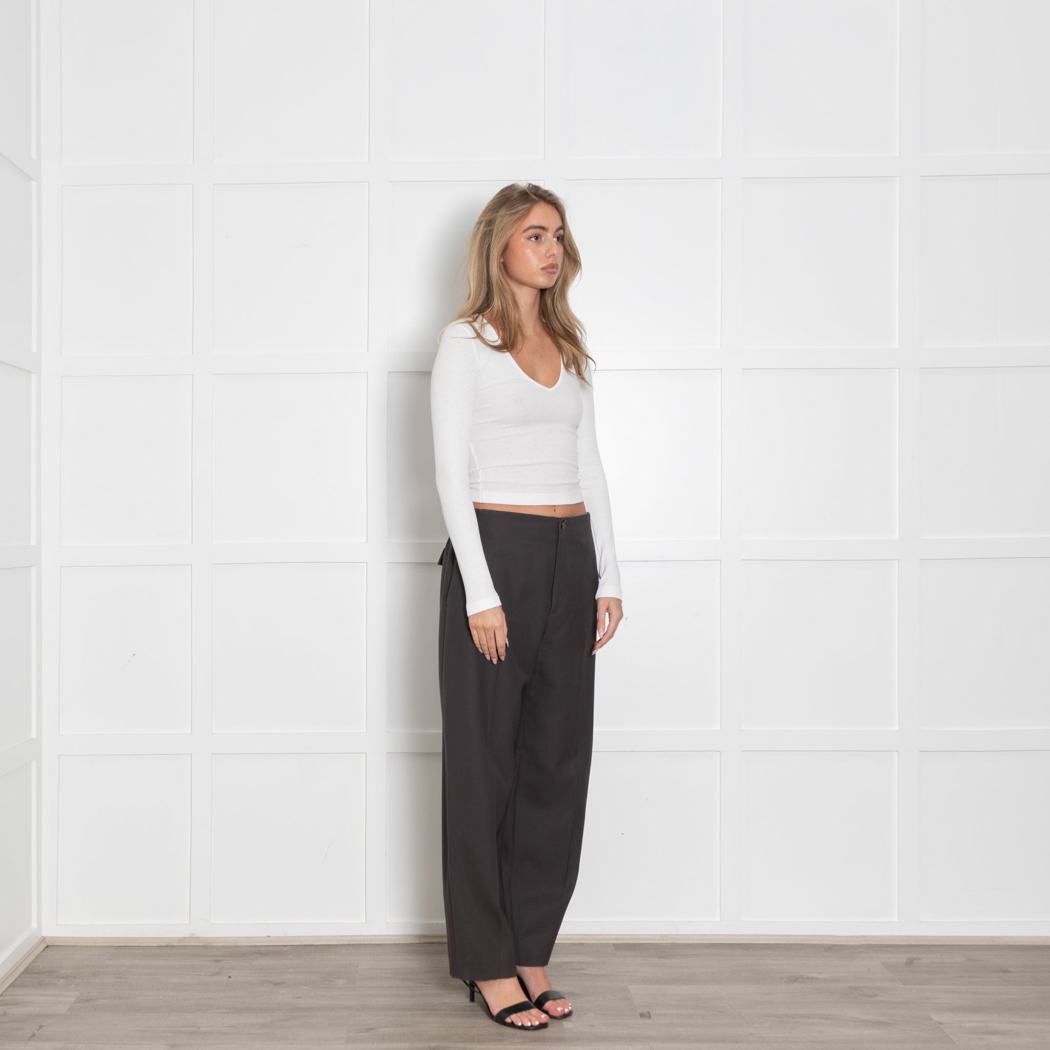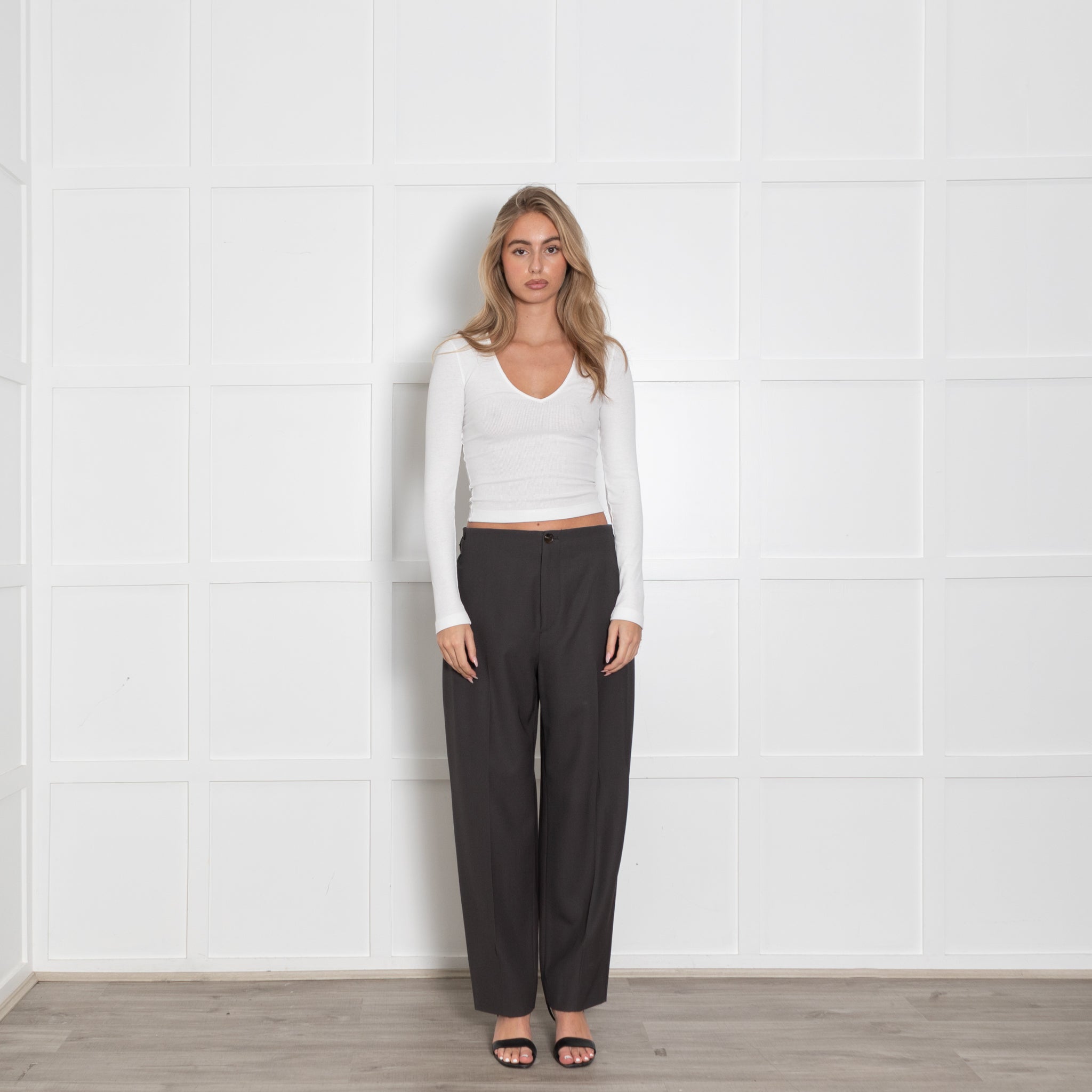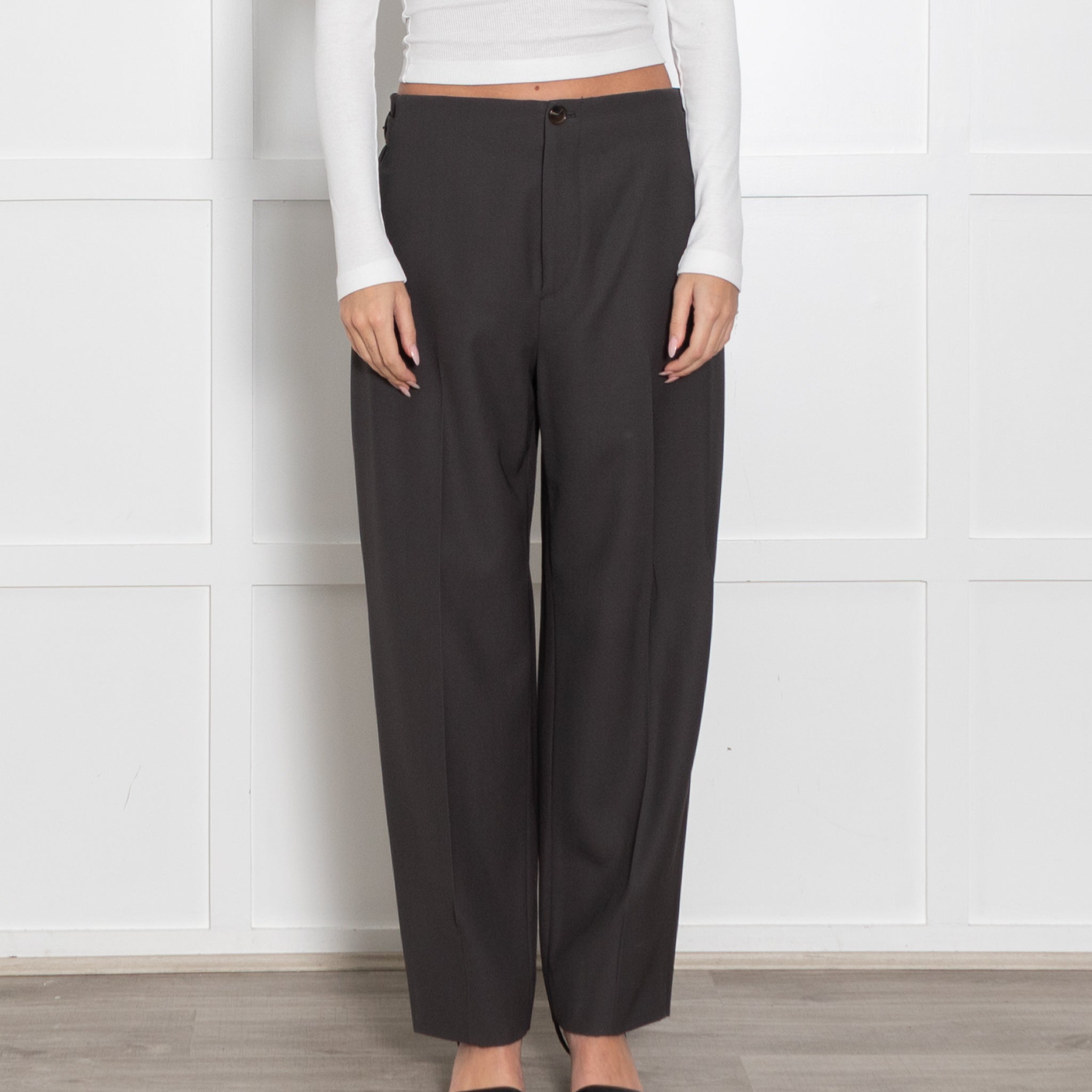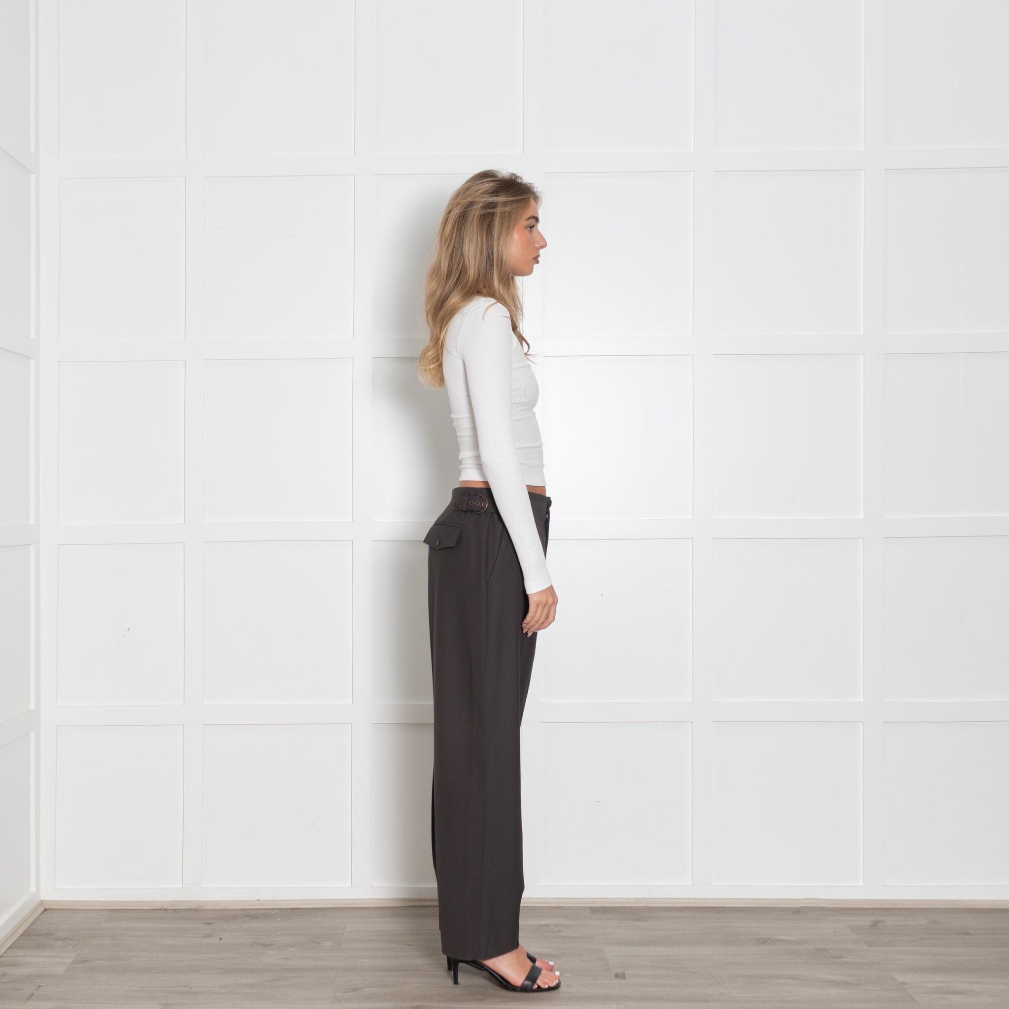 Soeur dark brown/grey trousers, crafted from a soft wool mix fabric, featuring a tailored design, with a front zip-up button closure and two front pockets, two back button-up pockets.