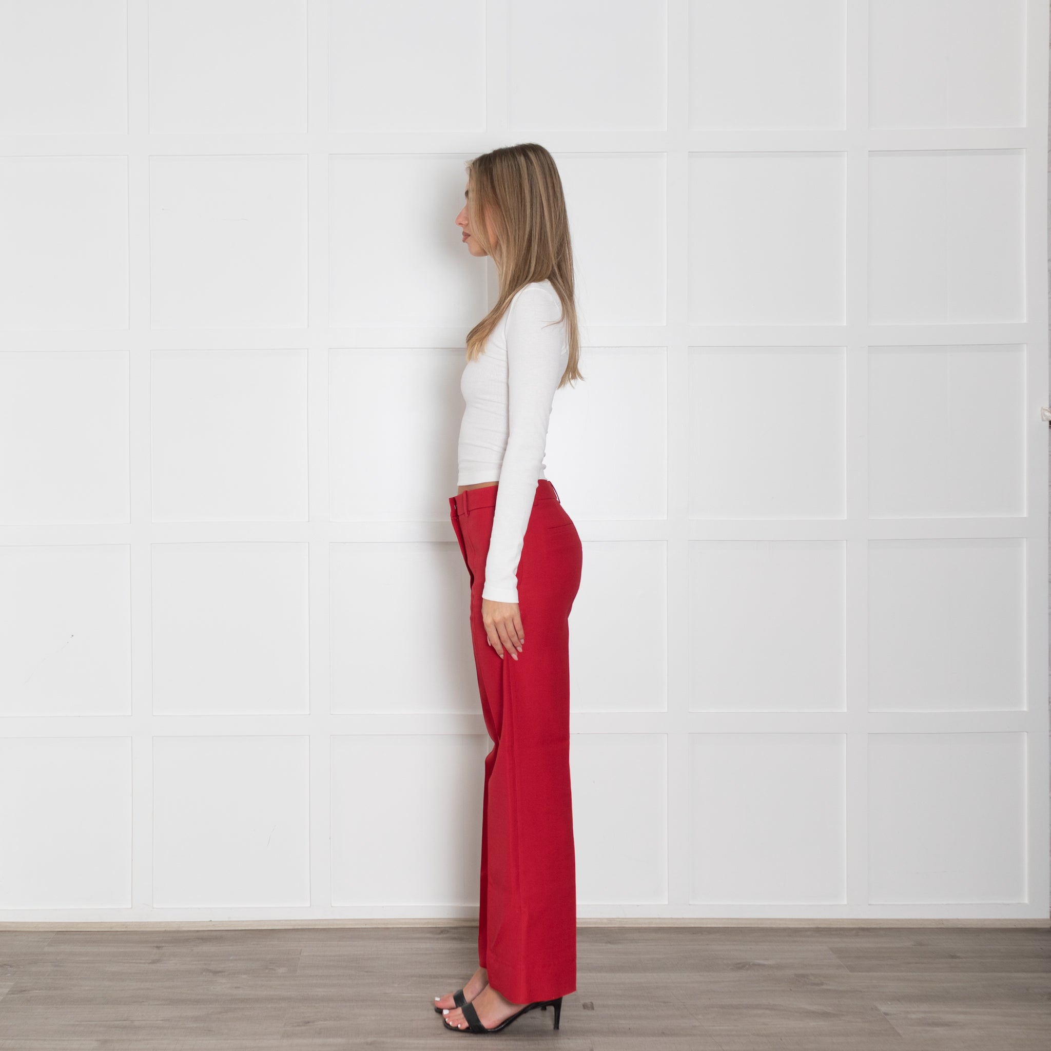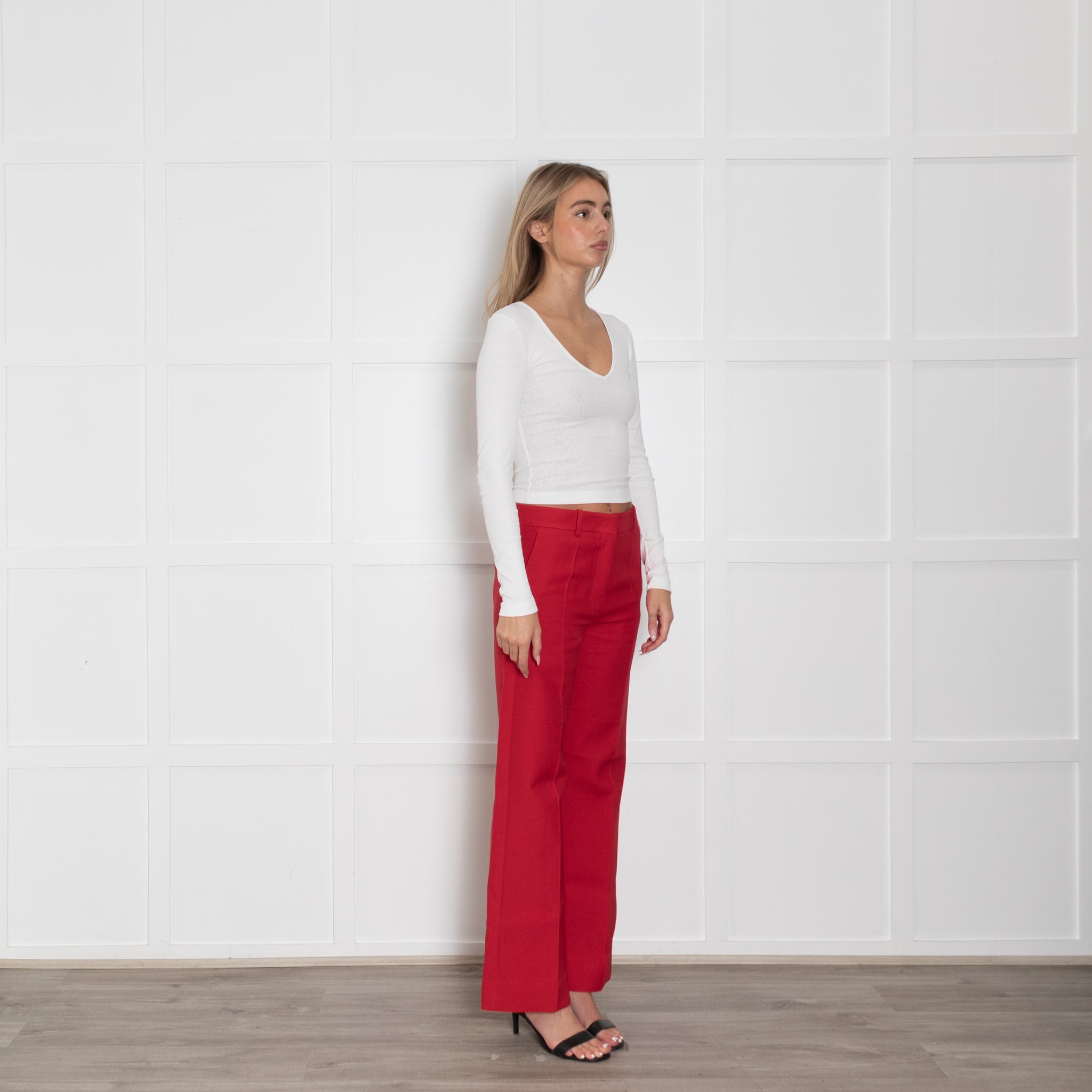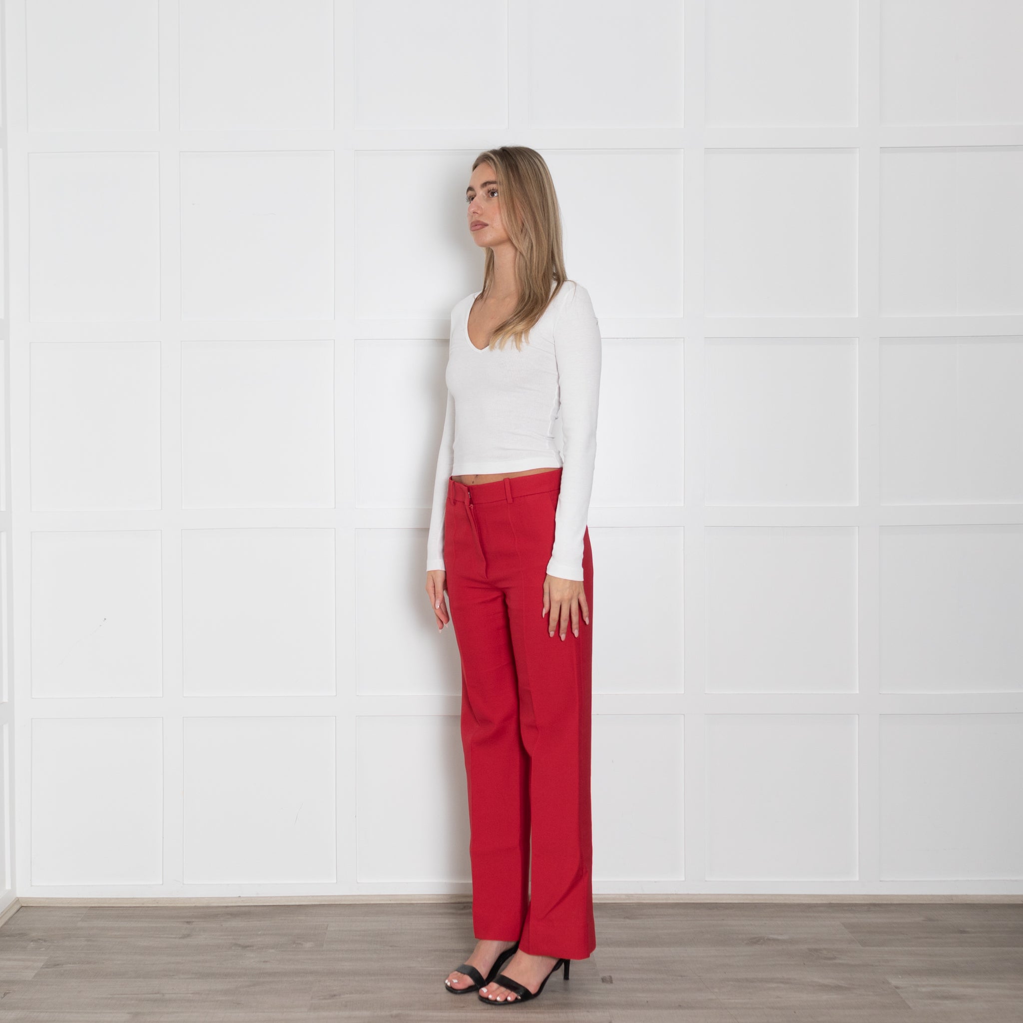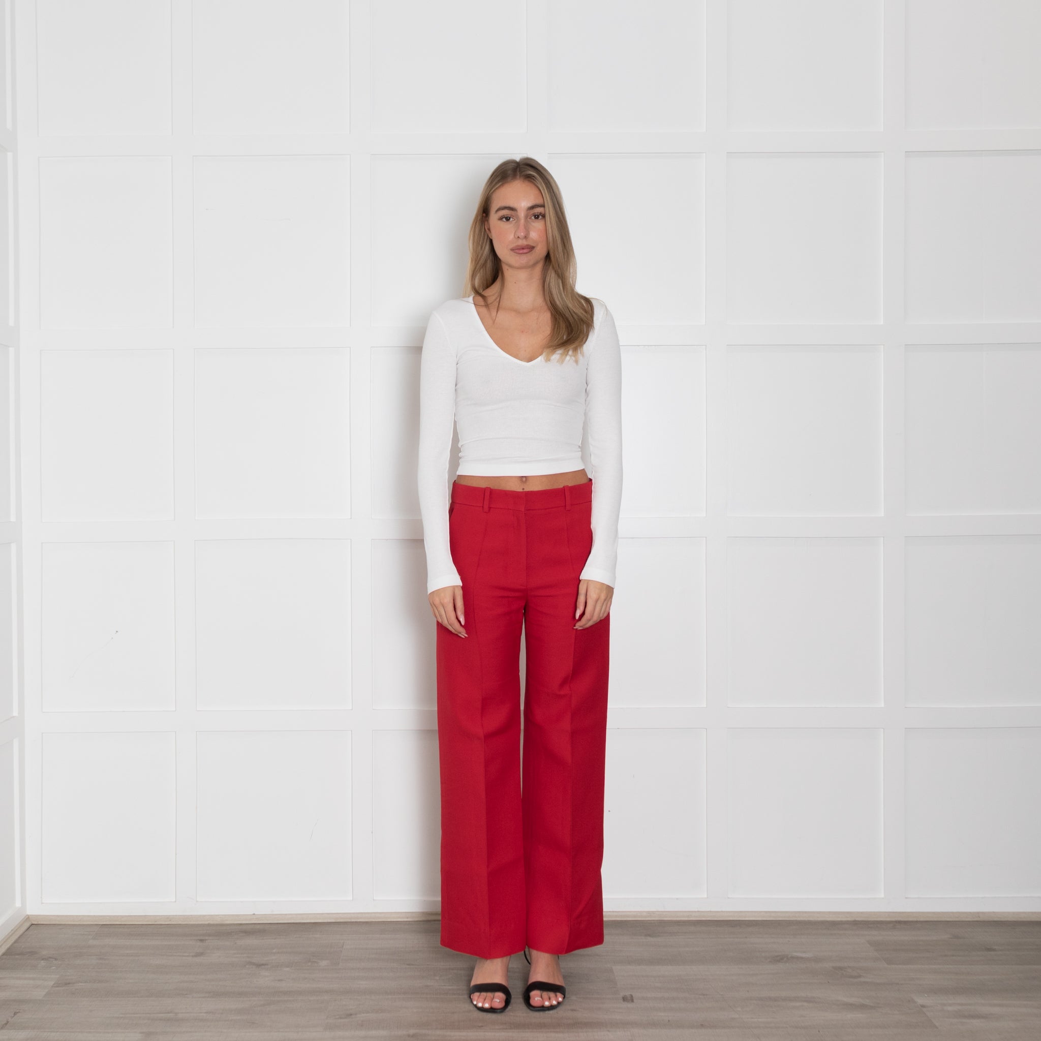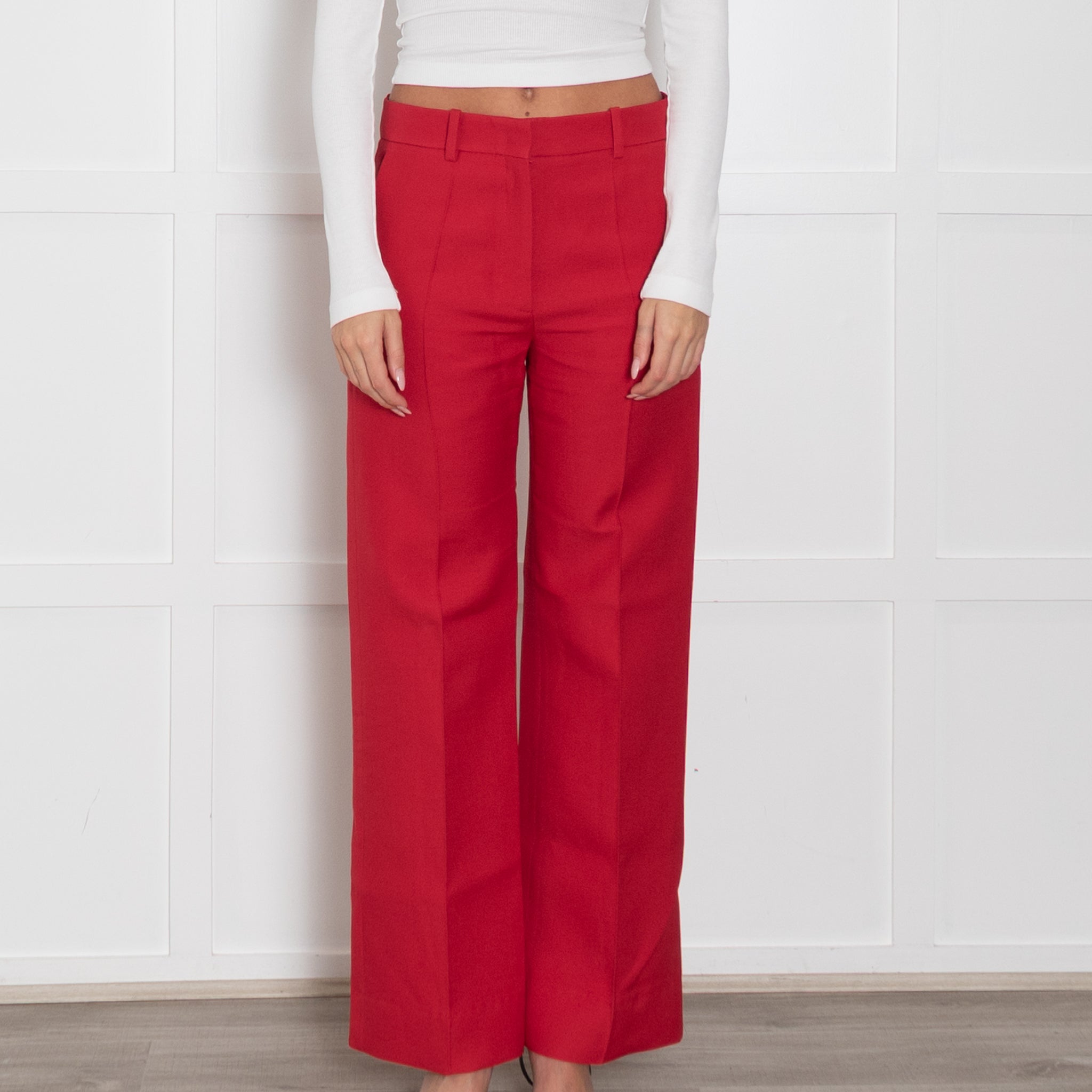 Valentino red wool and silk mix straight leg trousers featuring pockets and belt loops.