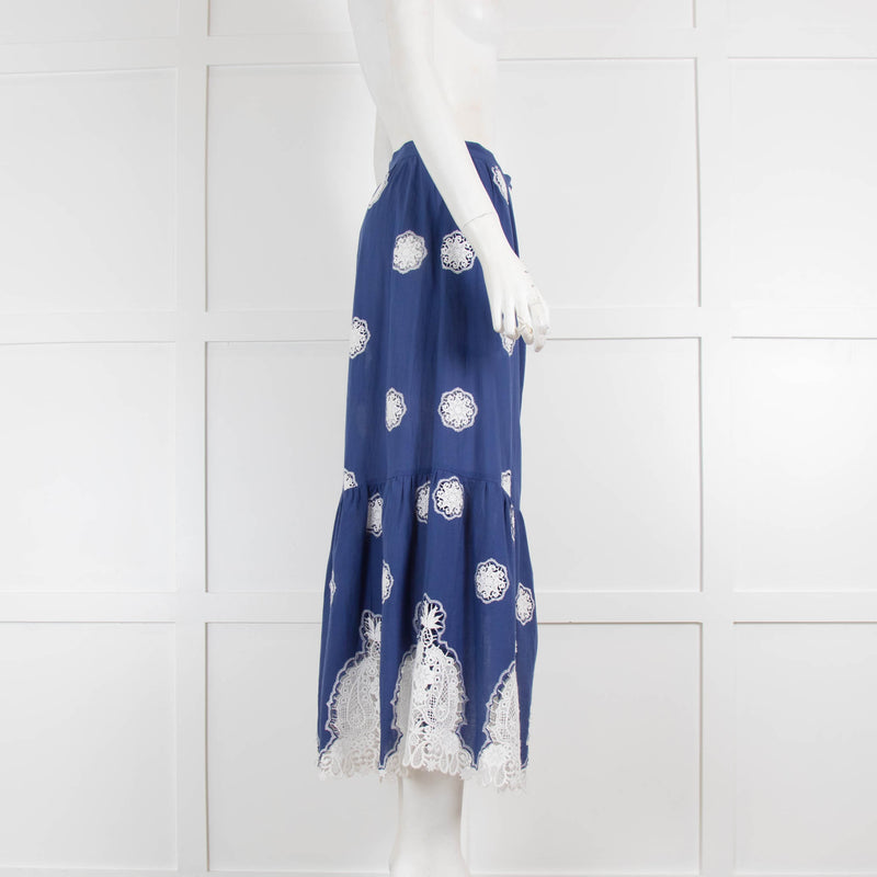 Miguelina Blue White Lace Detail Button Down Maxi Skirt
