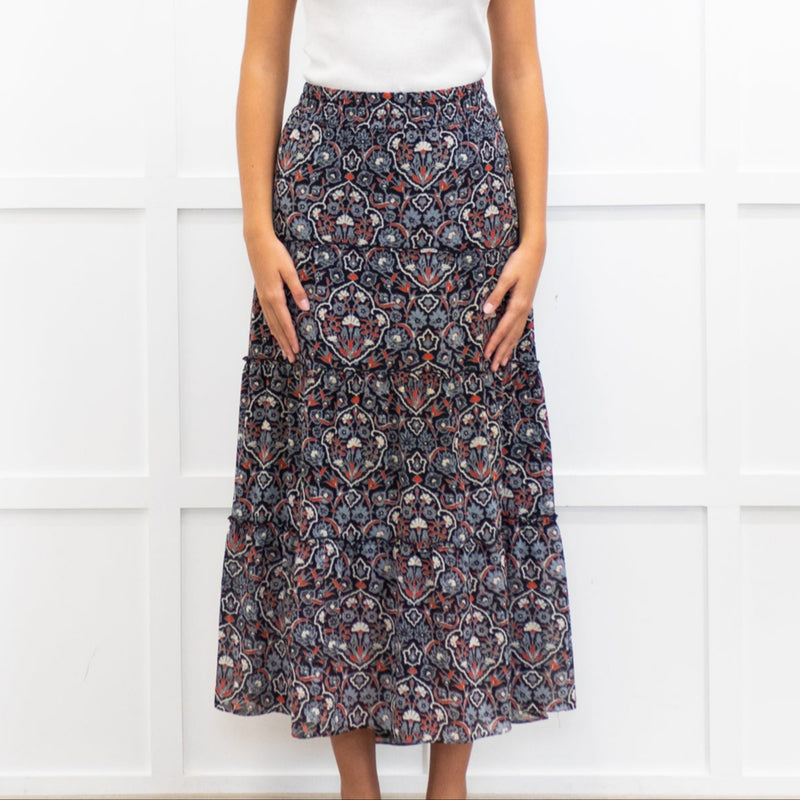 Me + Em Grey and Red Printed Tiered Crepe Maxi Skirt