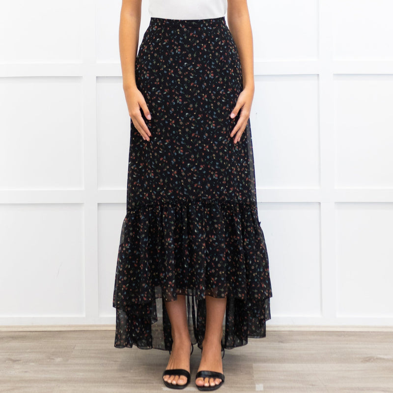 Mikael Aghal Black Crepe Asymmetric Floral Print Maxi Skirt