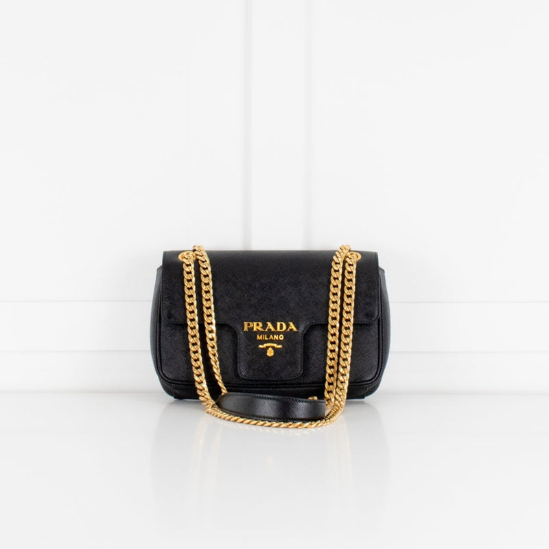 Prada Black Saffiano Pattina Flap Gold Chain Shoulder Bag