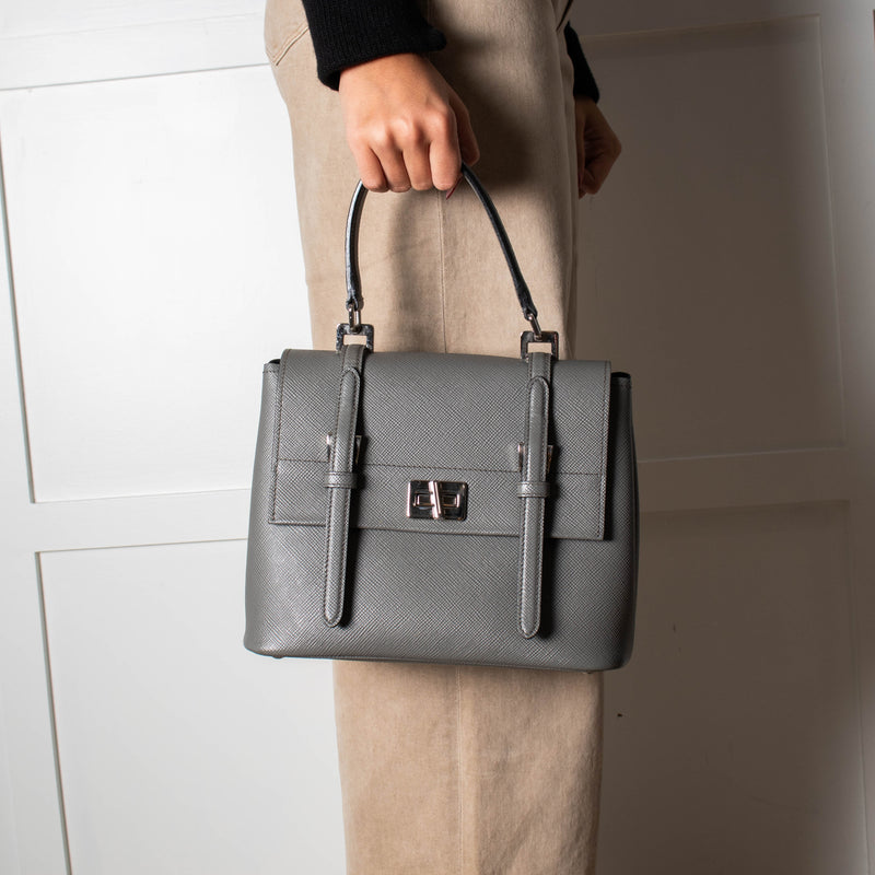 Prada Grey Saffiano Leather Turn Lock Flap Top Handle Bag