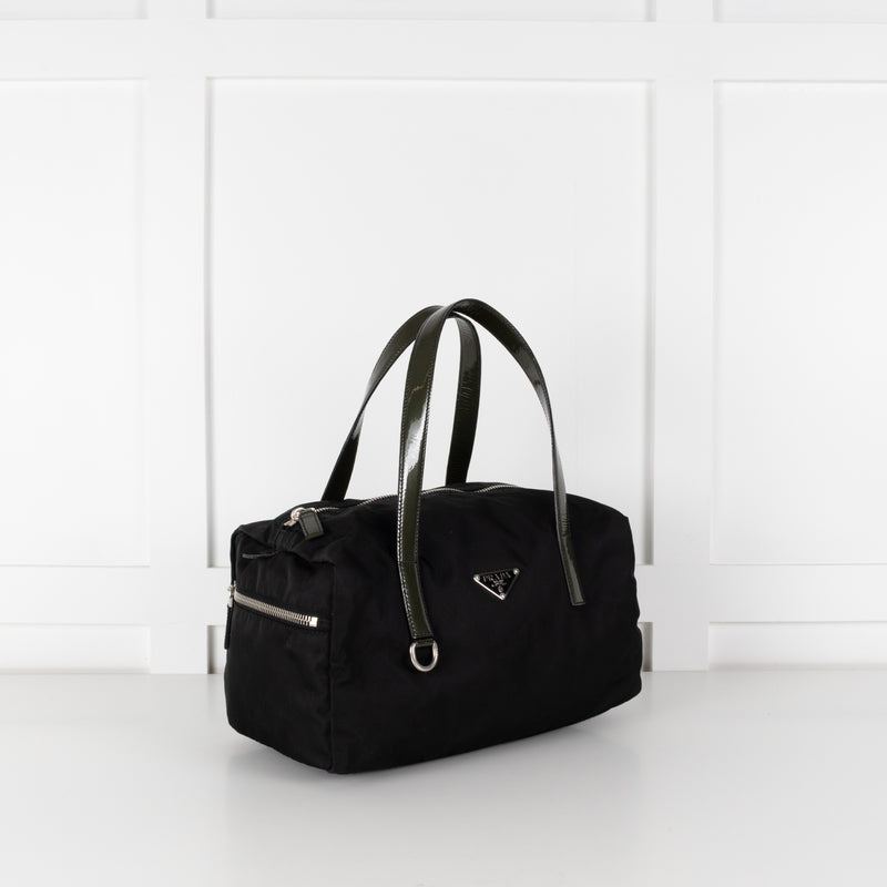 Prada Black Boston Nylon With Green Patent Leather Handles Mini Bag