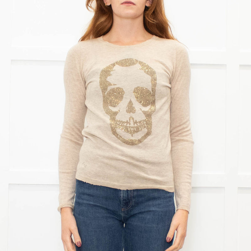 Zadig & Voltaire Beige Gold Diamante Skull Cashmere Fine Knit Jumper