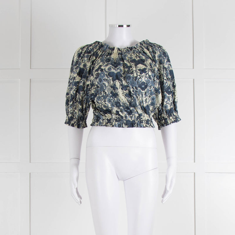 Anna Mason Cream Blue Floral Elasticated Trim Cropped Top