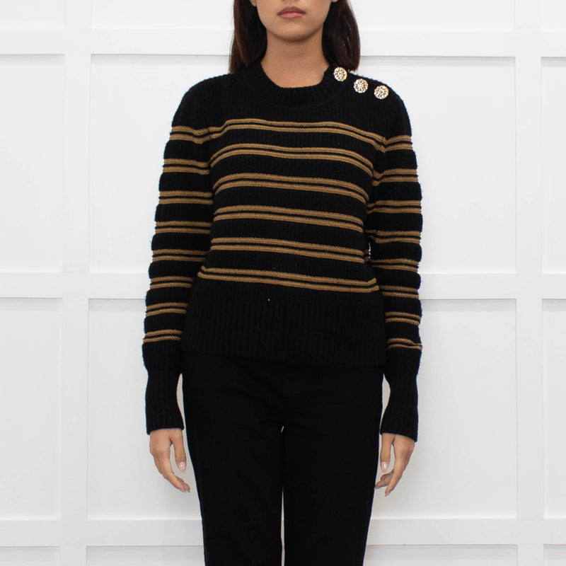Ba&sh Black Brown Stripes Gold Buttons On Shoulders Wool Blend Jumper