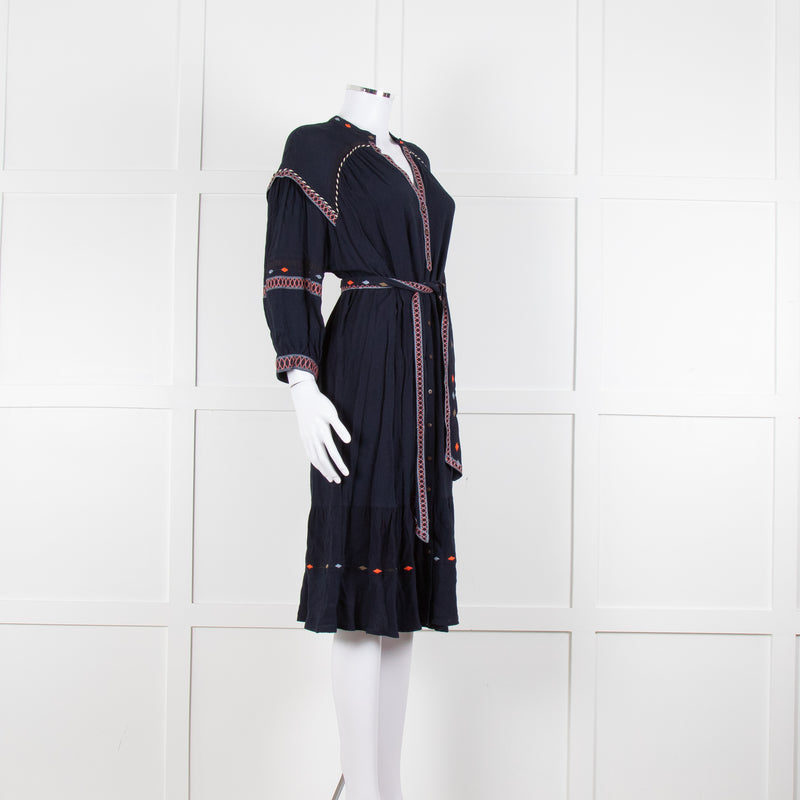 Ba & Sh Navy Blue Orange Embroidered Trim Peasant Belted Dress