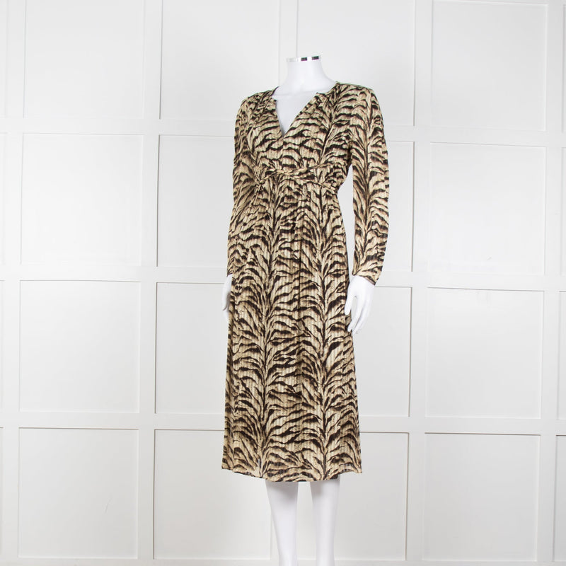Ba&sh Beige Tigerprint Pleated Notch Neckline Midi Dress