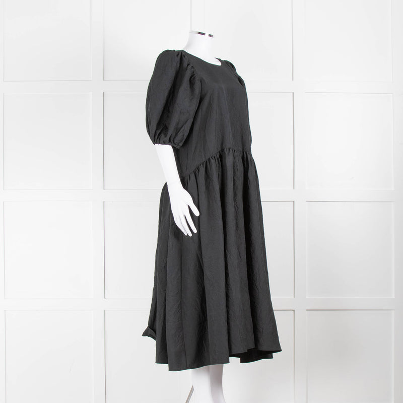 Stine Goya Black Crinkle Tiered Puff Sleeve Midi Dress
