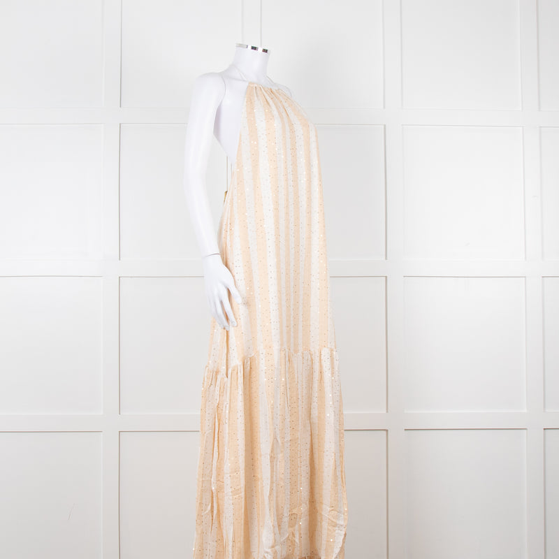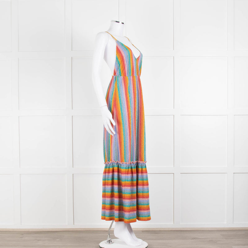 Sundress Peach Yellow Green Striped Lurex Sleeveless Peplum Maxi Dress