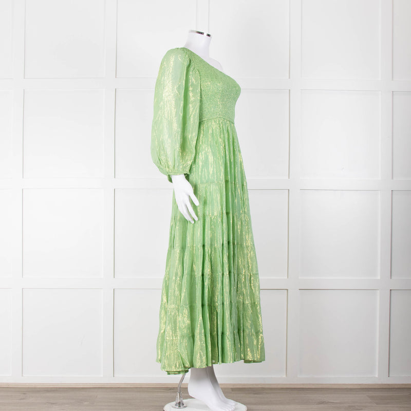 Sundress Green and Gold Lurex Smocked One Shoulder Maxi Dress
