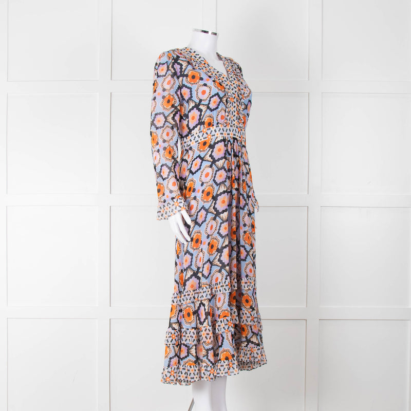 Temperley Blue Orange Ruffle Trim V Neck Ruffle Bottom Long Sleeve
