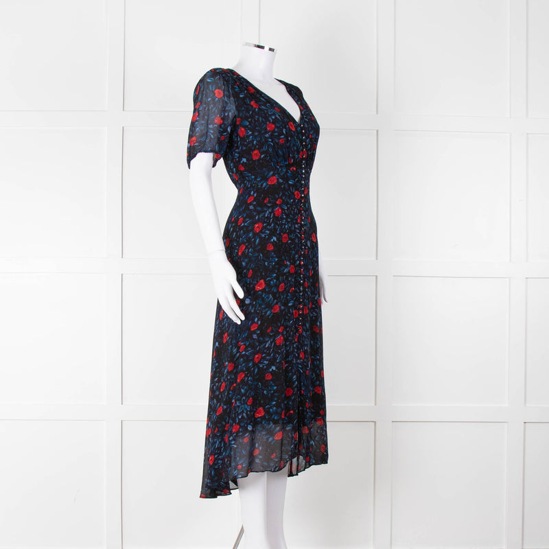 The Kooples Black Red Blue Floral Short Sleeve Midi Dress