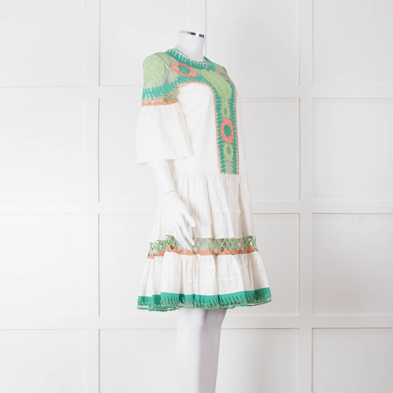 Temperley White Cotton Dress with Green and Pink Lace Panels