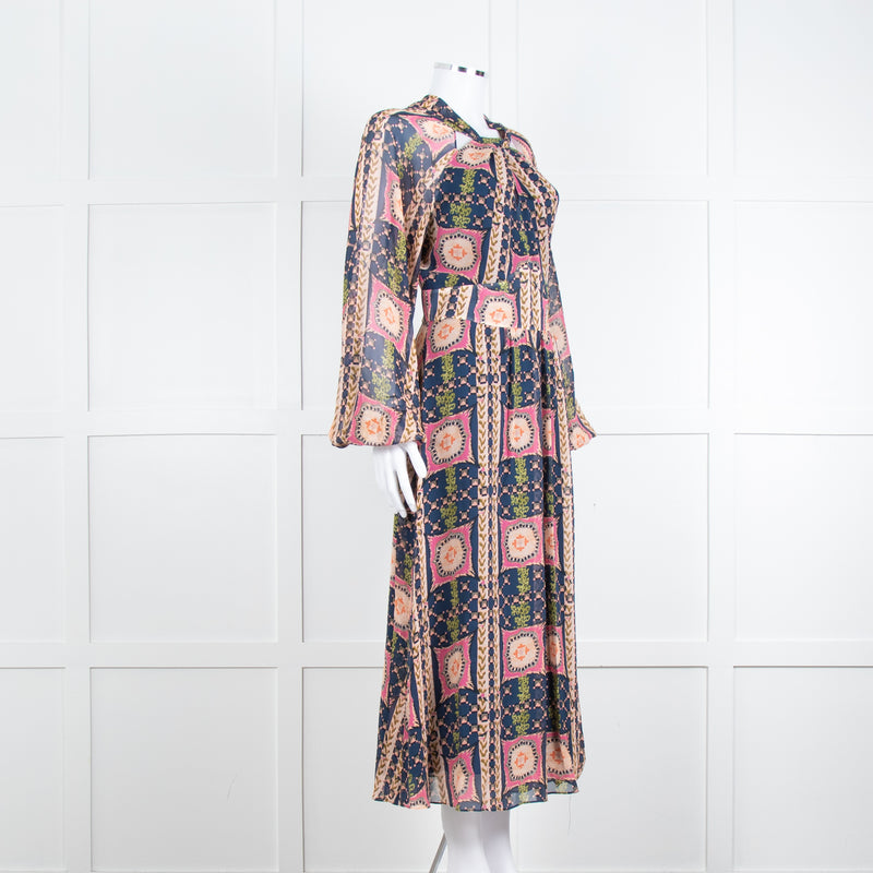 Temperley Pink Blue Silk Long Sleeve Midi Dress