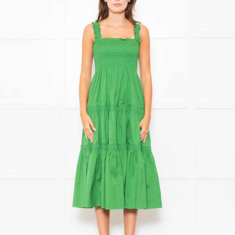 Tory Burch Green Smocked Waist Strappy Tiered Dress
