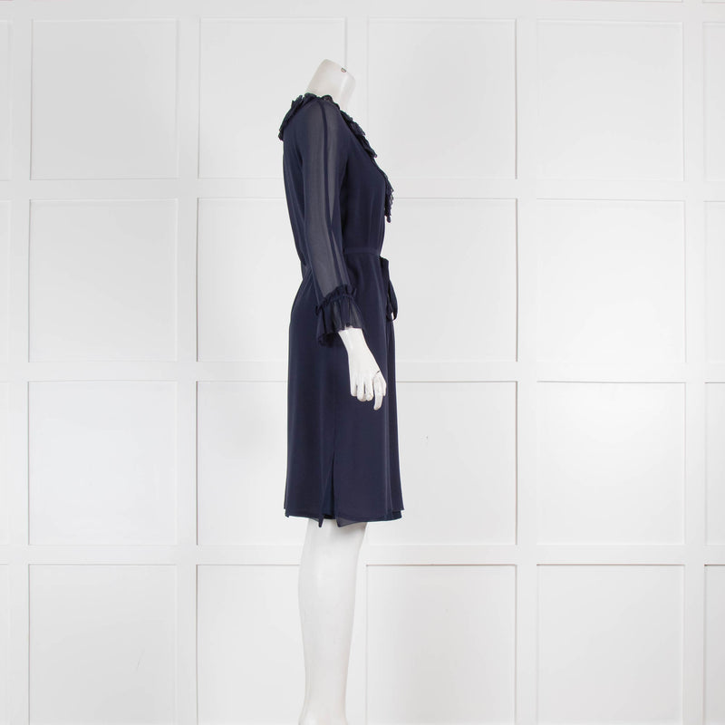 Tory Burch Navy V Neck Ruffle Silk Dress with Tie Belt
