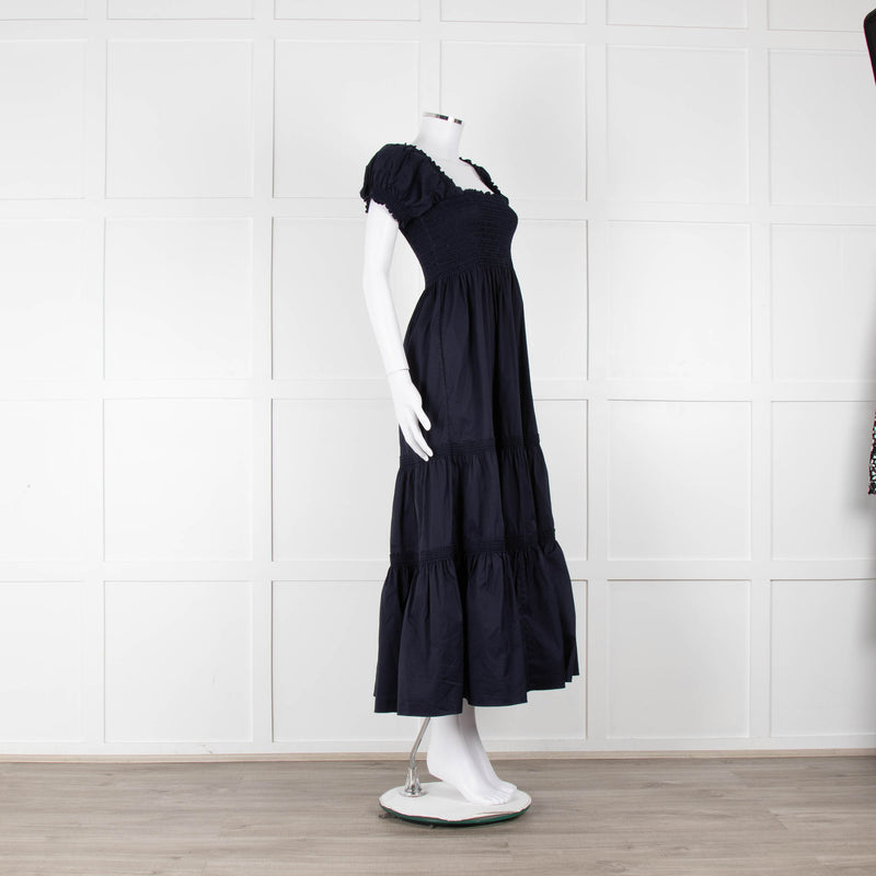 Tory Burch Navy Blue Cotton Ruched Bodice Puff Sleeve Maxi Dress