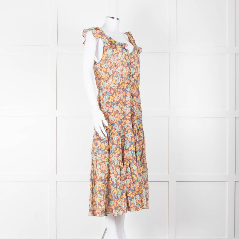 Veronica Beard Coral Green Blue Floral Cotton Ruffle Strap Midi Dress