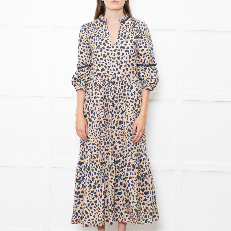 Wyse Beige Blue Animal Print Cotton Maxi Dress