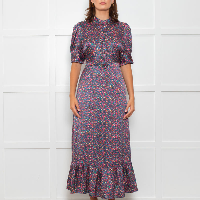 Wyse Blue Pink Floral Satin Frill Trim Dresses