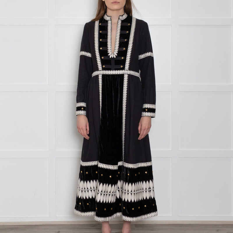 Wyse Black Gold Flower Print Boho Style Full Length Dress