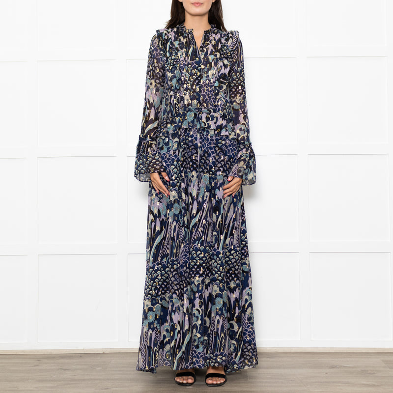 Zadig & Voltaire Blue Black Cream Gold Lurex Floral Print Maxi Dress