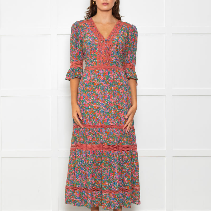 Wyse Pink Orange Green Floral Lace Trim Short Sleeve Dress