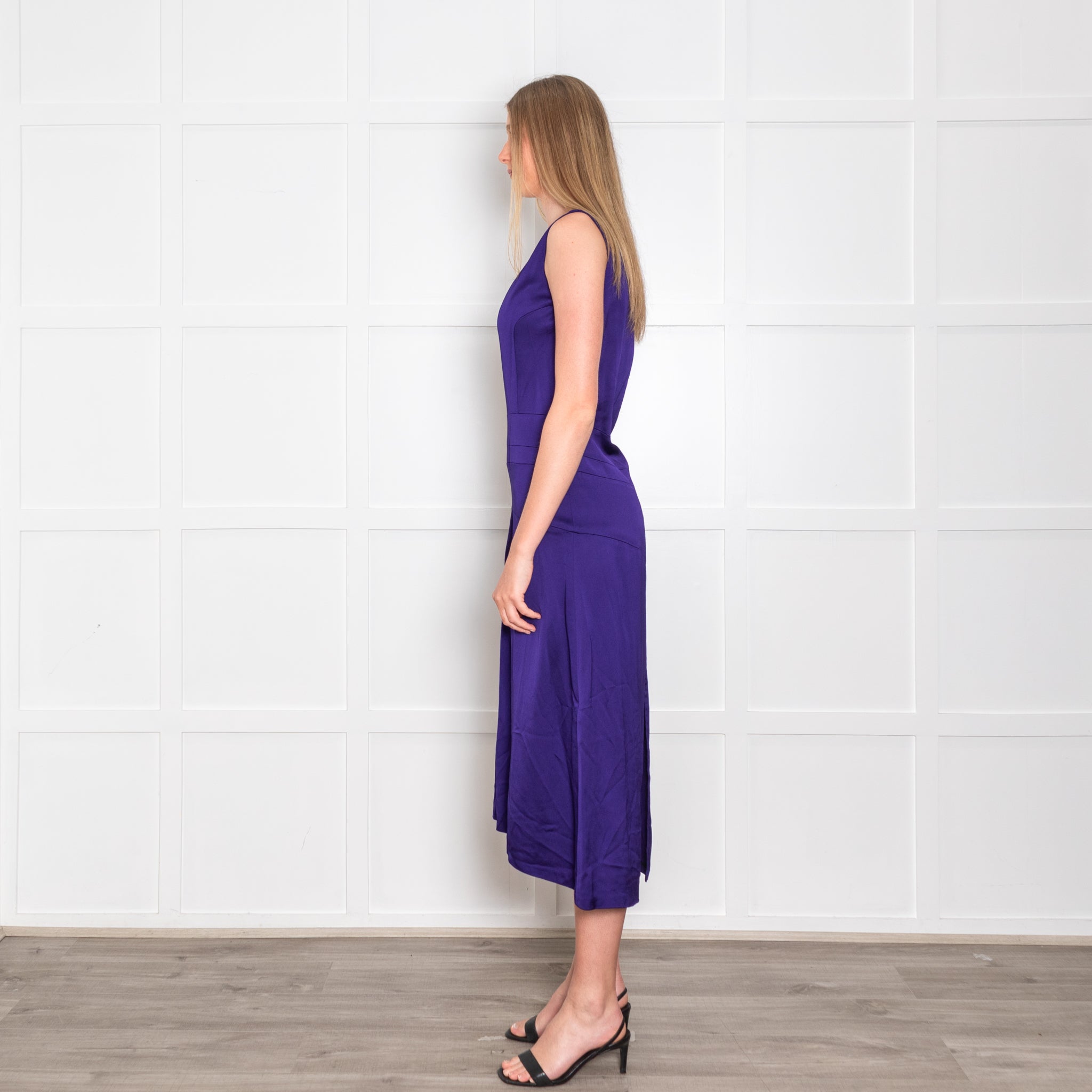 Victoria Beckham purple cobalt satin V-neck midi dress with panel stitch detailing and a rear hem split. New with tags.