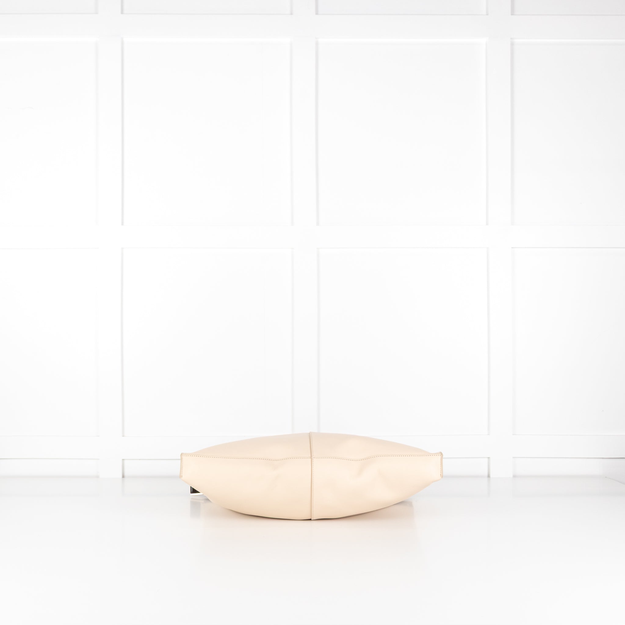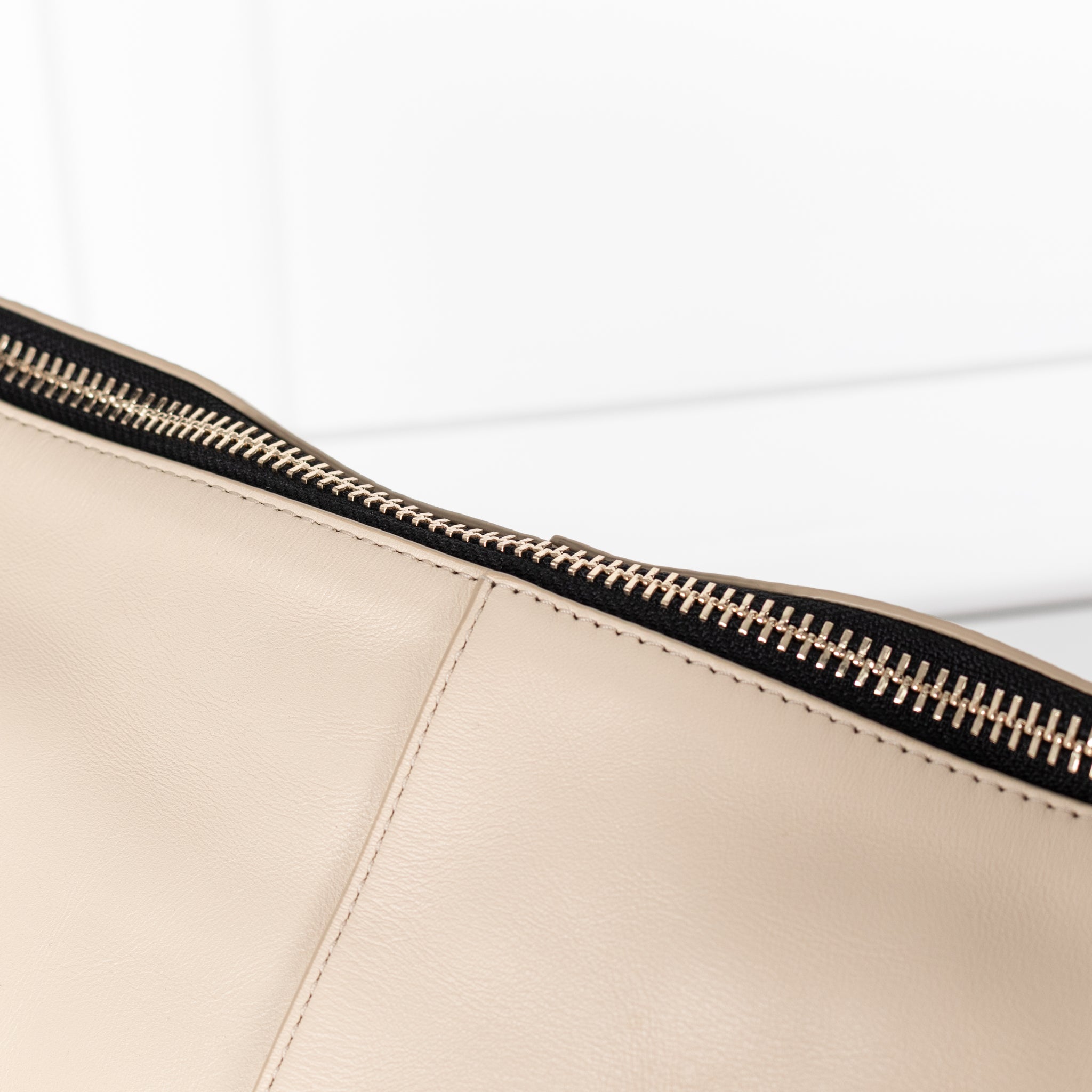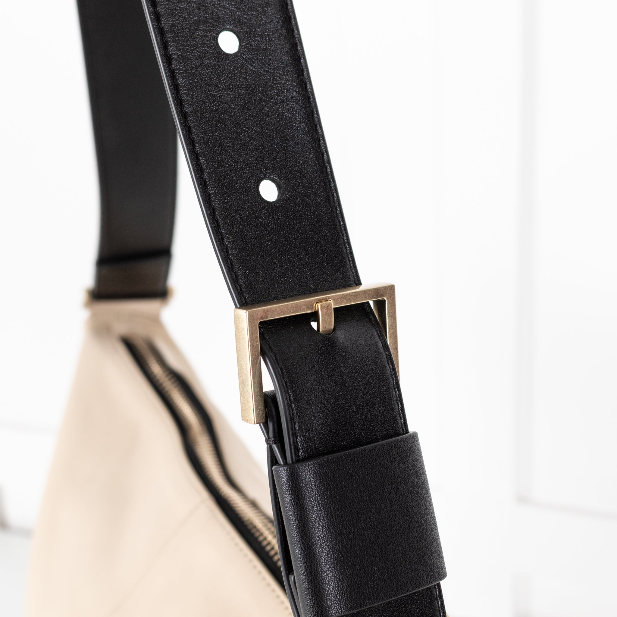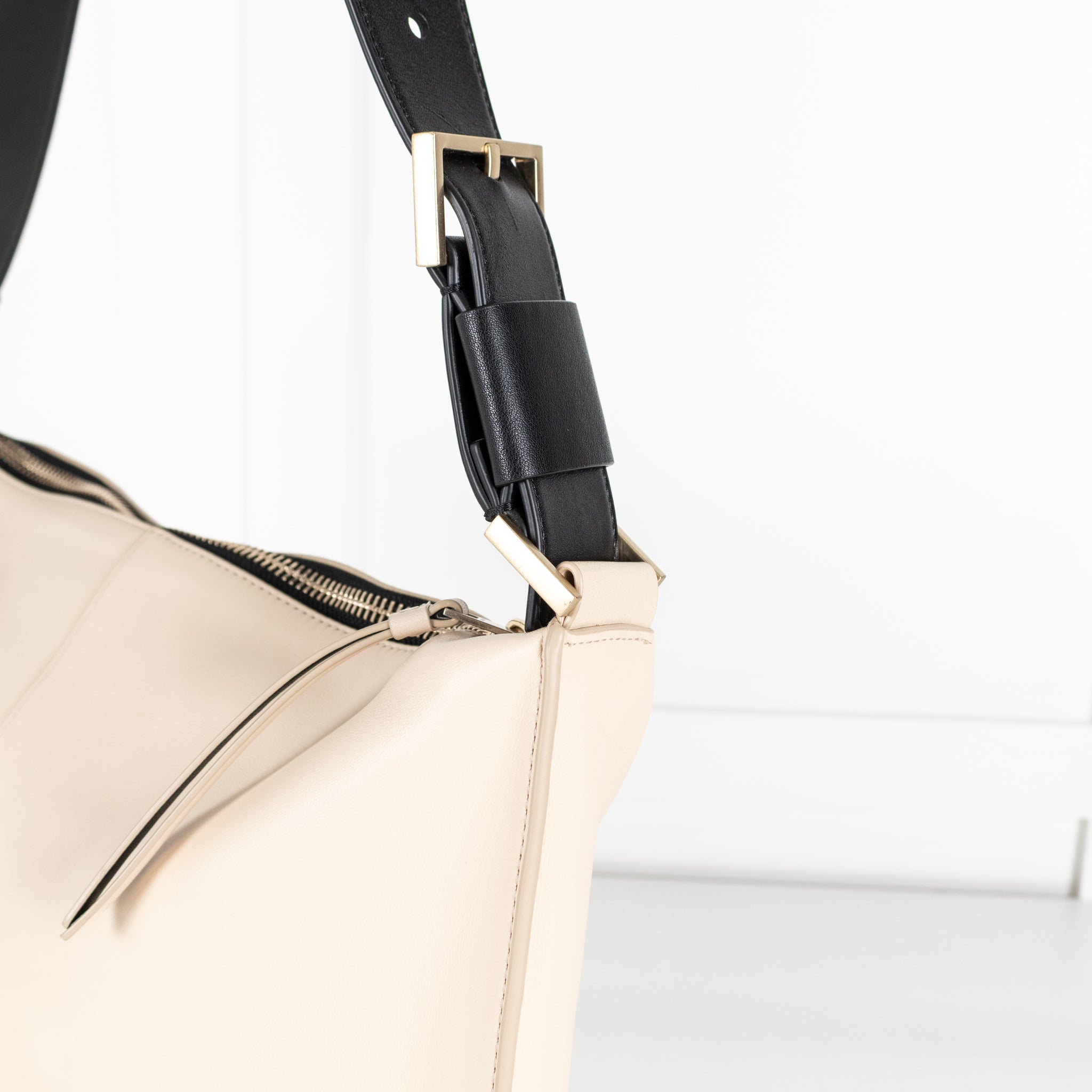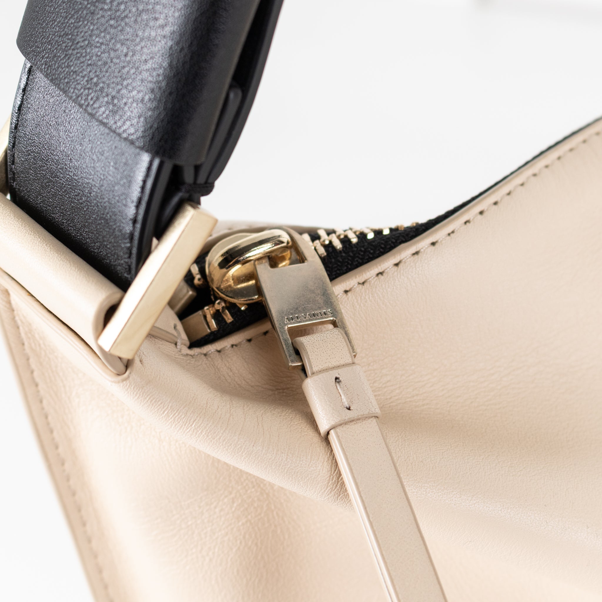 All Saints Edbury off-white shoulder bag with a black adjustable shoulder strap, pale gold-tone hardware, top zip closure, and two internal slip pockets. New with tags.
