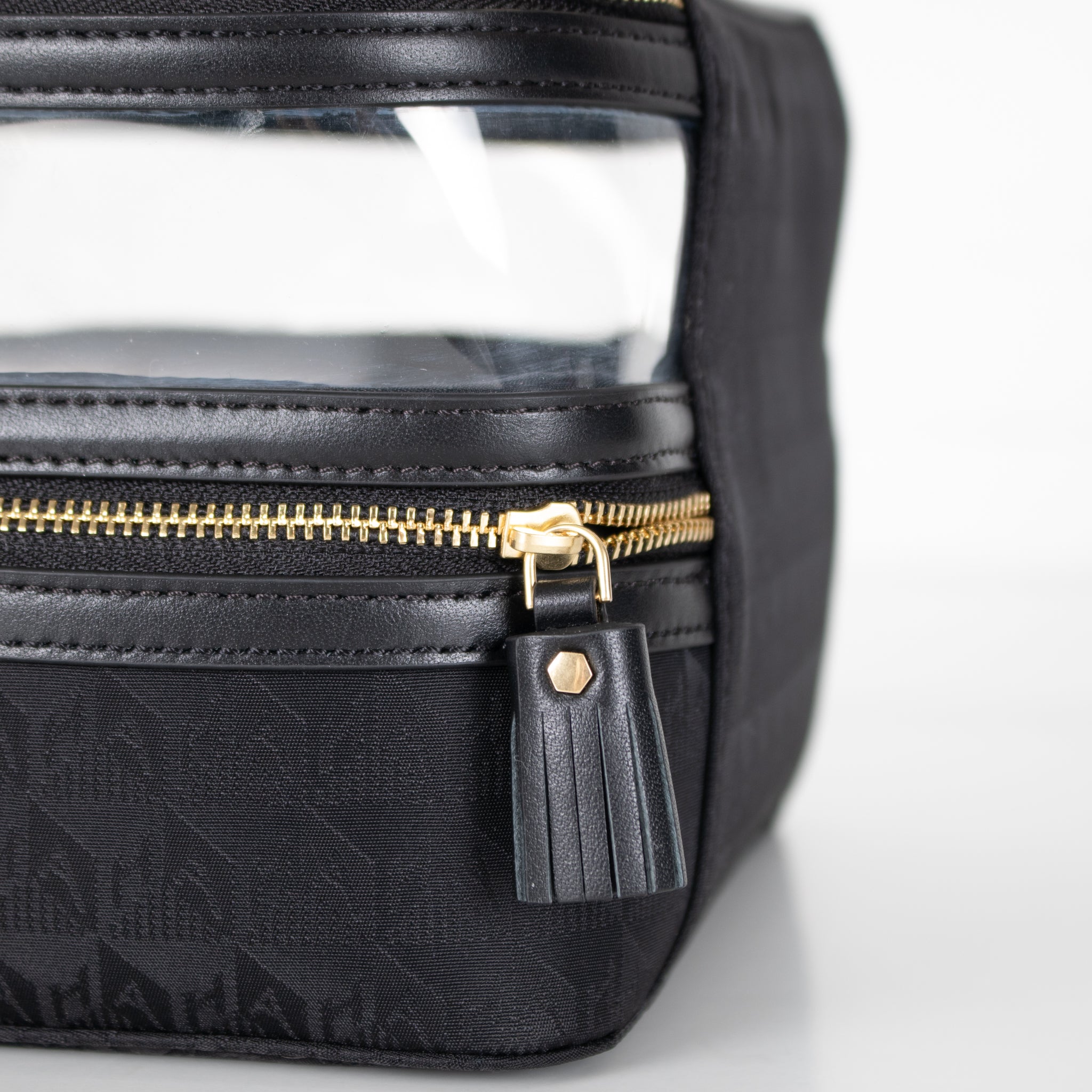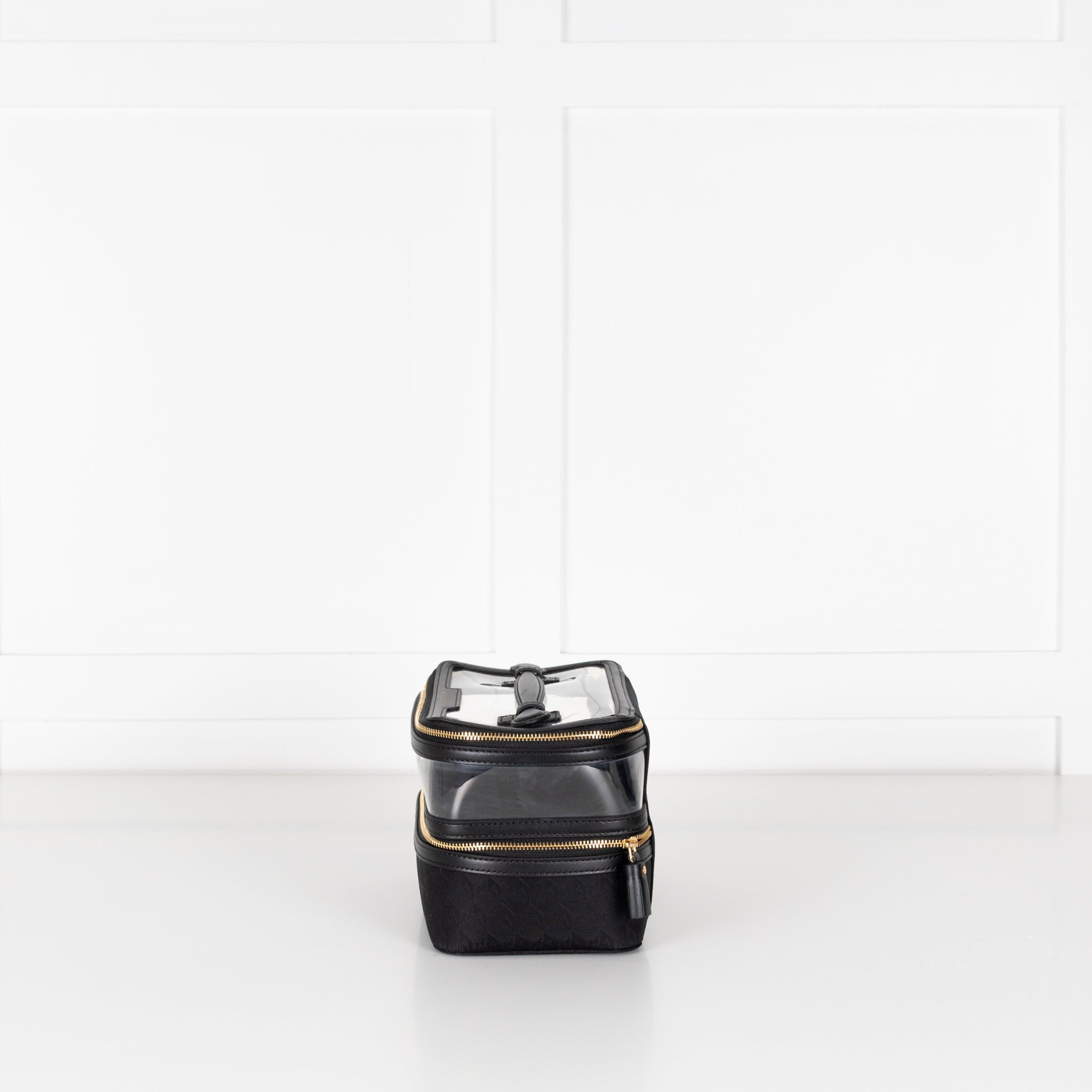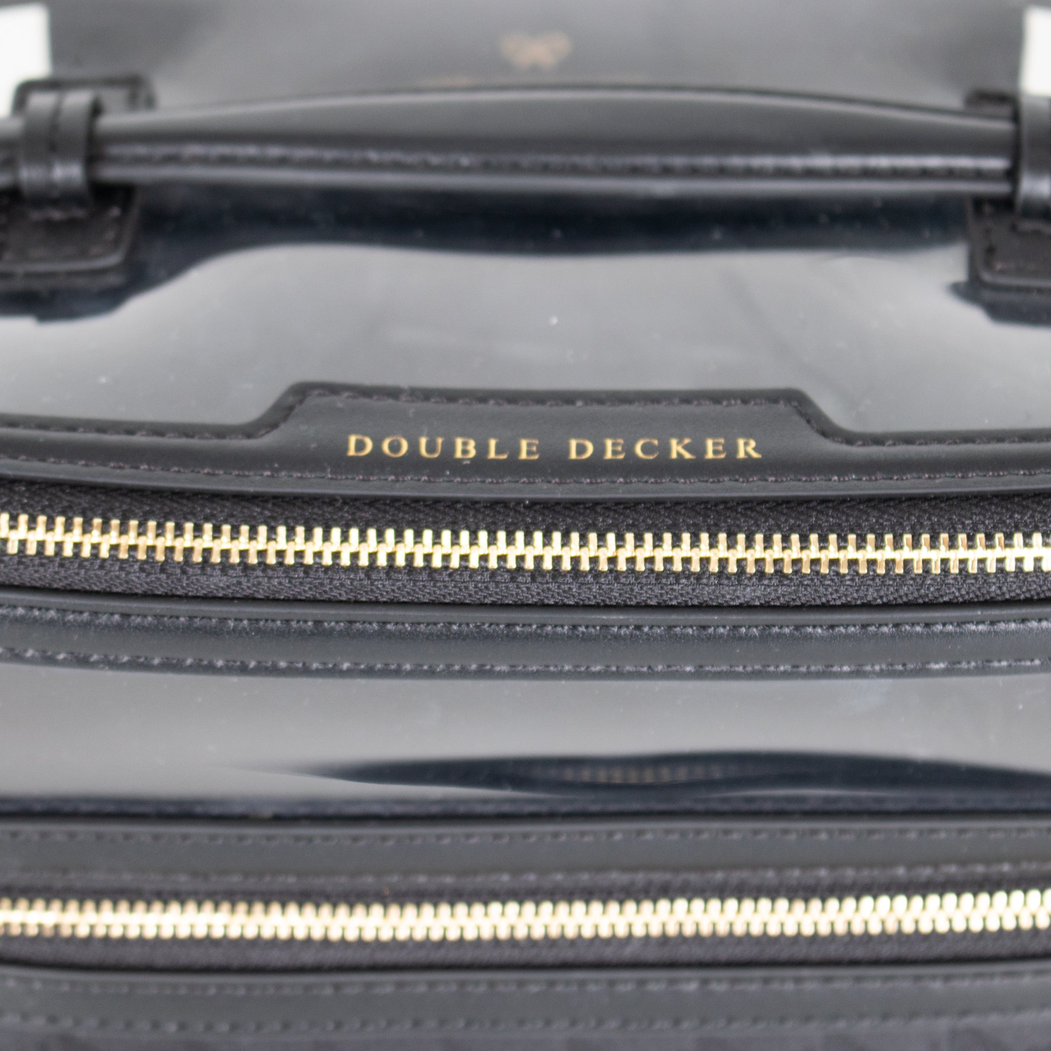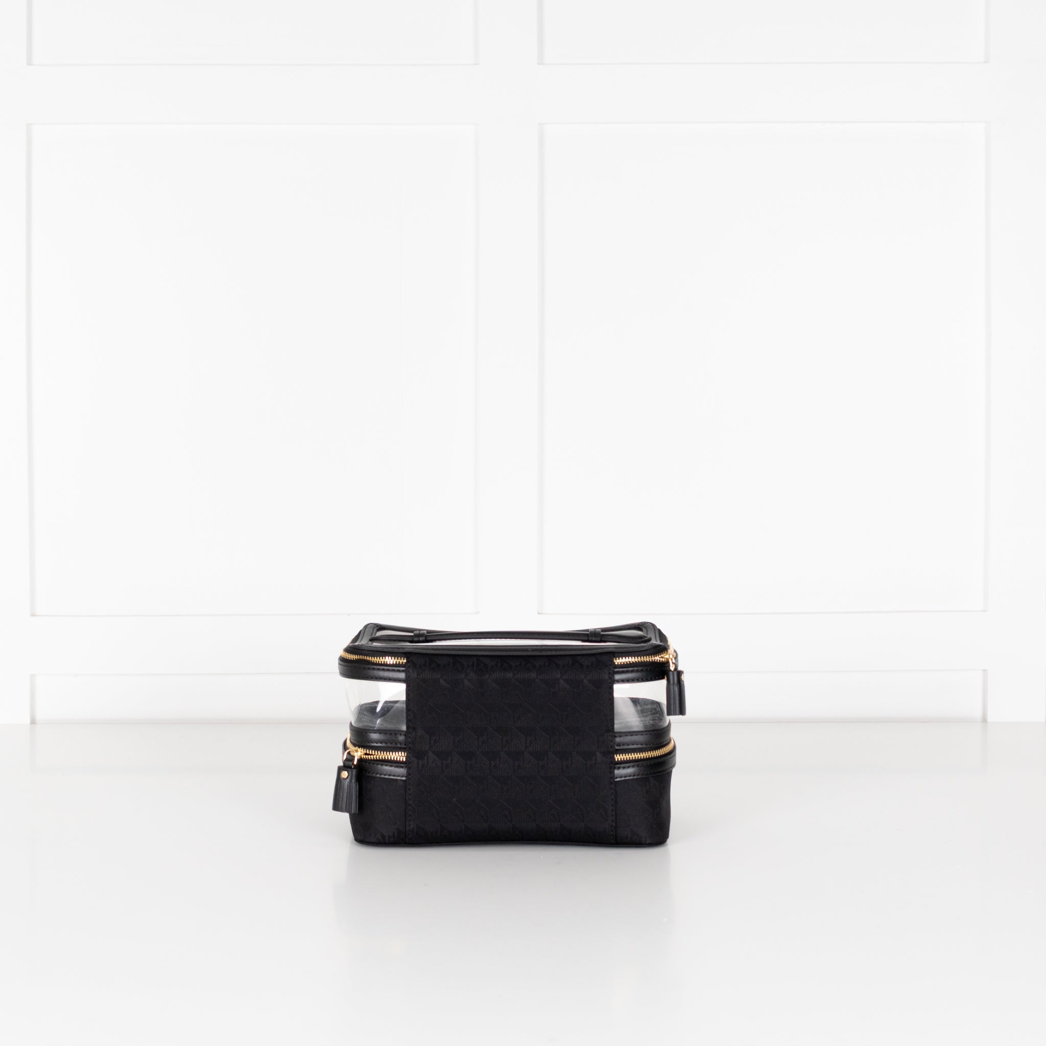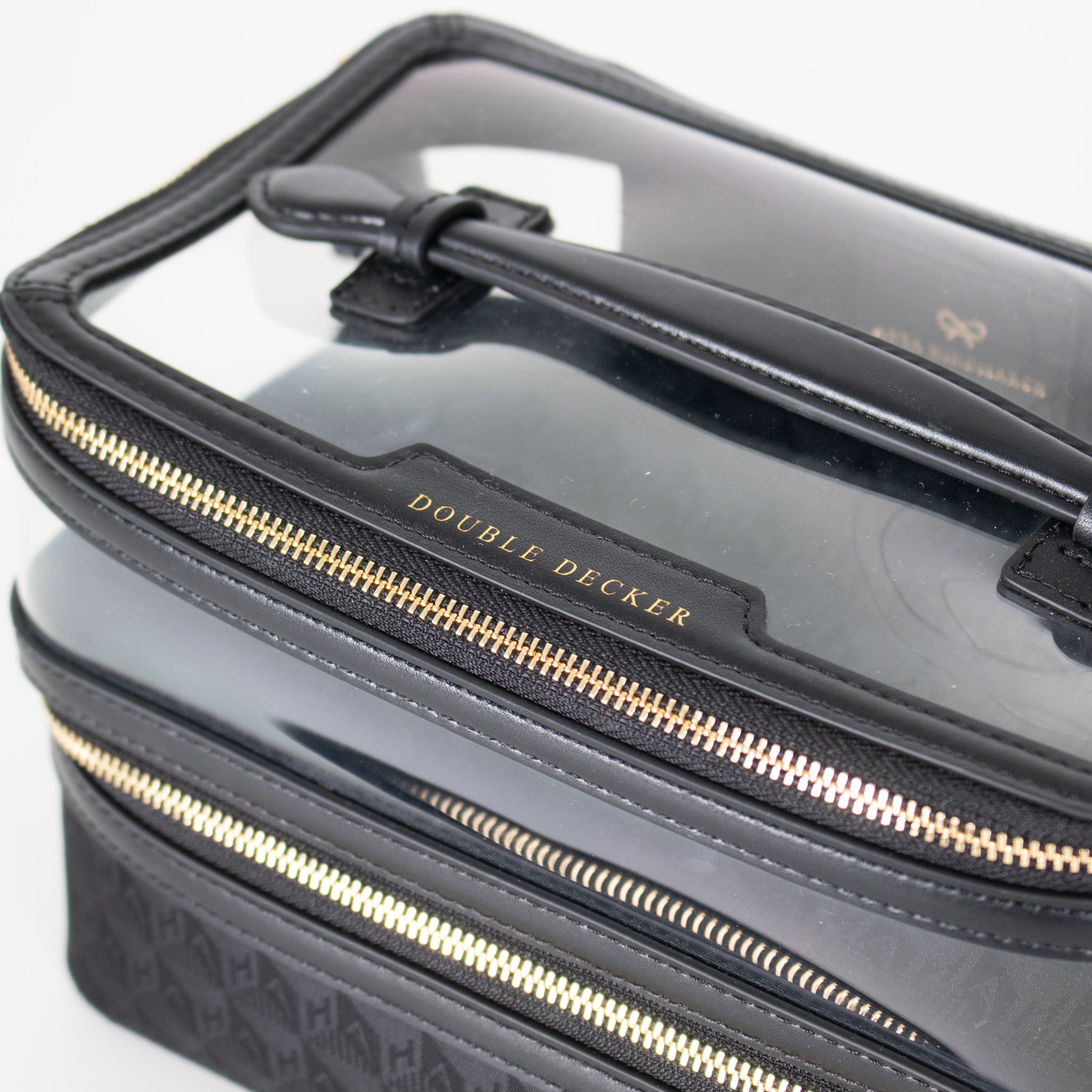 Anya Hindmarch black large make-up bag, crafted with leather trims, a transparent main body, featuring a touch-down design, with two separate compartments, and gold hardware. The front of the bag features a written 'Double decker', the black fabric features the classic Anya Hindmarch logo print. This bag is accompanied by the original dust bag.