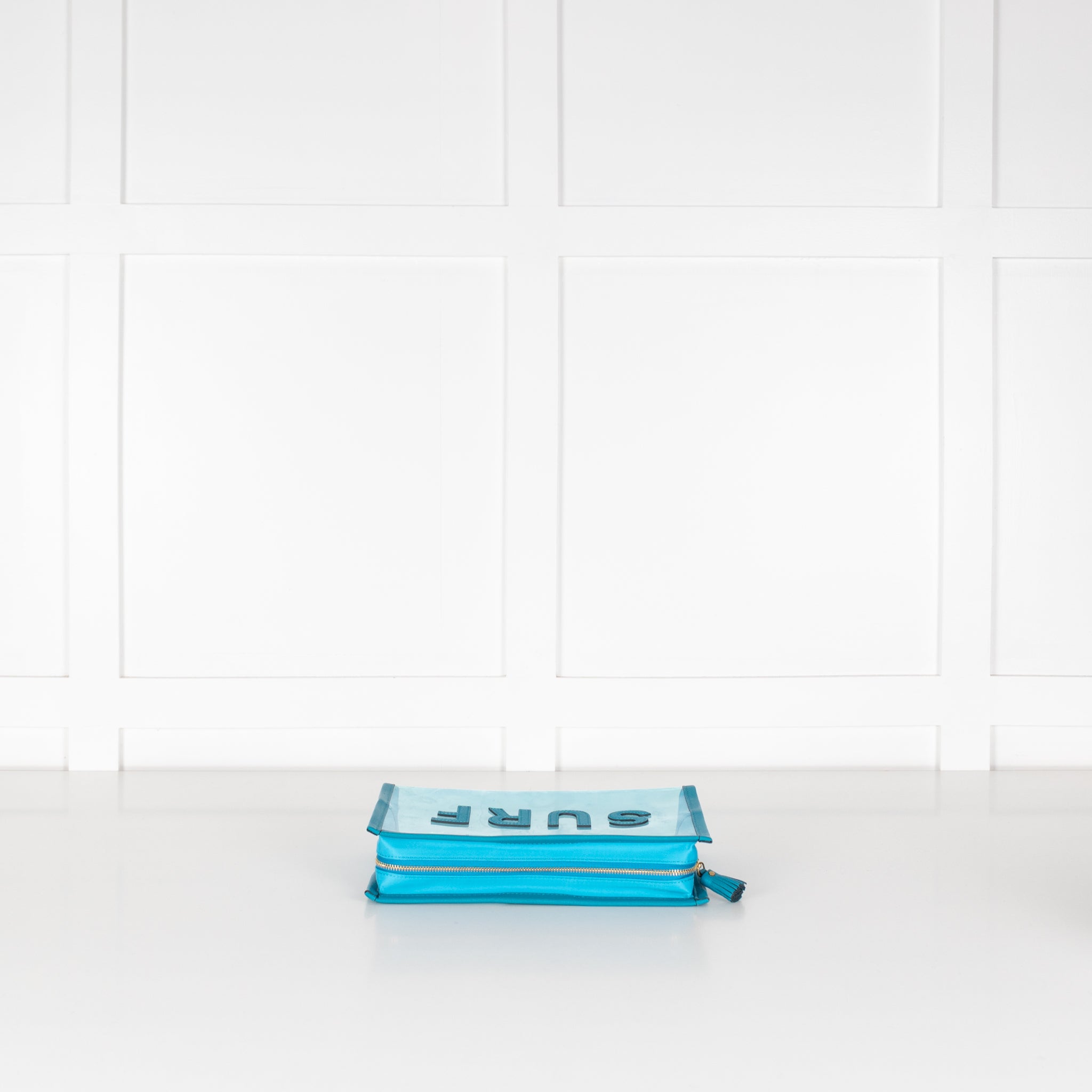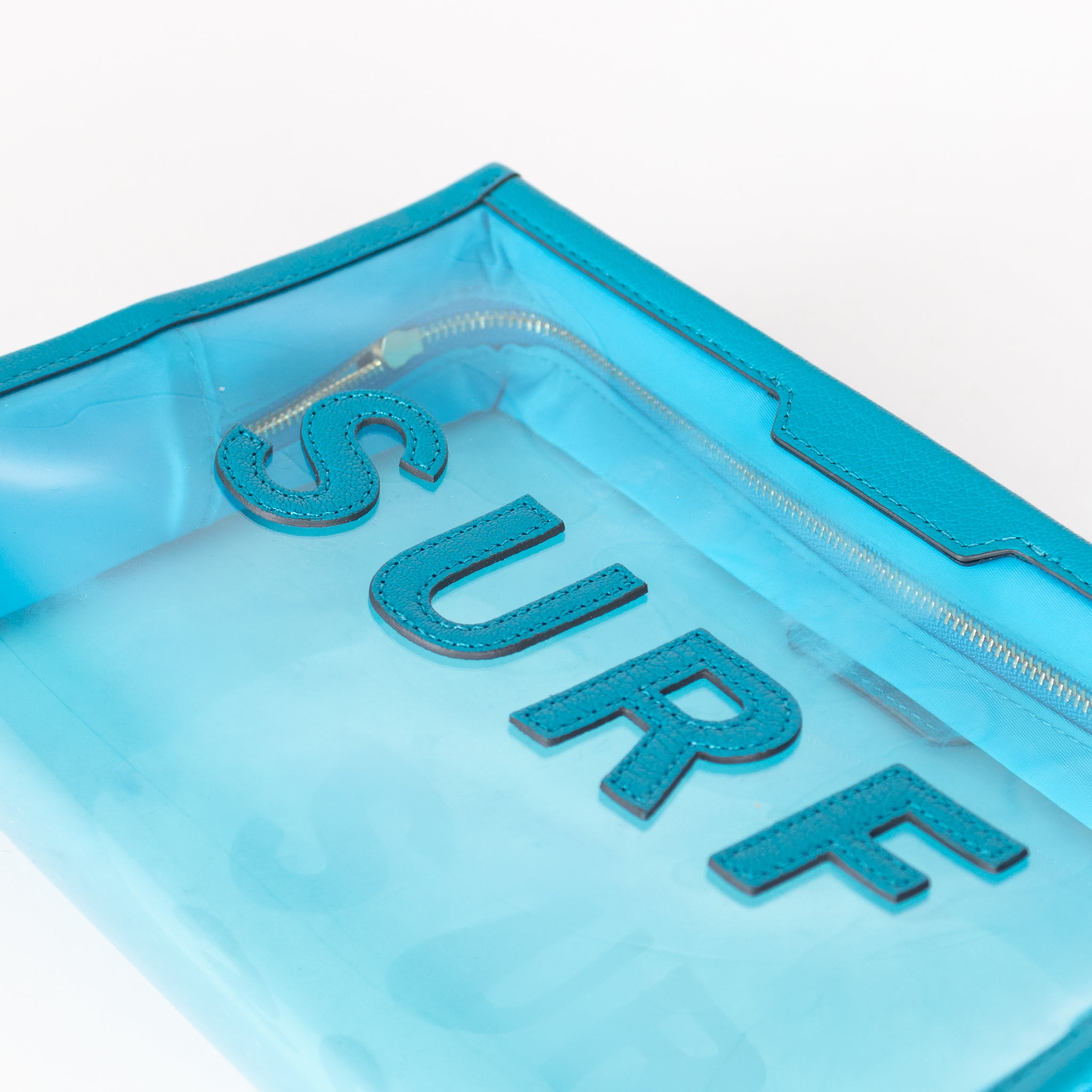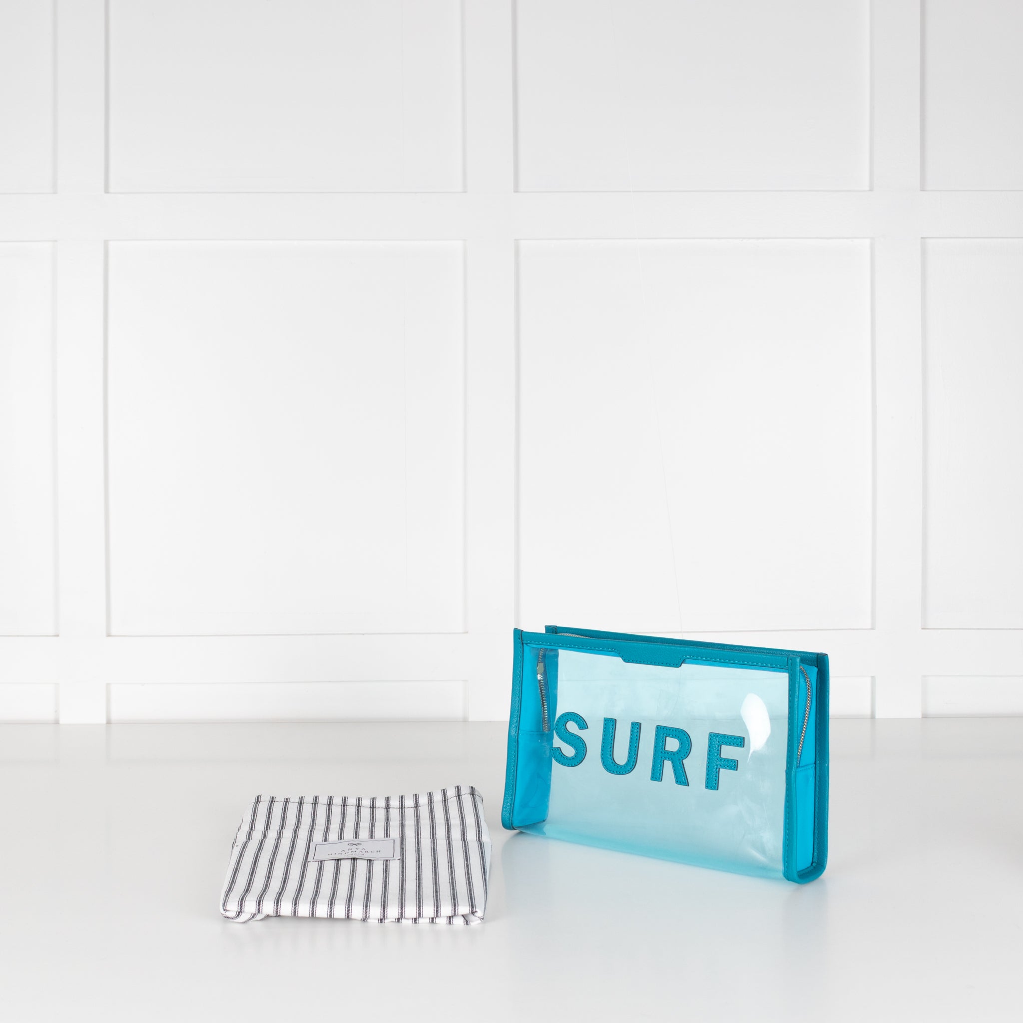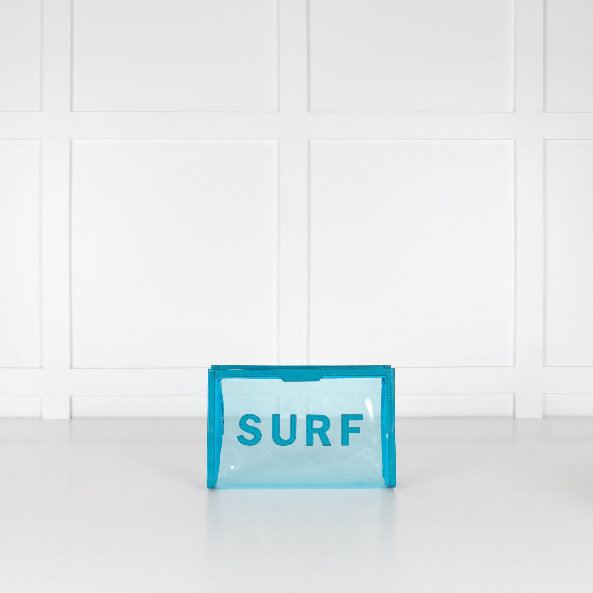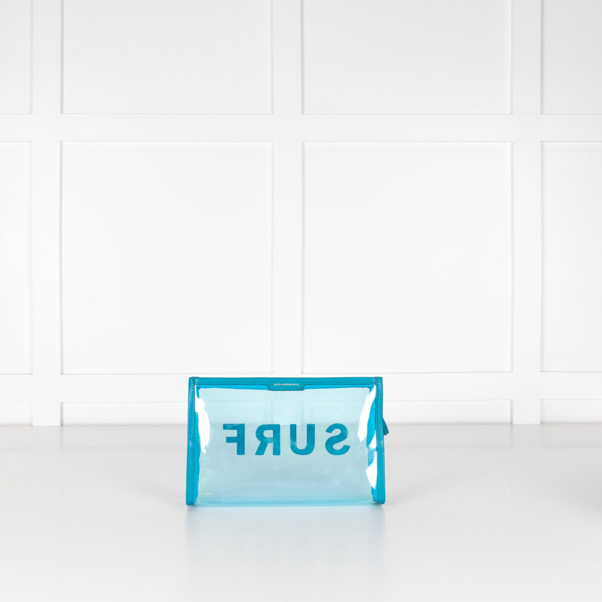 Anya Hindmarch wash bag, crafted with blue leather trims, a transparent main body, with the word 'SURF' on the front centre, in bold leather trims. This bag is accompanied by the original dust bag.