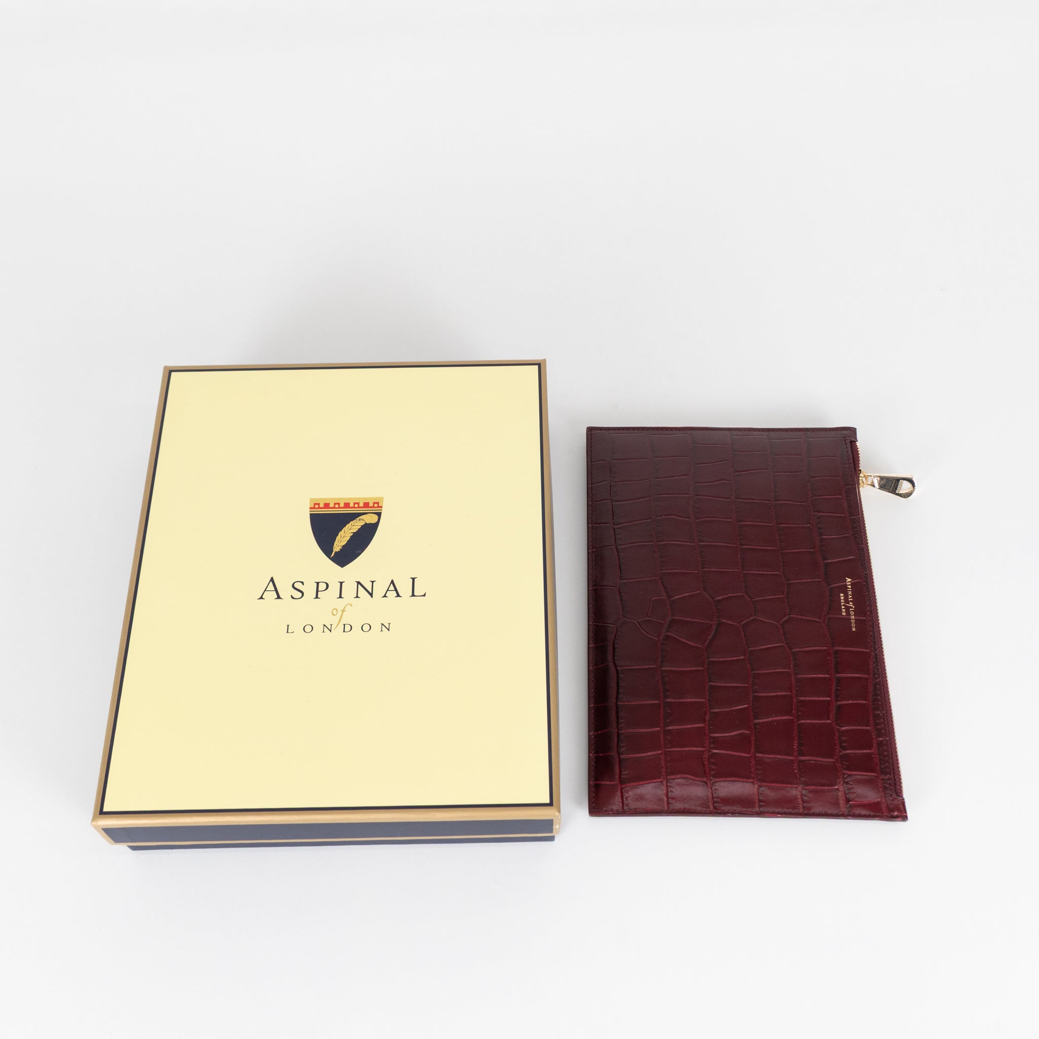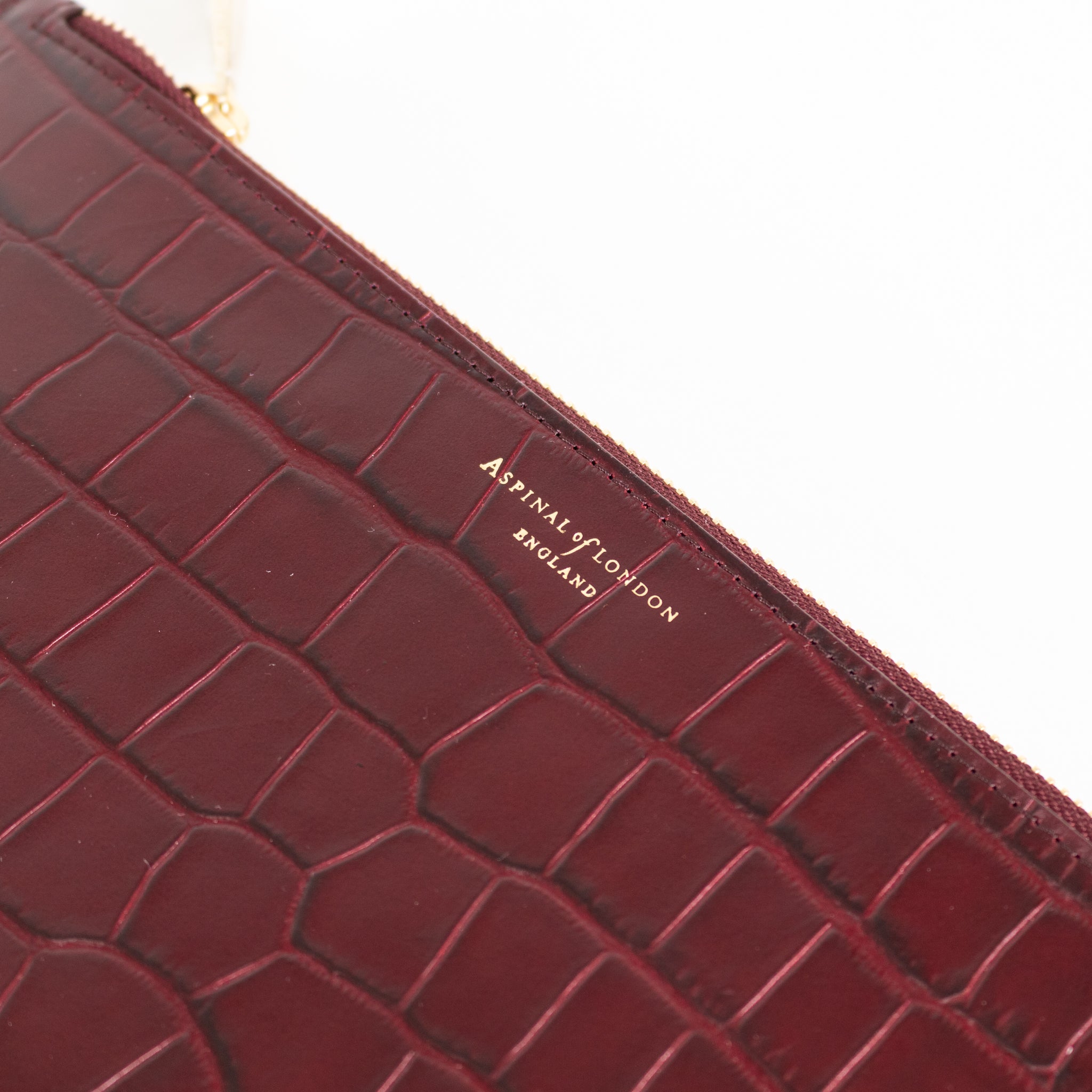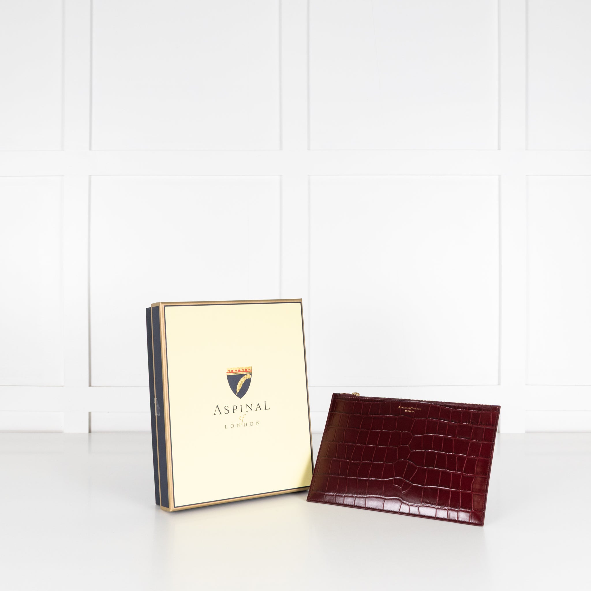 Aspinal Of London burgundy croc pochette. Handcrafted from the finest full-grain leather. Complete with a gold metal zip. The original box is included.