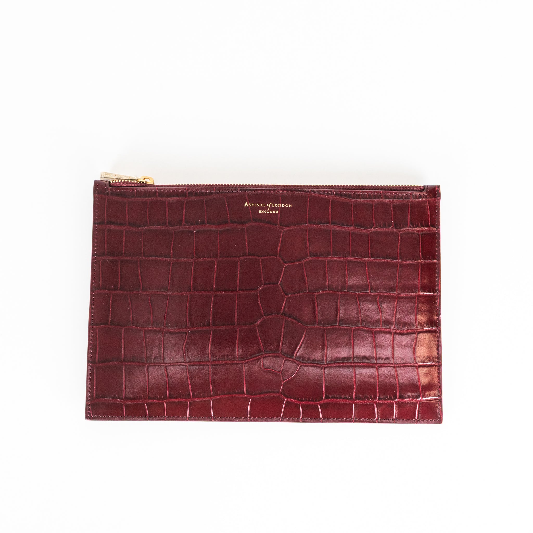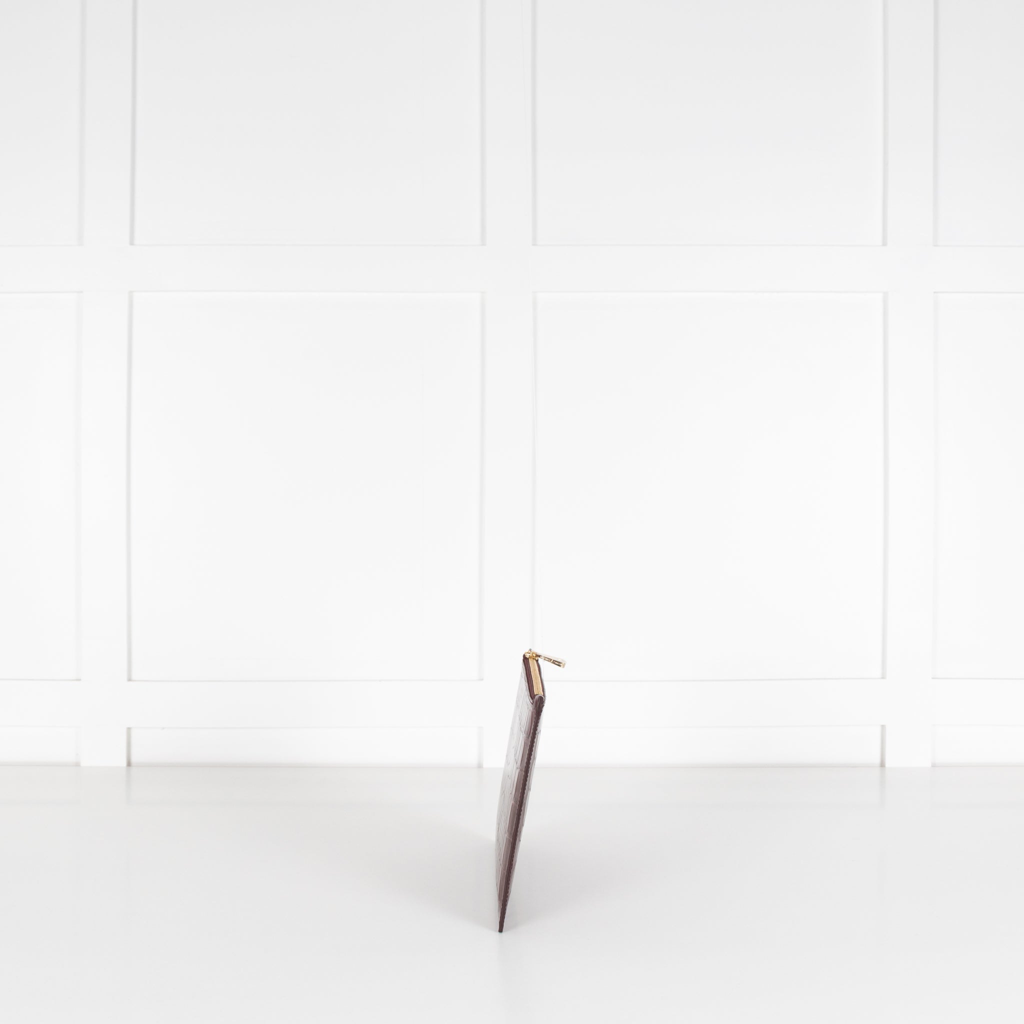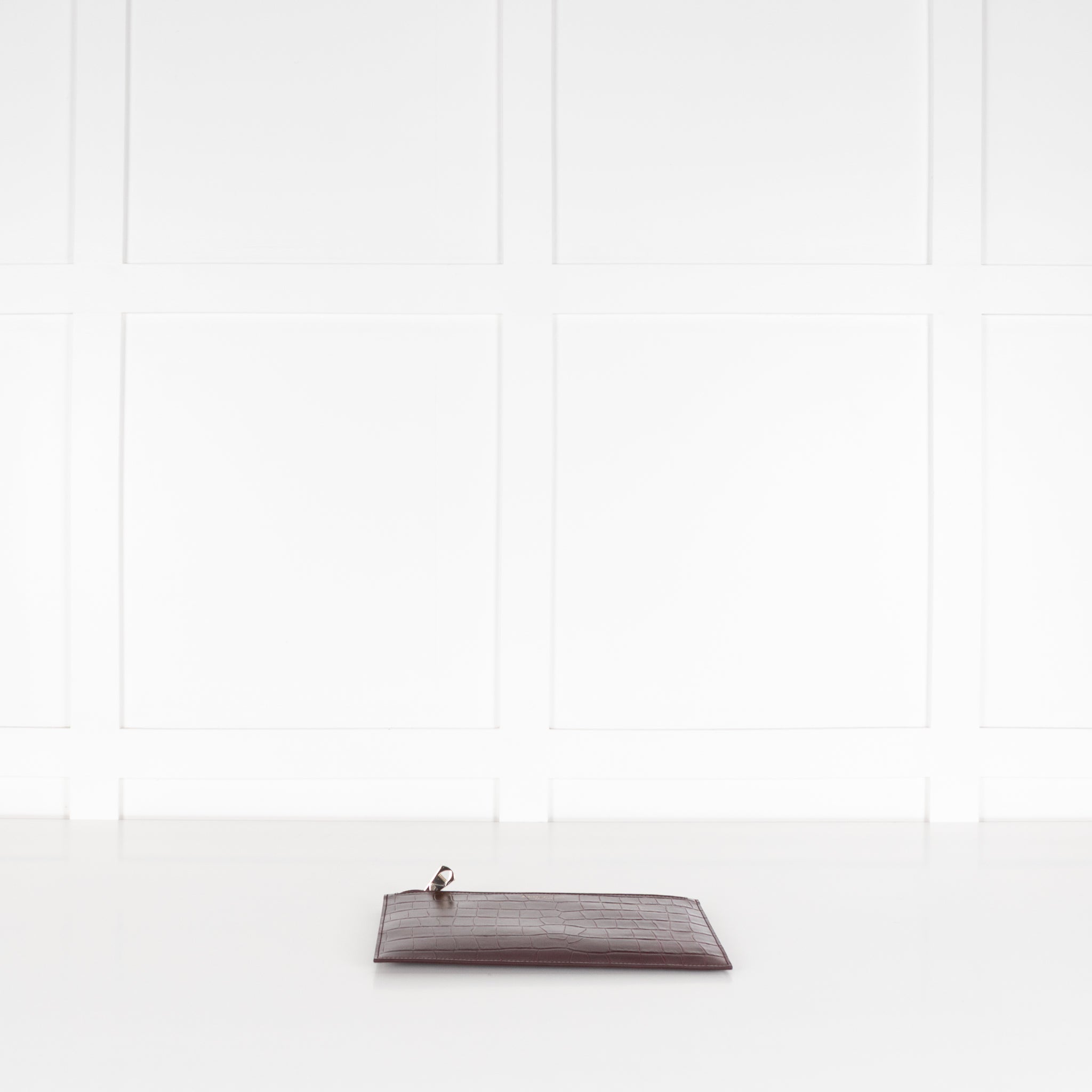 Aspinal Of London burgundy croc pochette. Handcrafted from the finest full-grain leather. Complete with a gold metal zip. The original box is included.