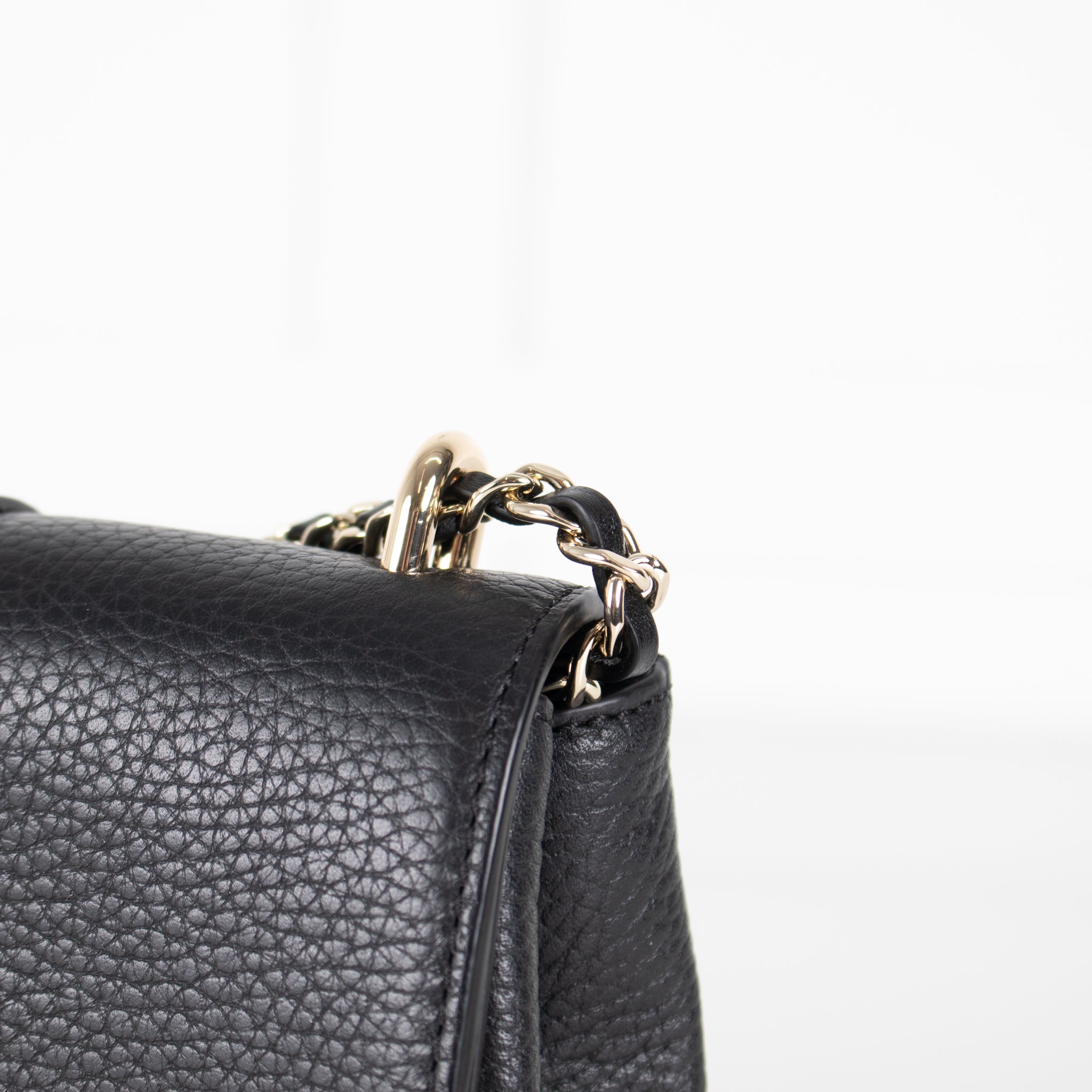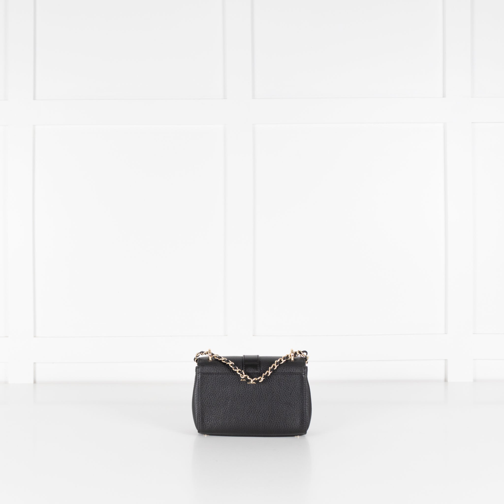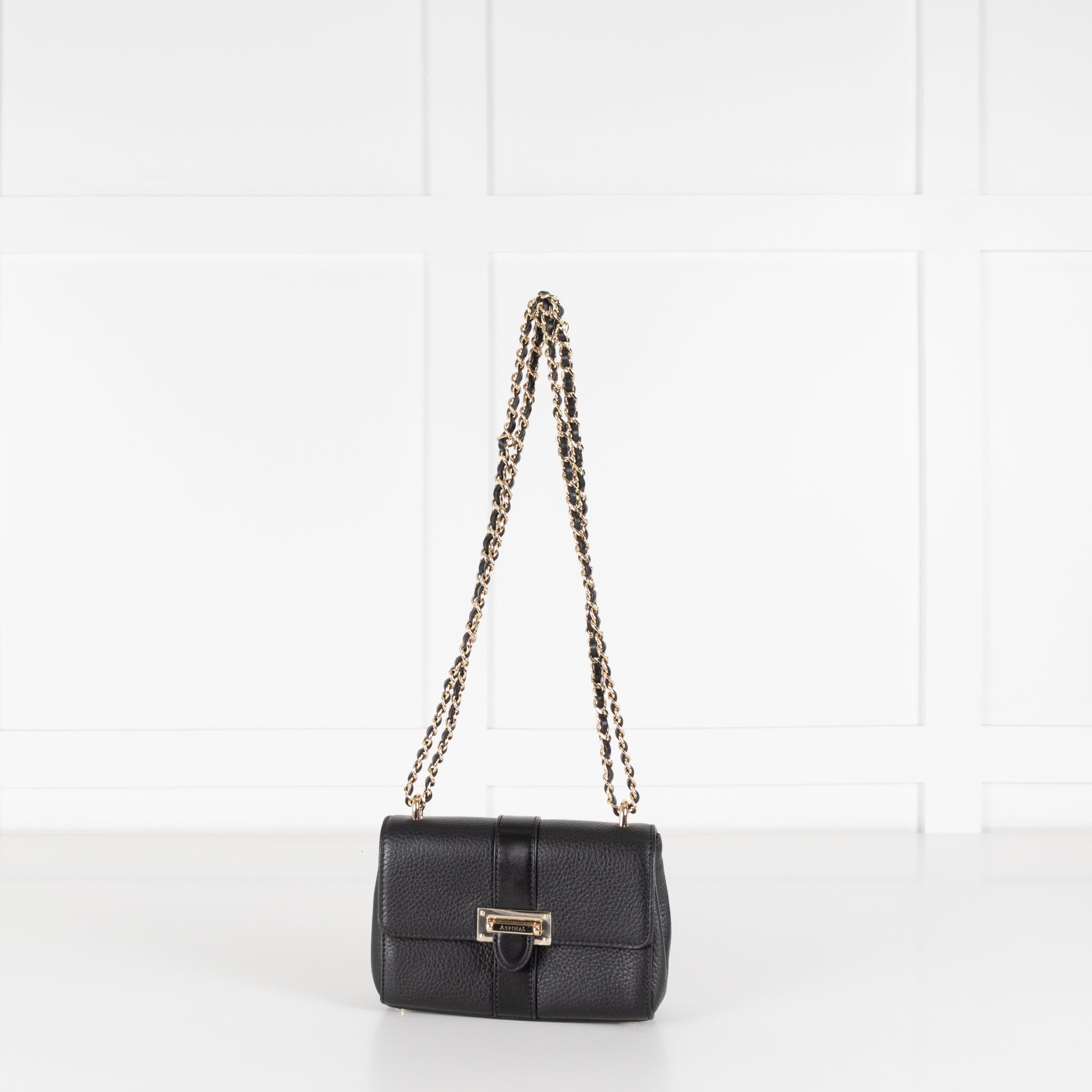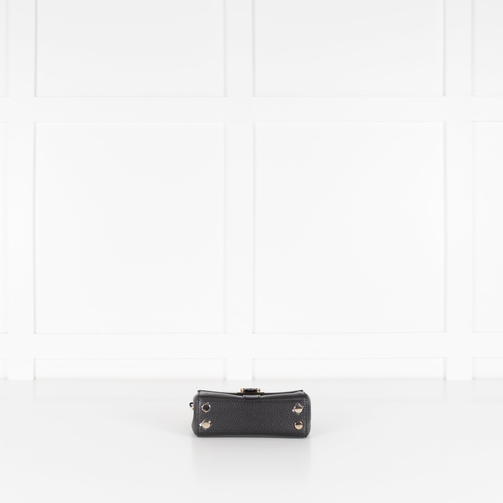 Aspinal of London micro black 'Lottie Bag'. Handcrafted from the finest full-grain Italian Pebble leather and lined in Italian grosgrain. Including the iconic letterbox closure and leather-plaited metal chain.