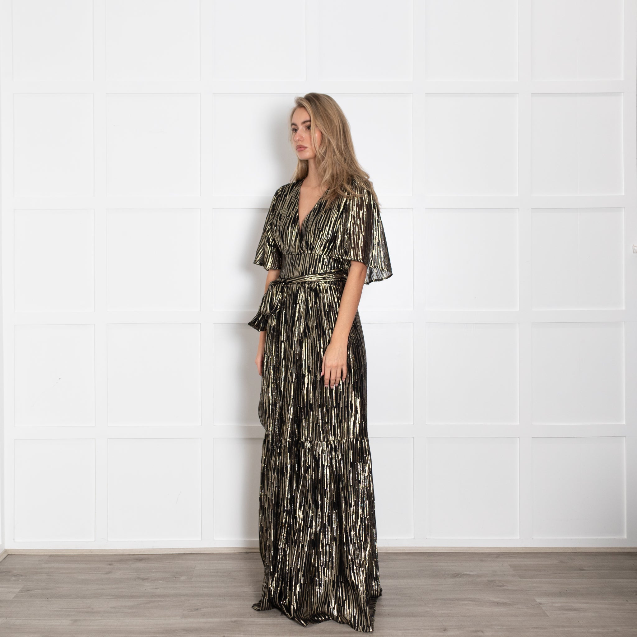 Ba&sh black long sleeve maxi dress, crafted with gold sequin exterior and a V-neckline design. The dress features a belted design and a side leg slit.