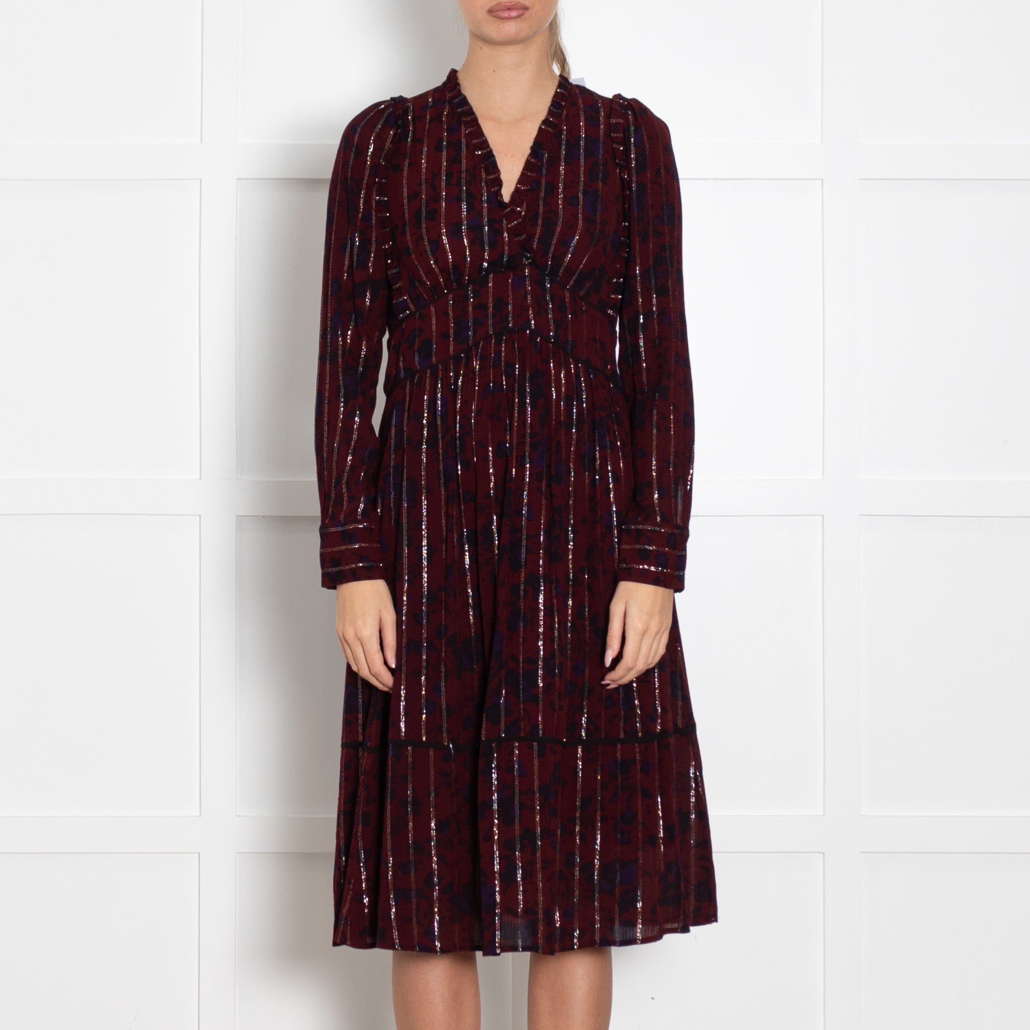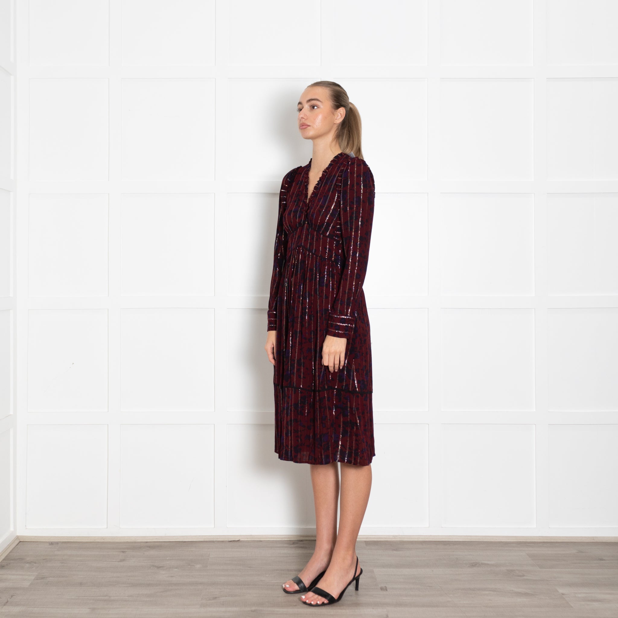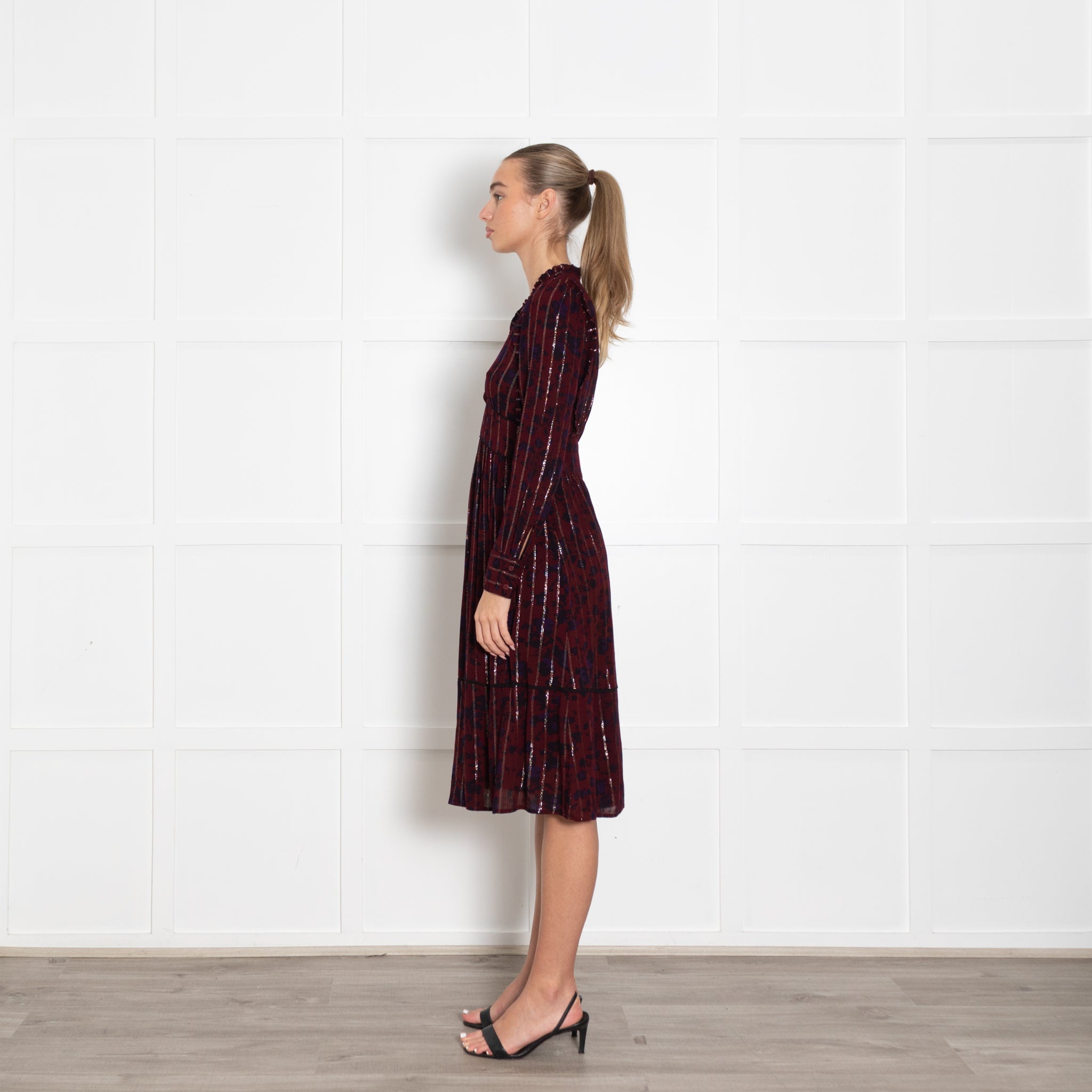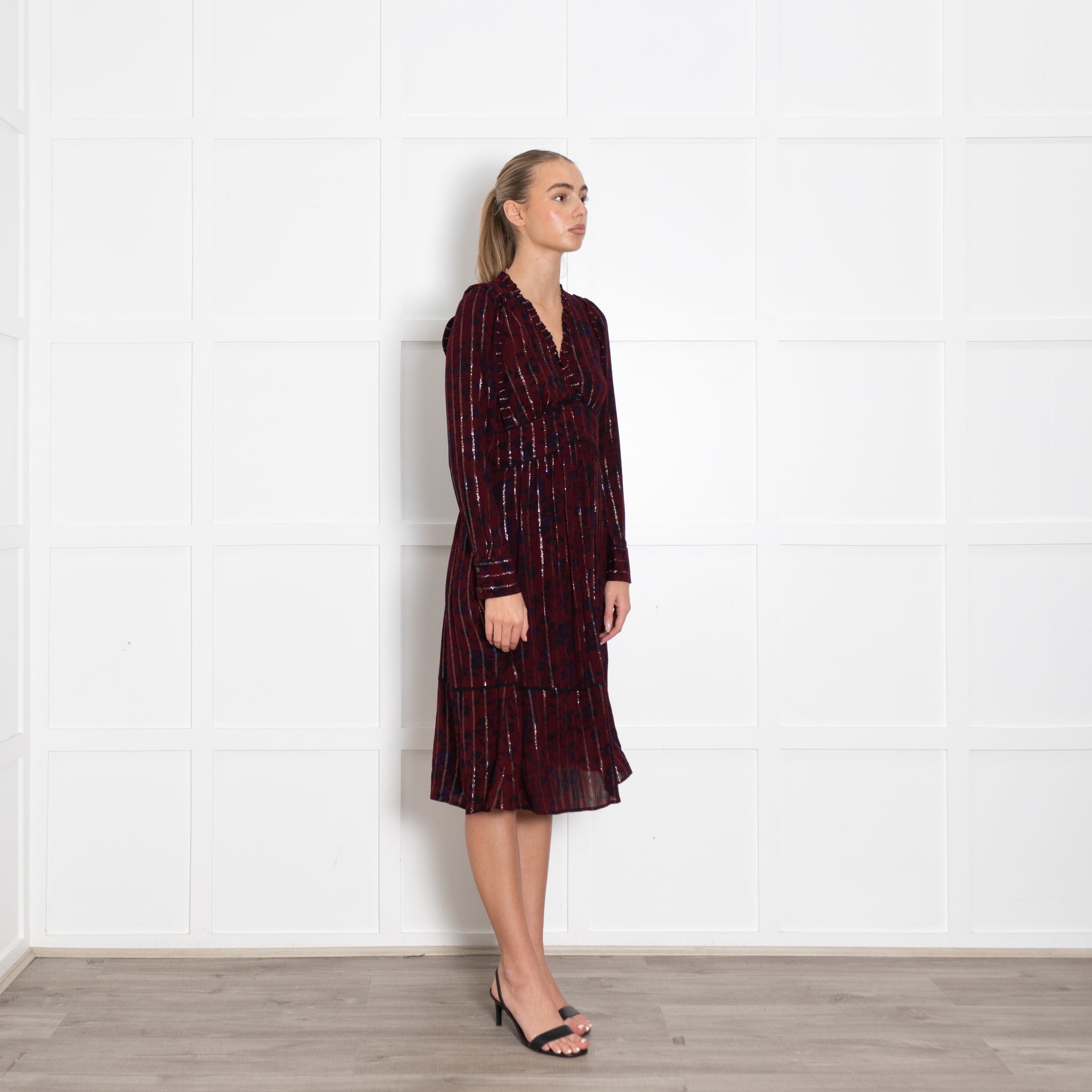 BA&SH Burgundy Navy Silver Tread Midi Long Sleeve Dress