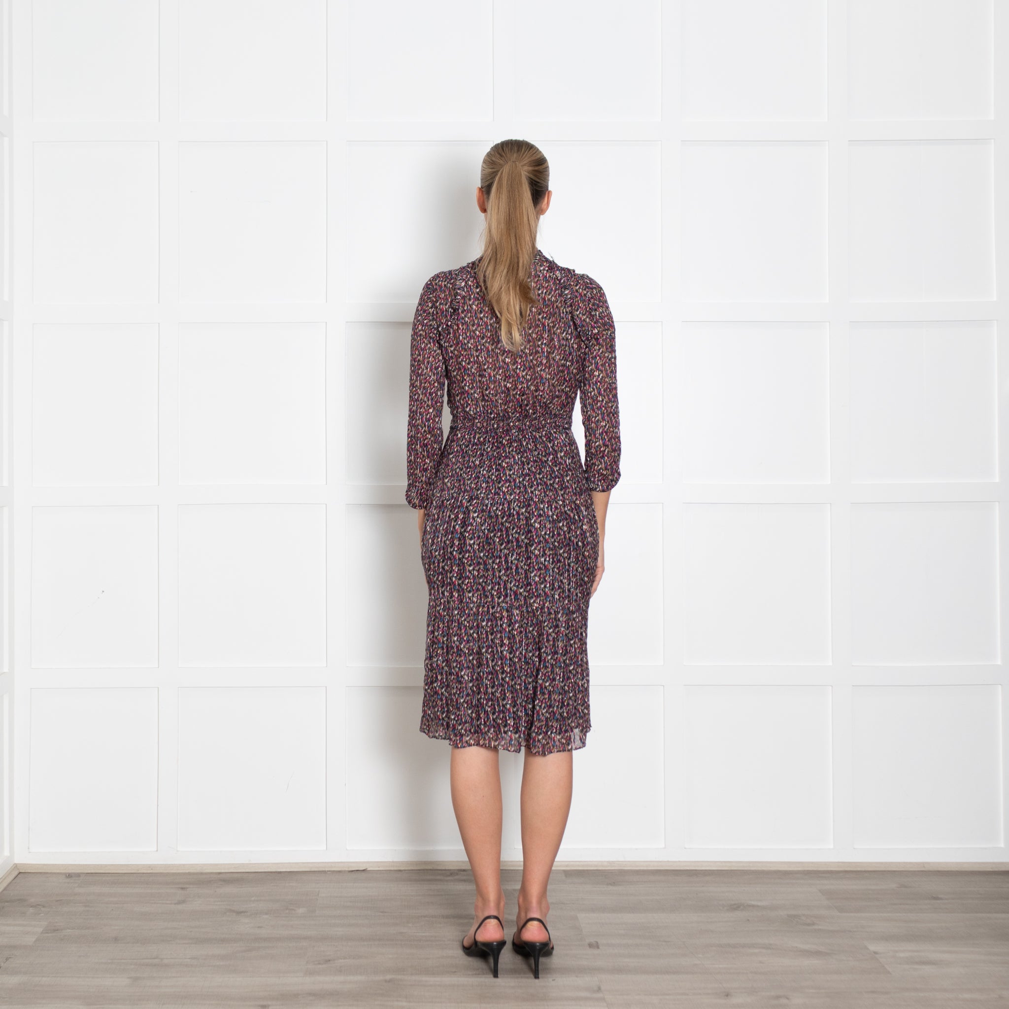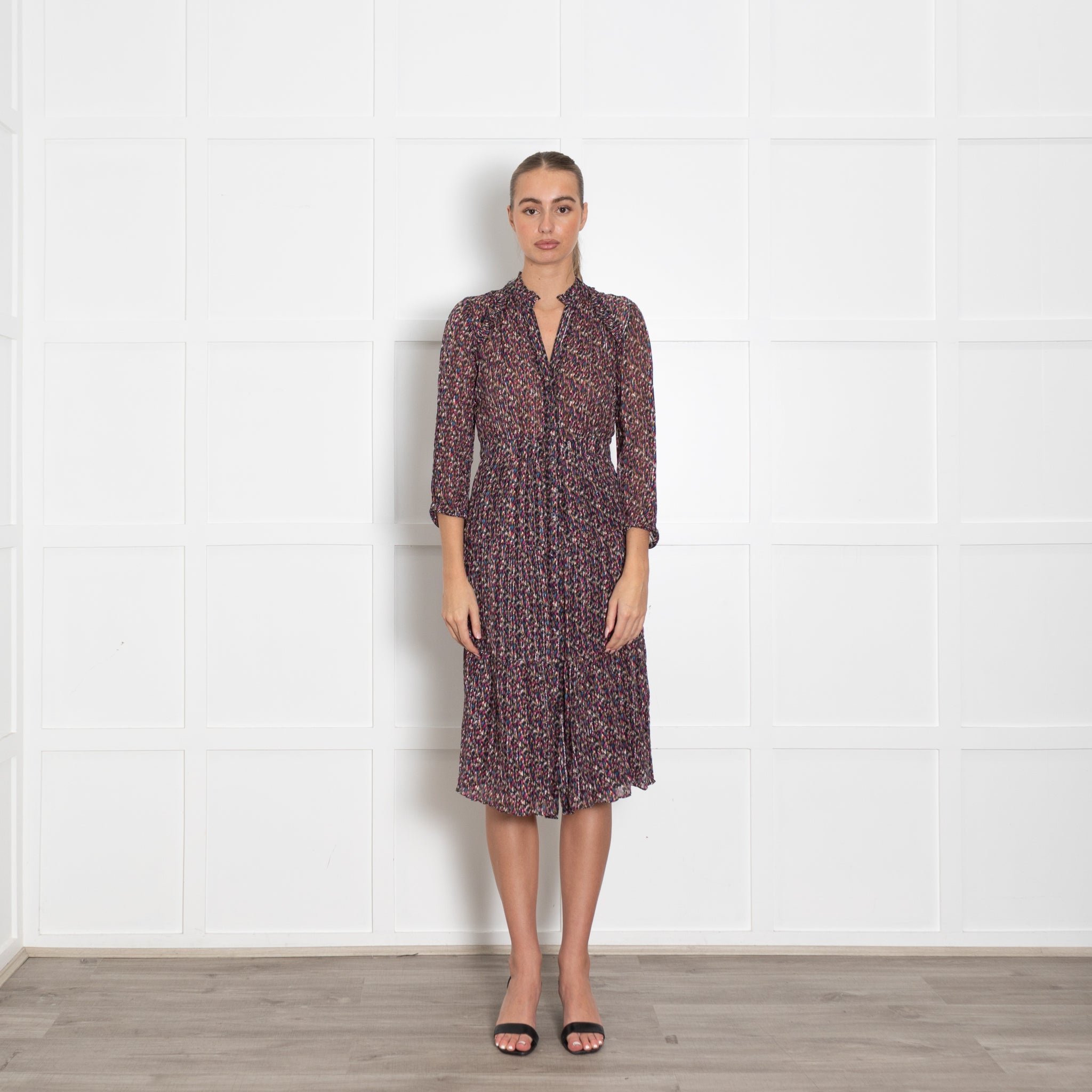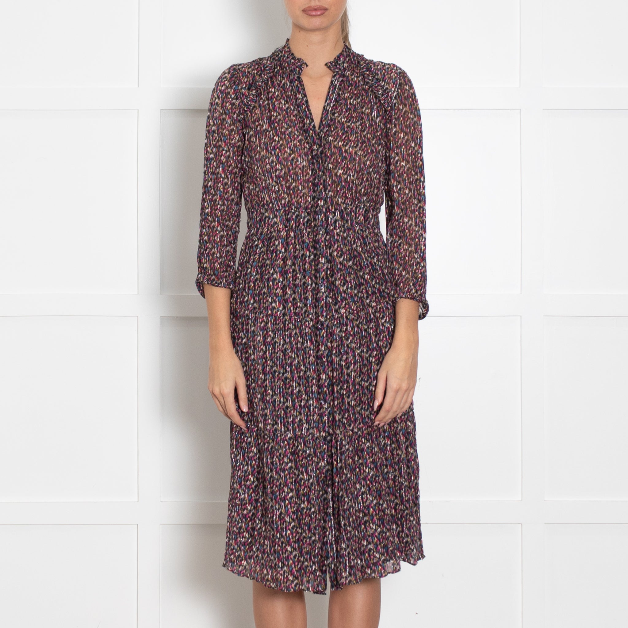 BA&SH Multicoloured Button Up Midi Long Sleeve Frilled Dress