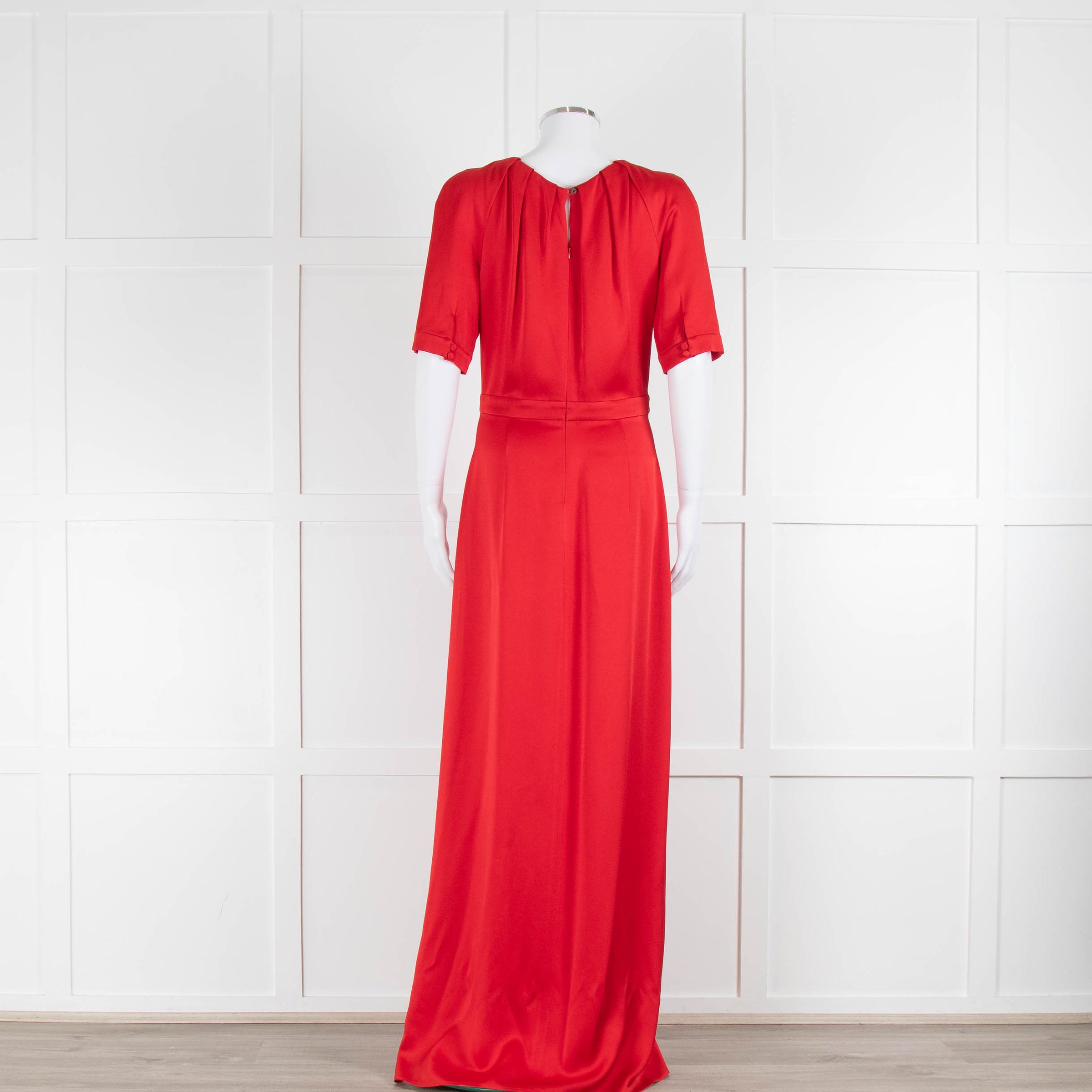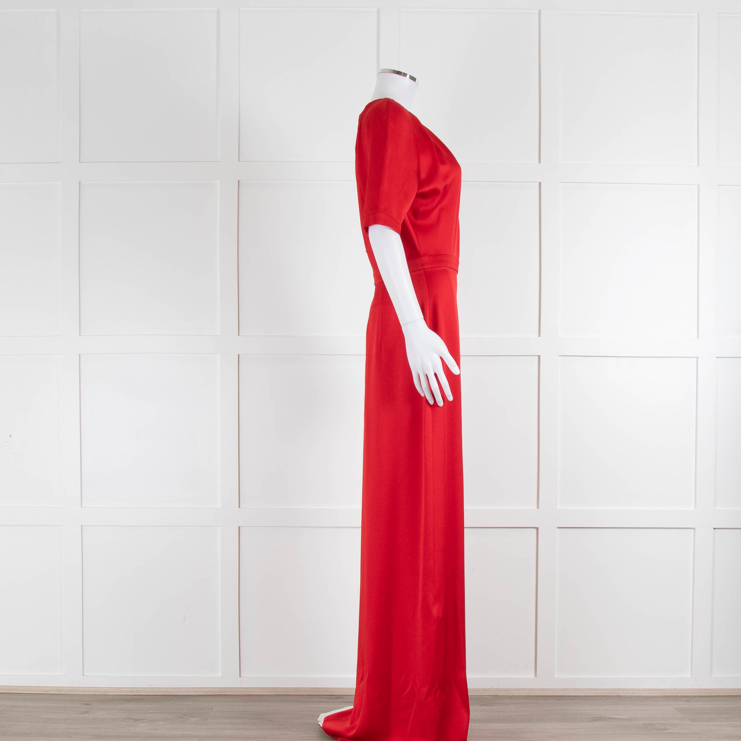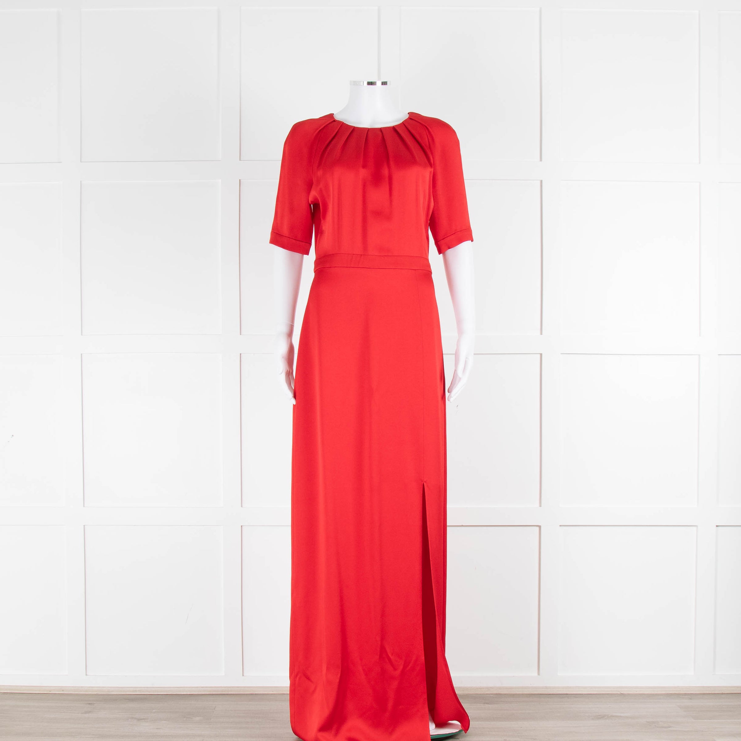Beulah red satin evening dress with pleating into the round neckline, short raglan sleeves, invisible rear zip fastener, and front split on the left side of the dress.