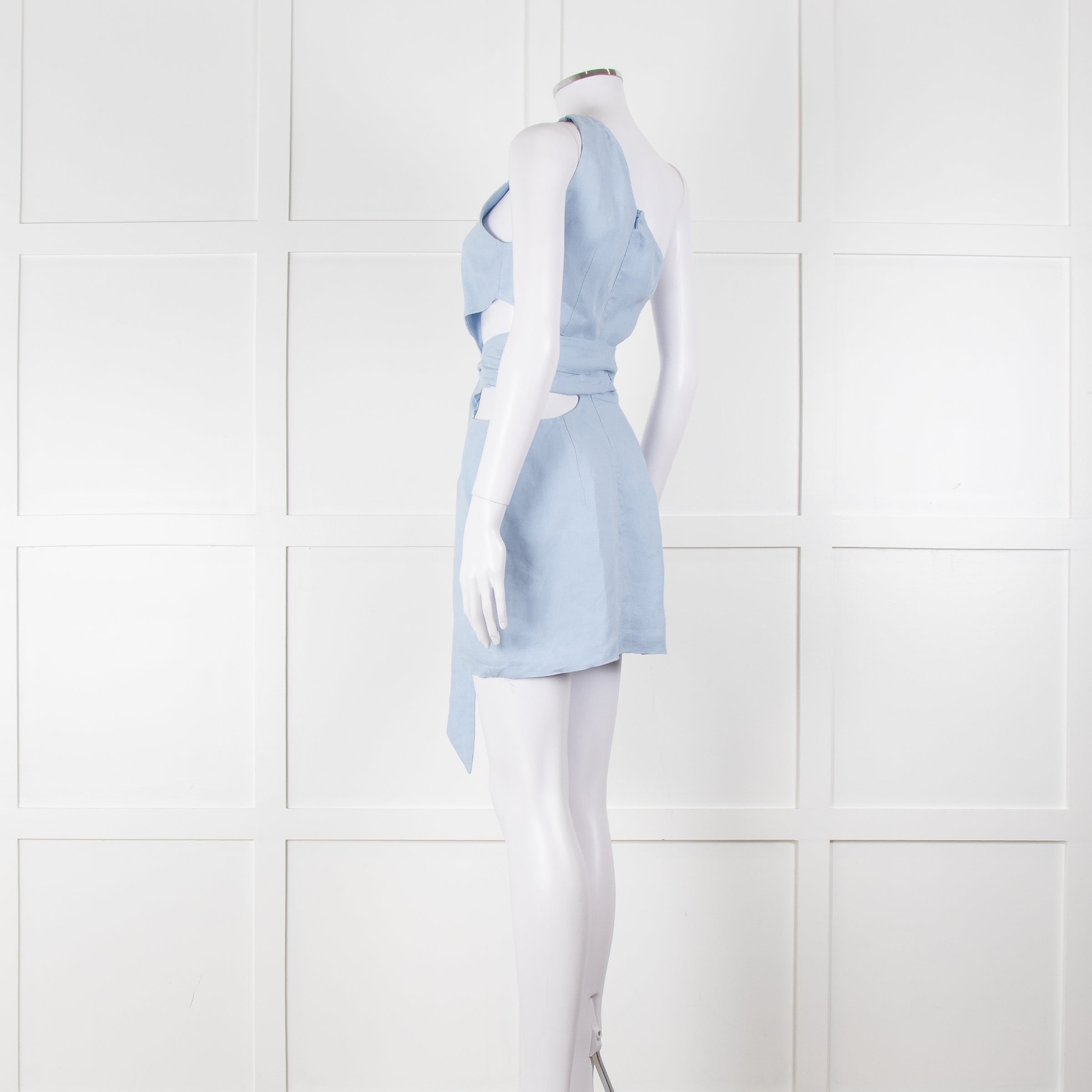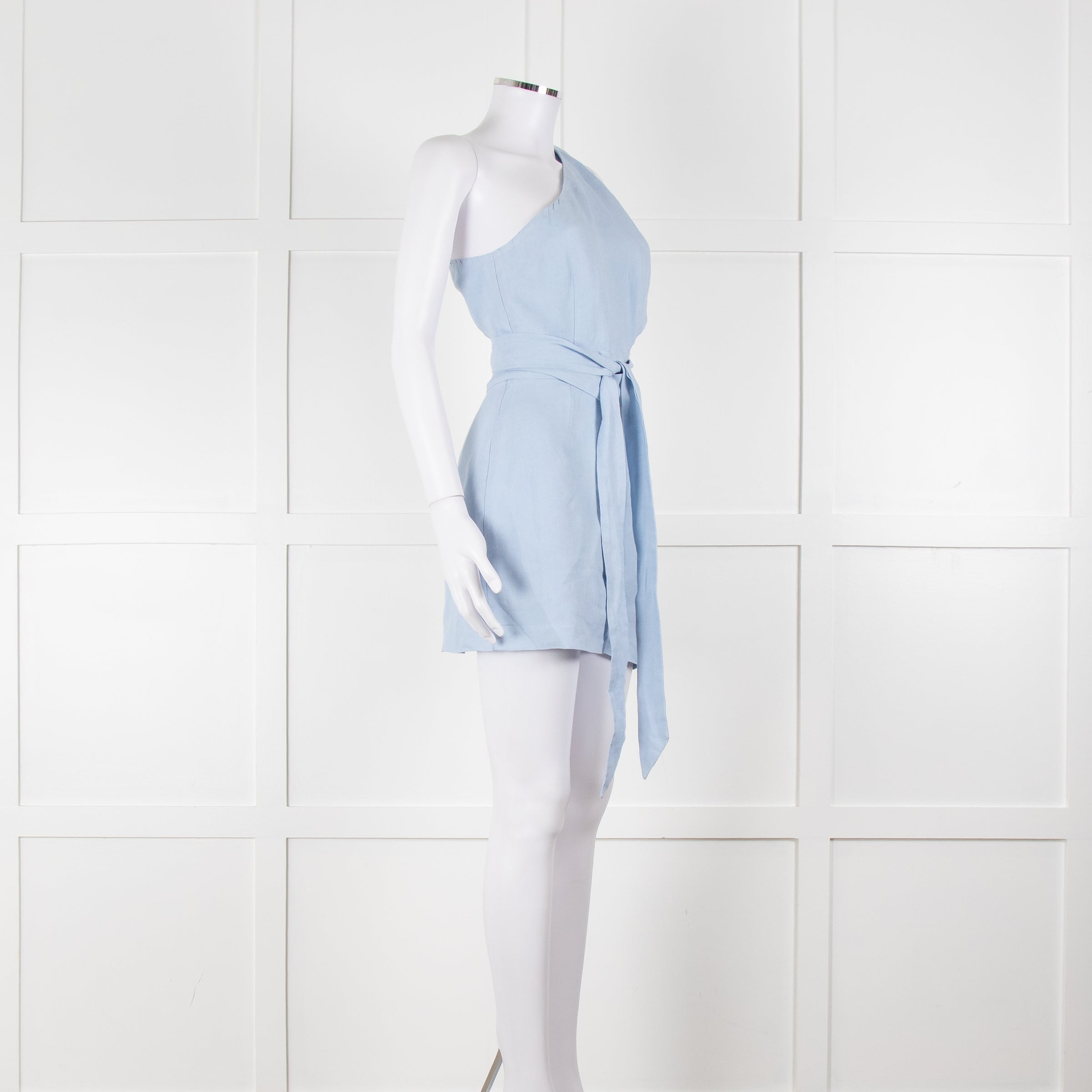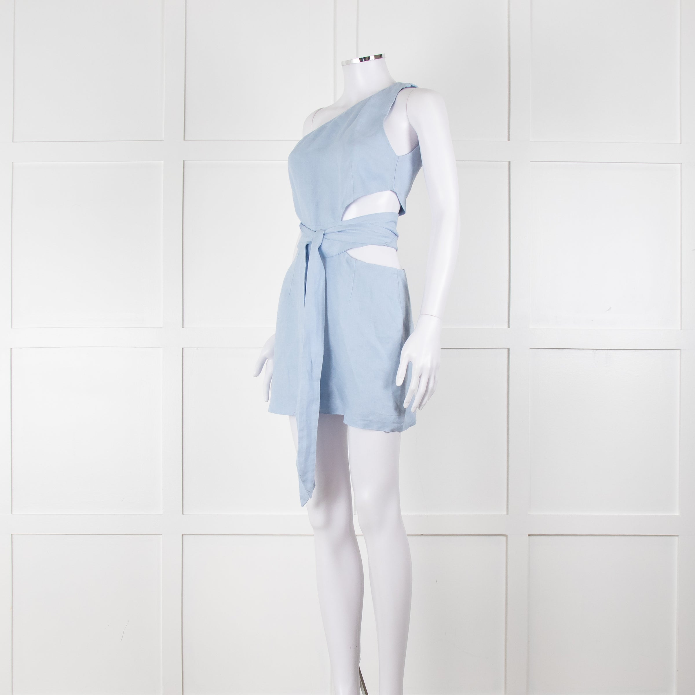 Bondi Born sky blue linen one-shoulder mini dress with a tonal tie and cut-out waist. This dress has concealed rear zip closure.